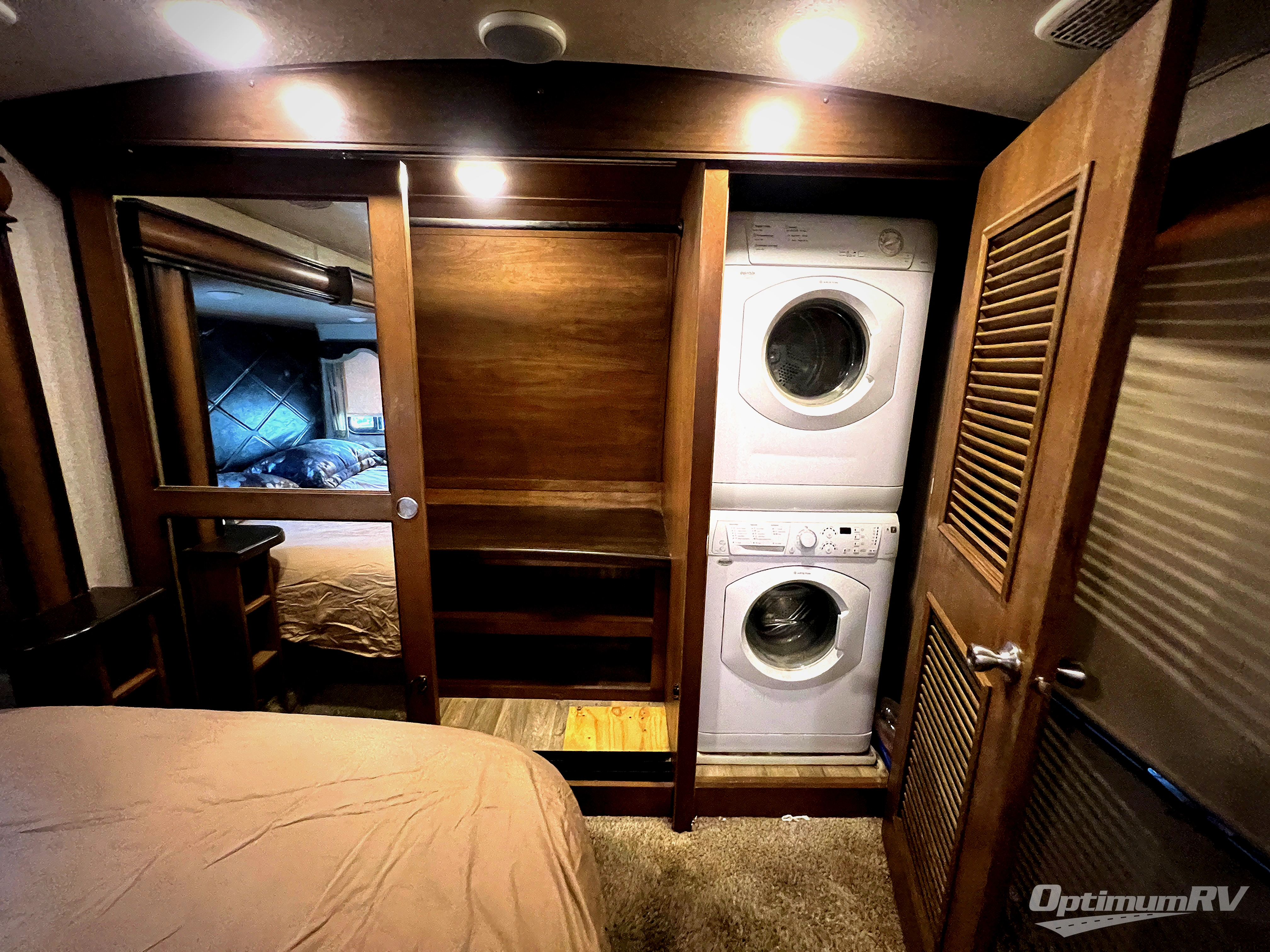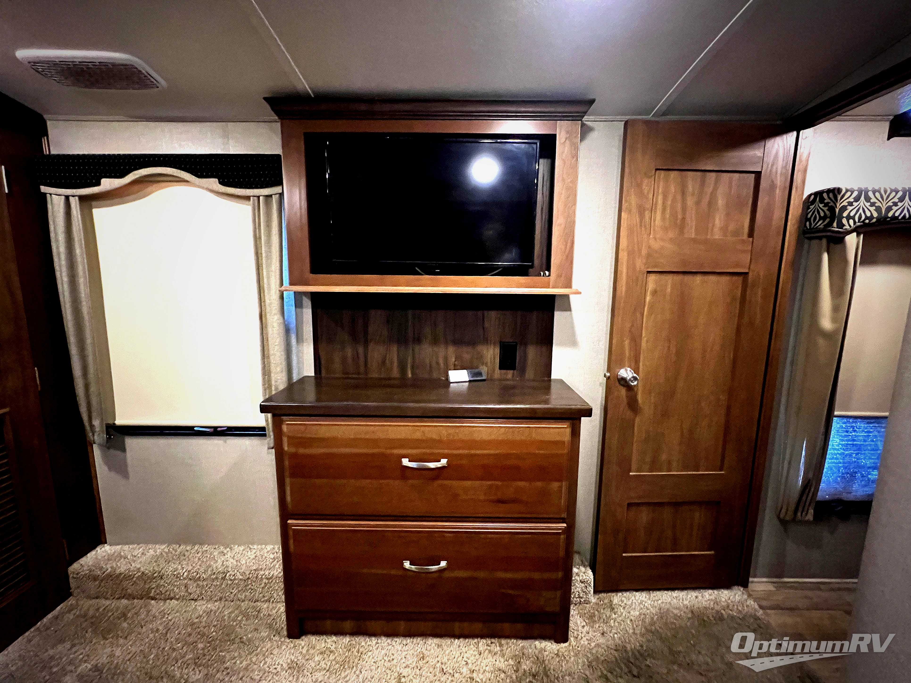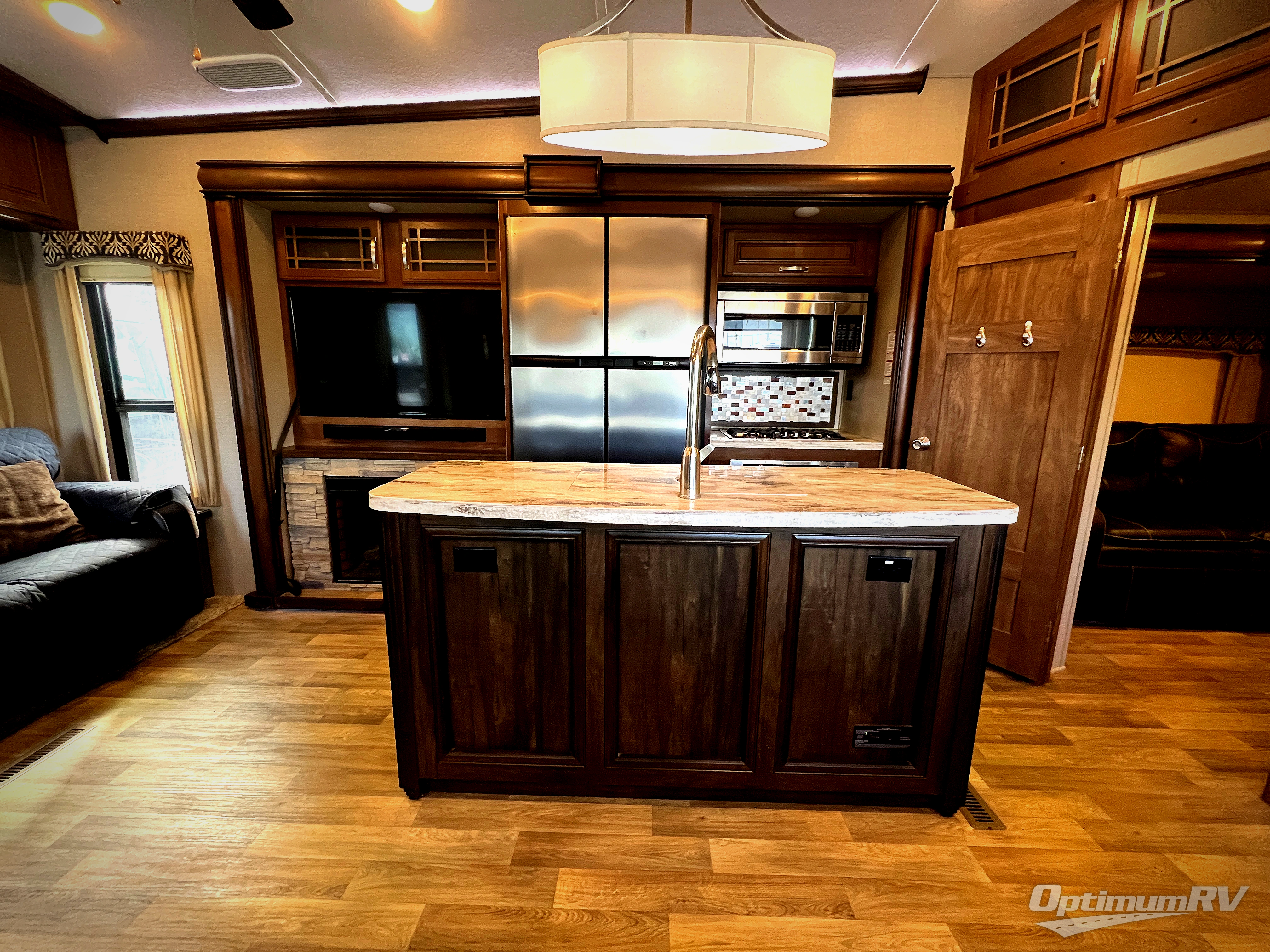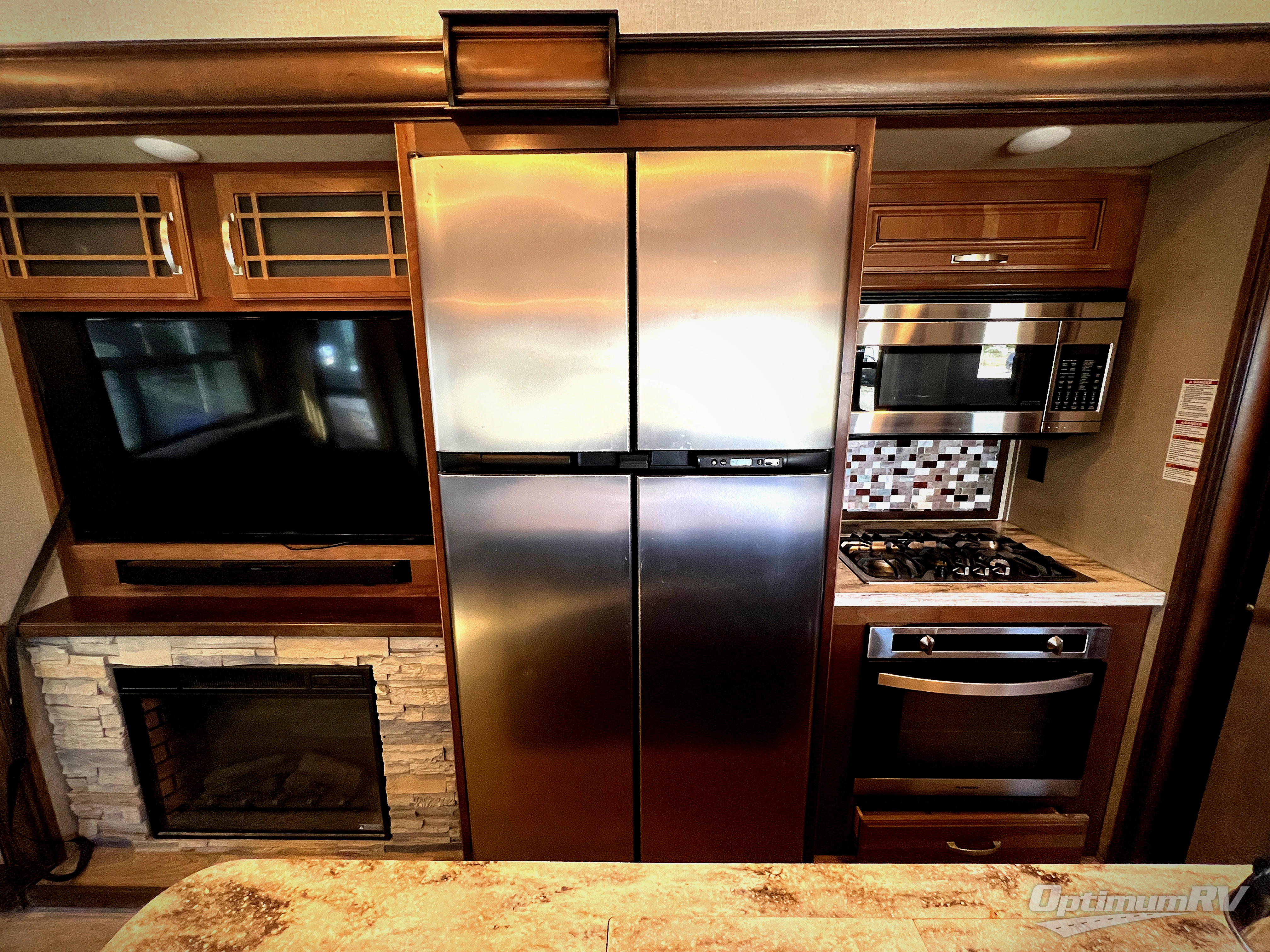 Opposite the door side find a HD TV with fireplace, a refrigerator, and three burner range with overhead convection microwave oven slide out. A corner pantry is featured just off the slide near the range. There is also a convenient center island with double sinks. You will easily be able to prepare and cook food for your family here.