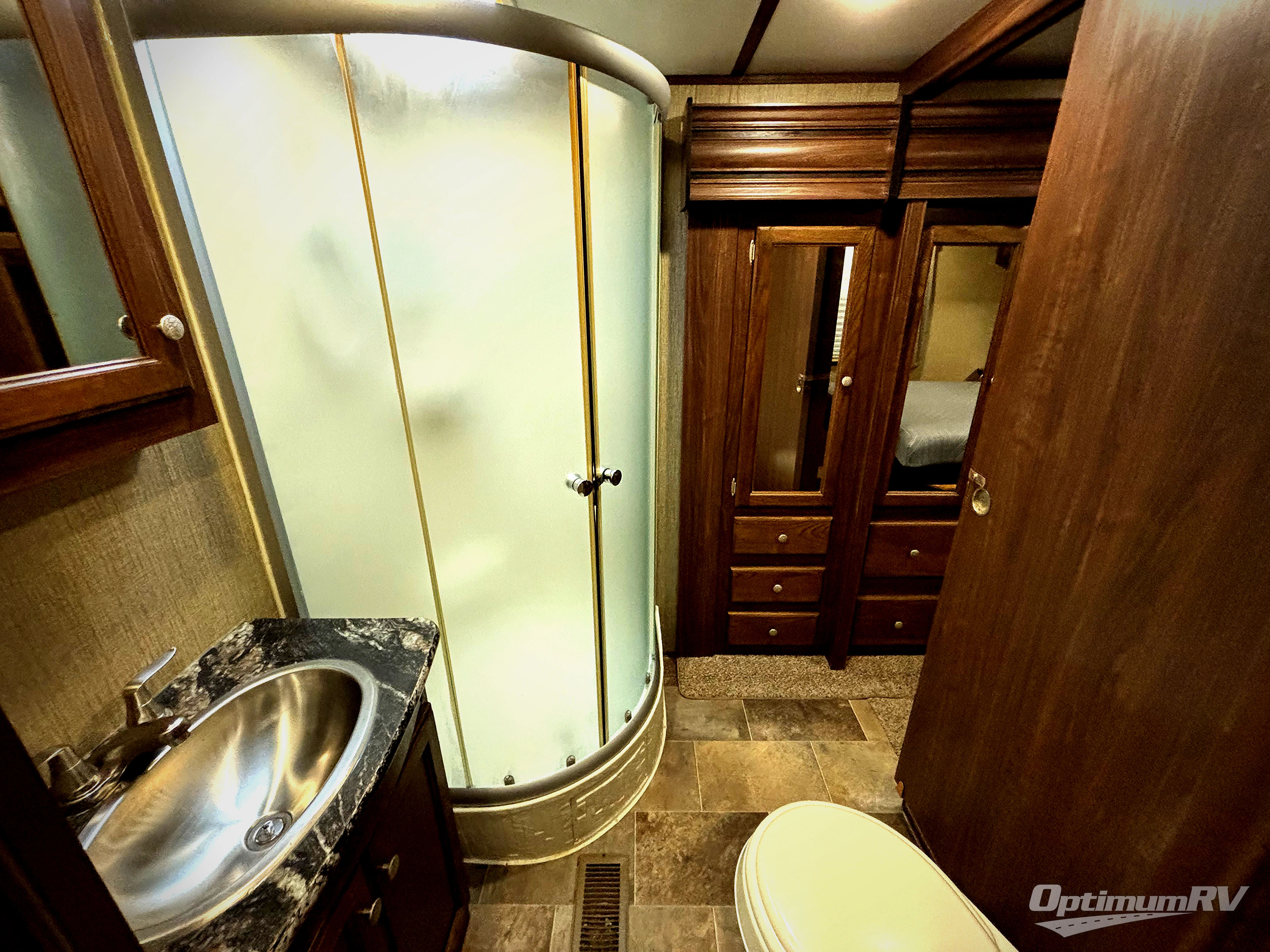 To the right of the entry door find a full bath including a radius shower, toilet and sink, plus a sliding second door that leads into the front master bedroom as well as allows access to the wardrobe slide out.