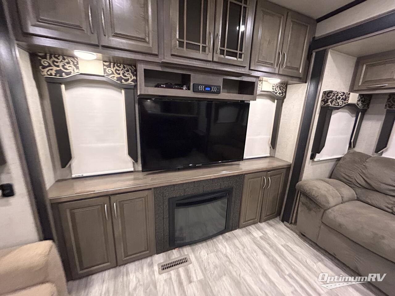 Inside this fifth wheel you will love how open and spacious this model feels. In the kitchen/living area there are slides on either side. The first slide has a free-standing table and chairs. The second slide has counter space, a three burner range, refrigerator, and a pantry. Adjacent to the slide there is a large pantry for your non-perishables plus a hutch. A larger hutch is along the interior wall on the opposite side. And don't forget about the kitchen island which has a double sink, surrounded by counter space which makes food prep a breeze.
