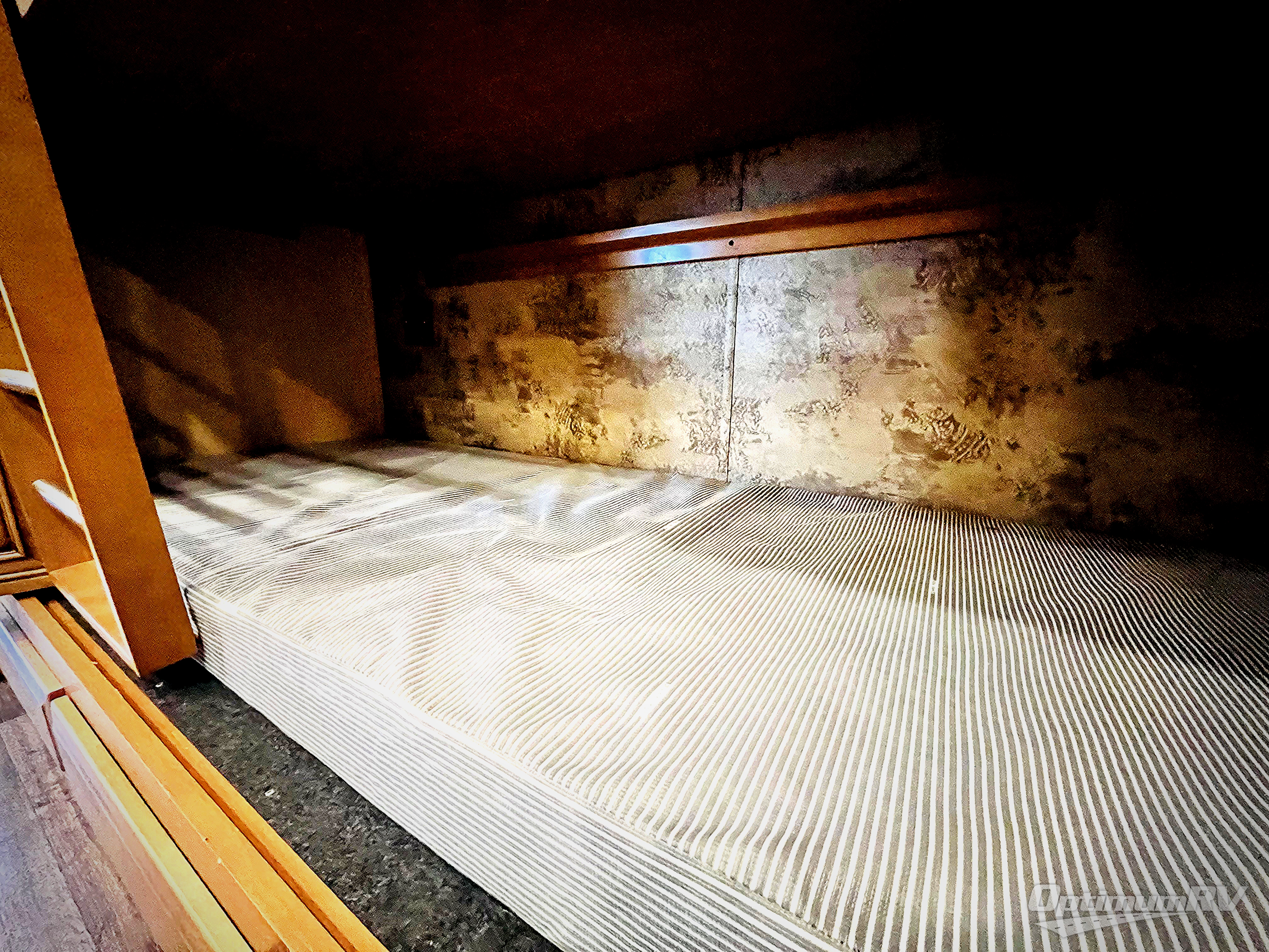 Across from the bathroom the slide out has a large wardrobe, flip up bunk, and in the bedroom you will find two shirt wardrobes, a chest of drawers, and an overhead cabinet. Across from the slide in the room there is an additional slide out with a queen bed, overhead cabinet, and two nightstands, plus so much more!