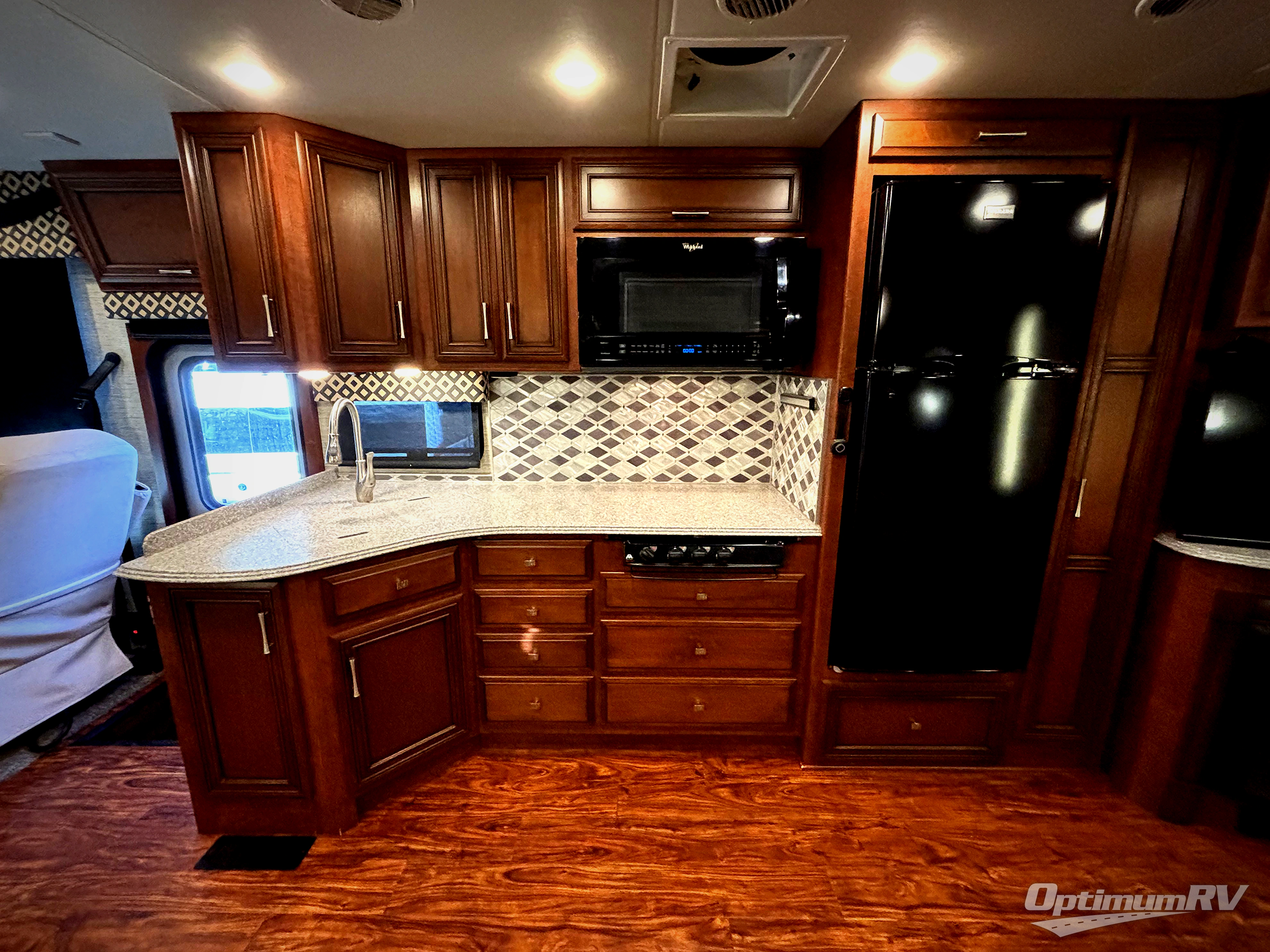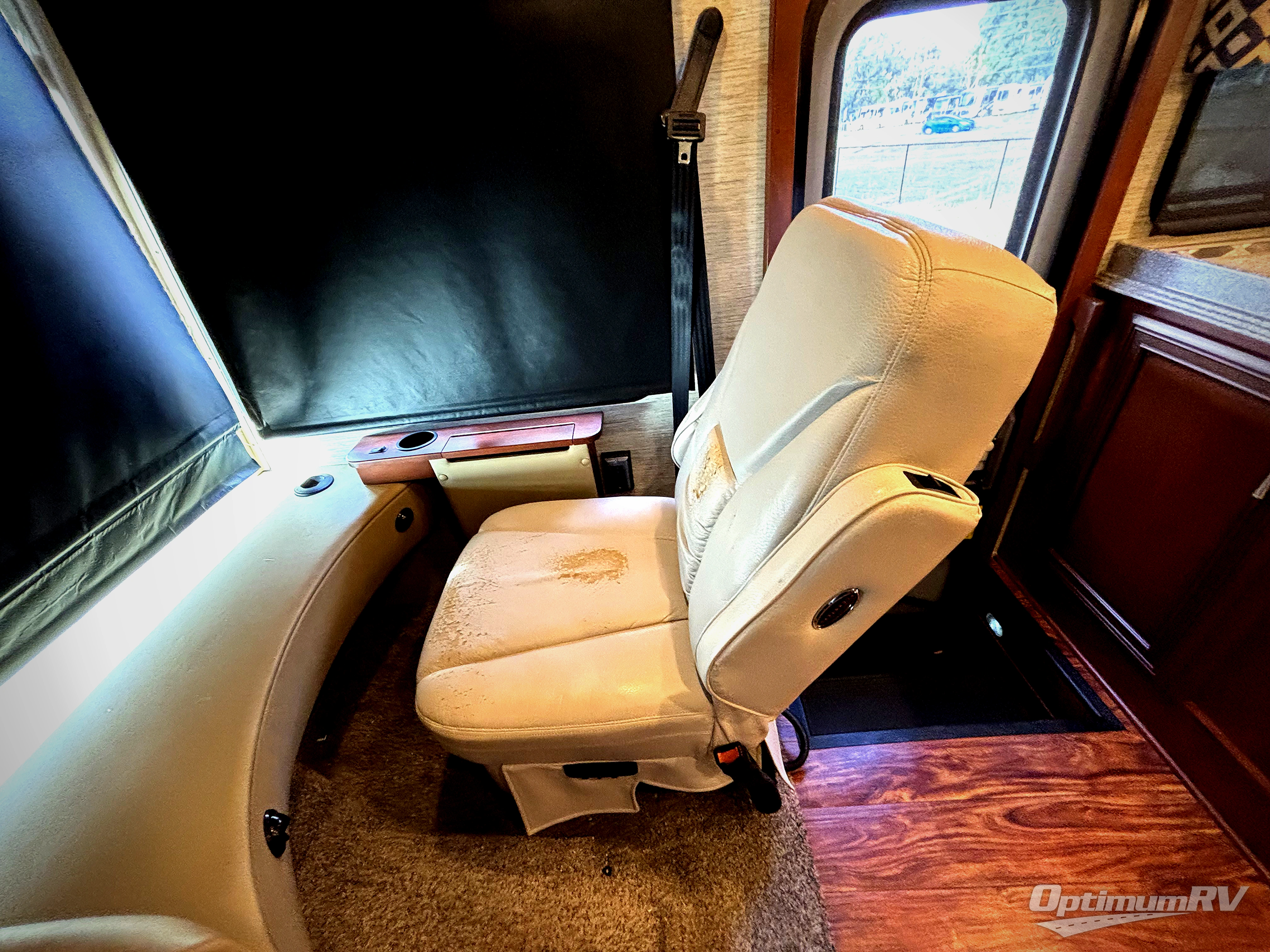 As you enter the motor coach, to the right there is the driver and passenger's chairs that rotate to provide more seating in the living and kitchen area. There is additional storage above the cab.