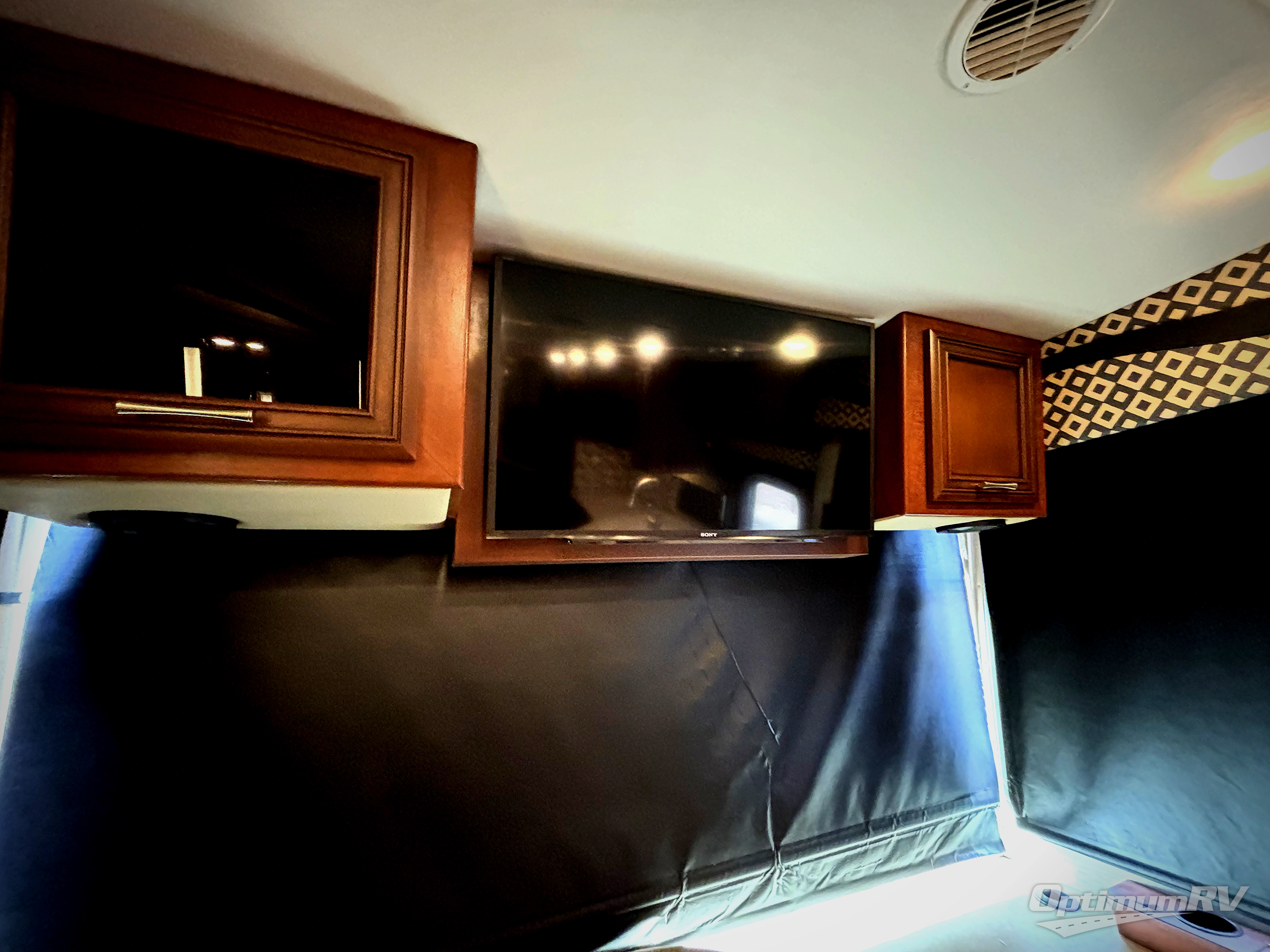 As you head to the rear bath, slide the master bedroom door open to see a king bed slide out including overhead cabinets. A chest of drawers, dual shirt wardrobes, overhead cabinets, and a TV are on the opposite wall.