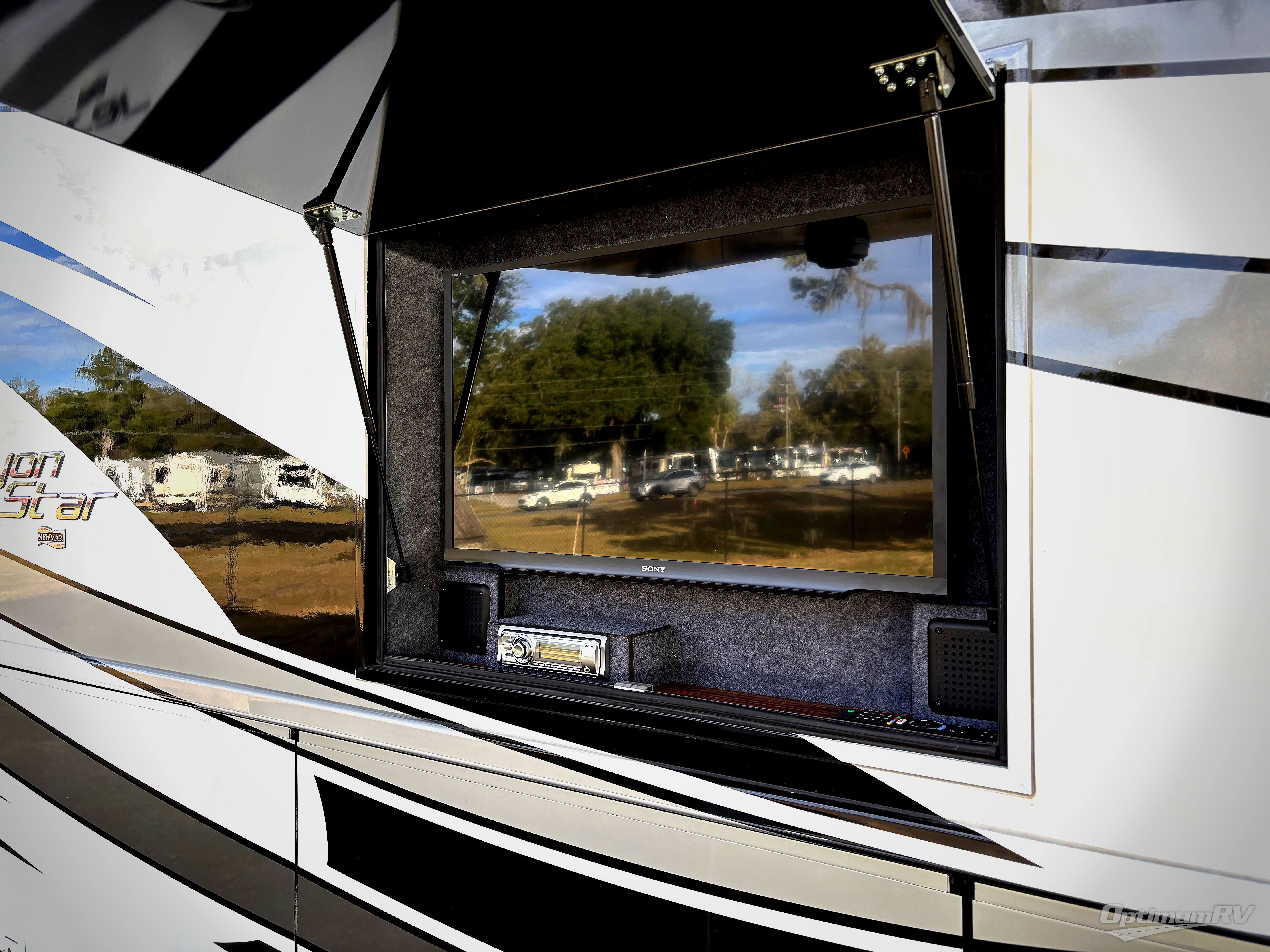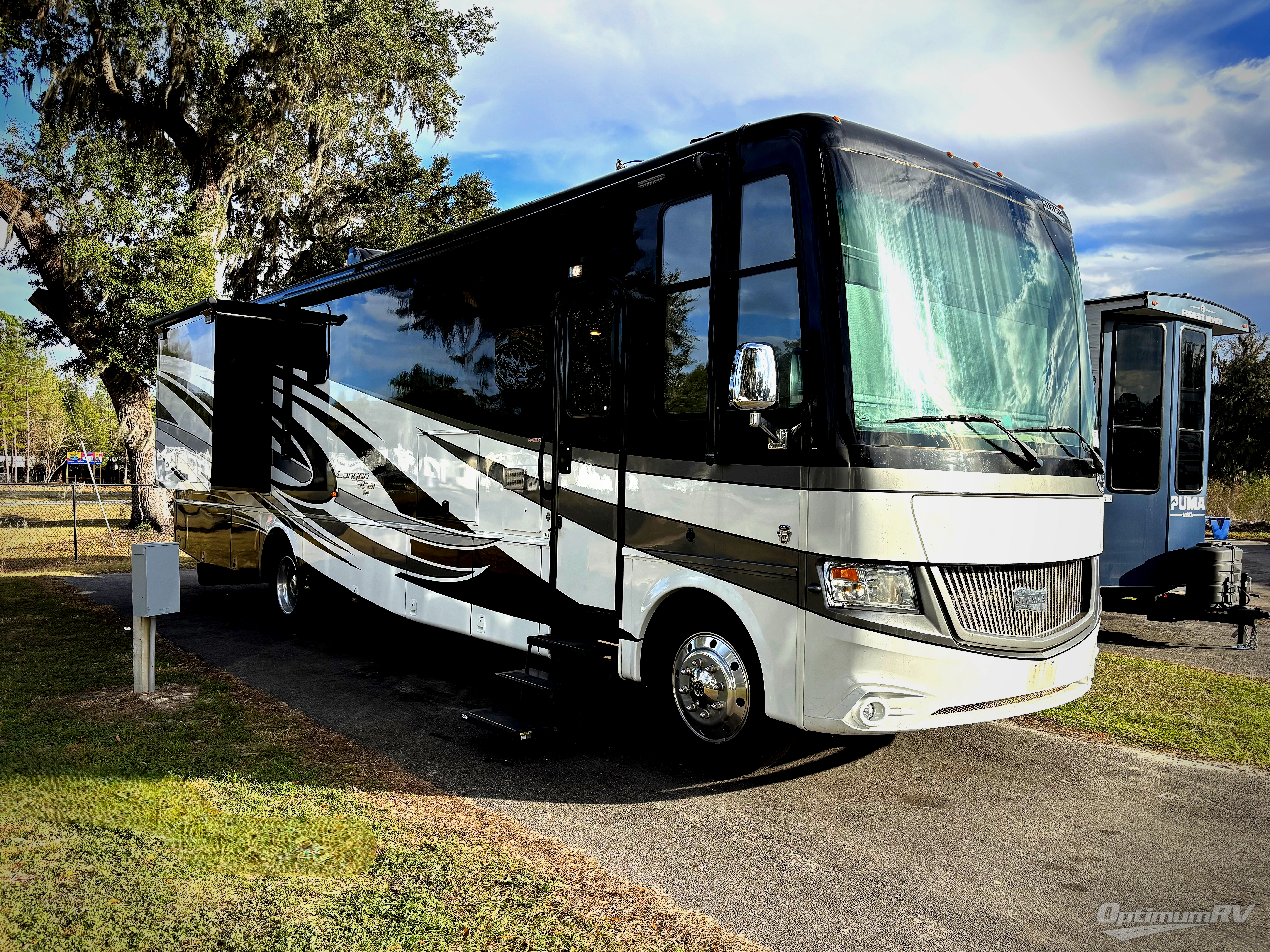 This Newmar Canyon Star 3710 class A gas motor coach features a rear master bath, king bed, dry bar, plus a half bath.