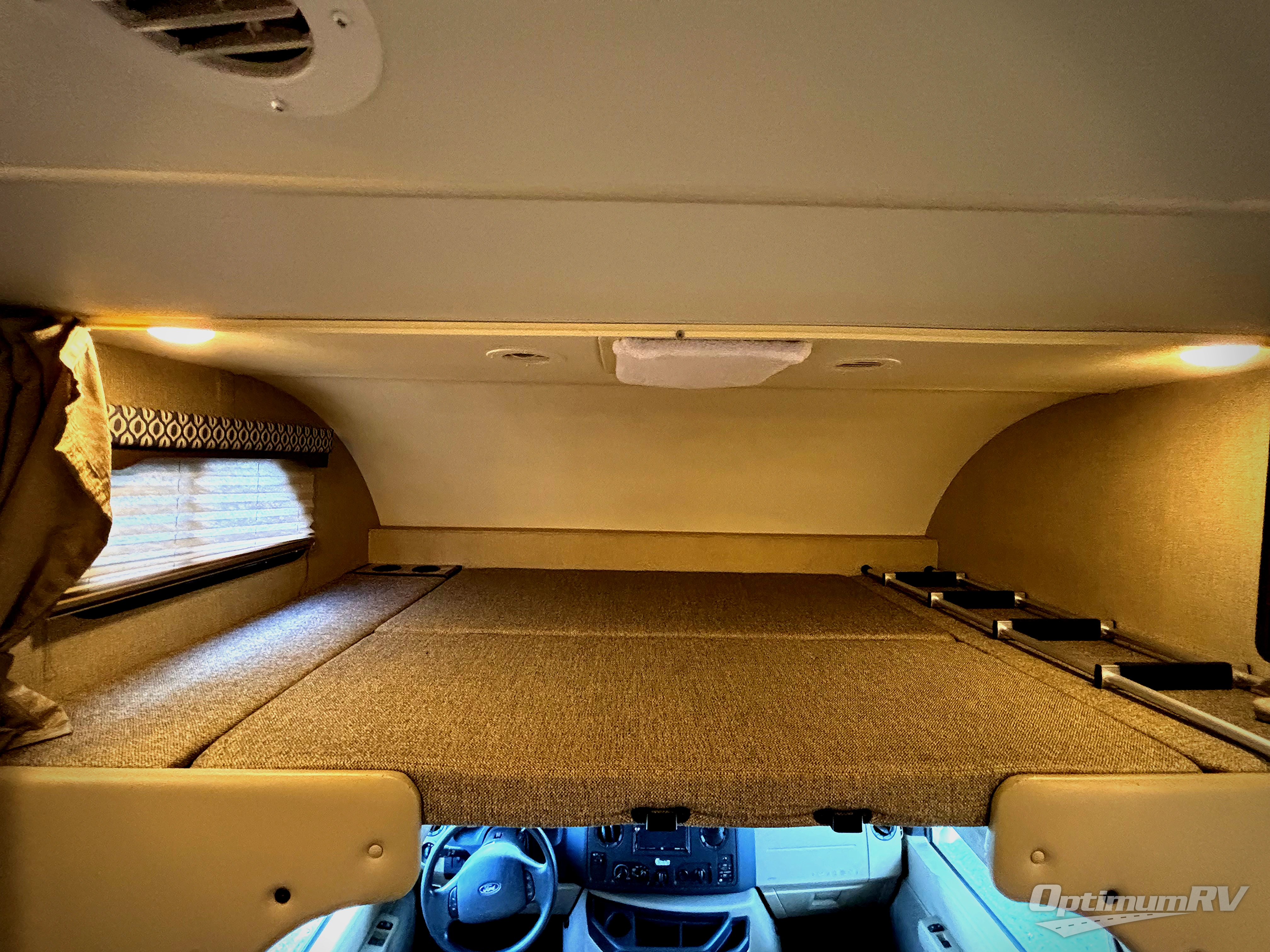 Above the cab there is a cab-over bunk with a 54"x96" sleeping area with two sets of overhead cabinets.
