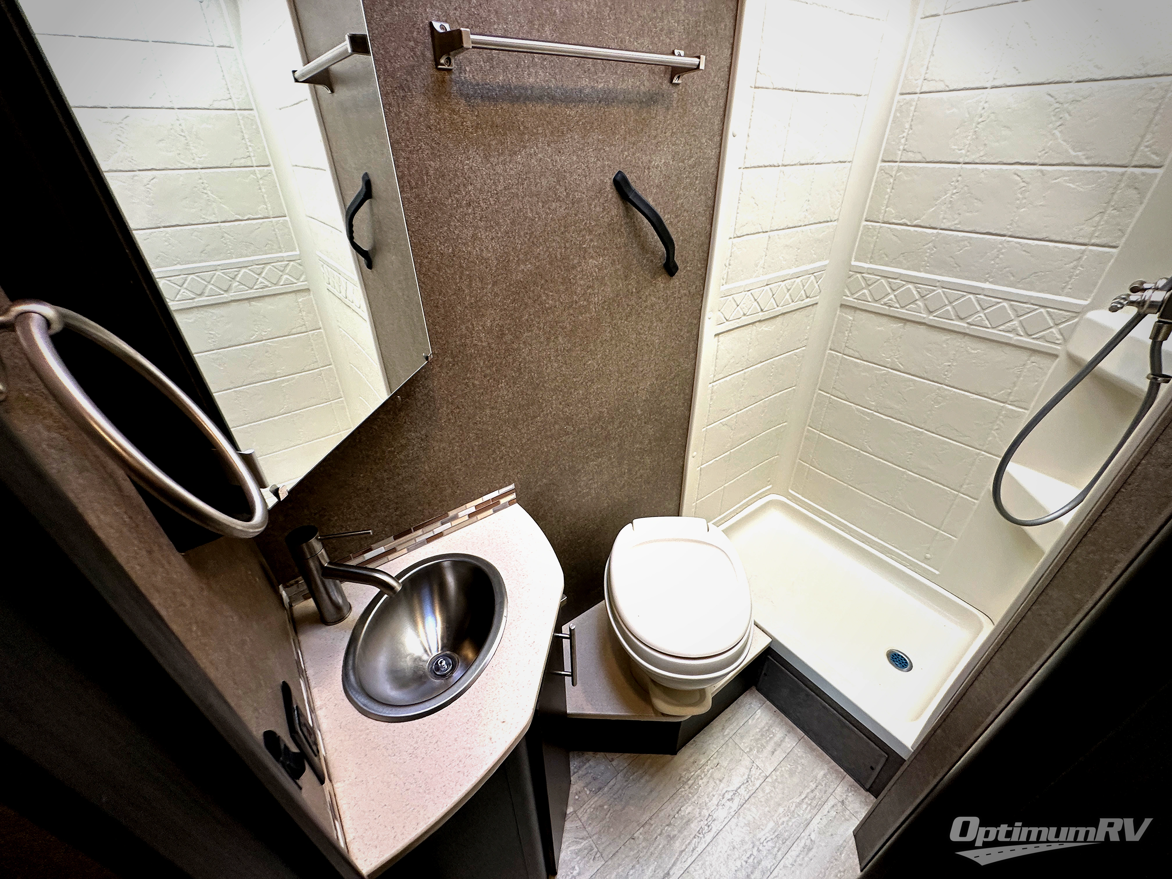 The rear corner bathroom features a 24" X 32" shower, toilet, and sink with overhead storage. There is also a closet/pantry next to the sofa for additional storage.