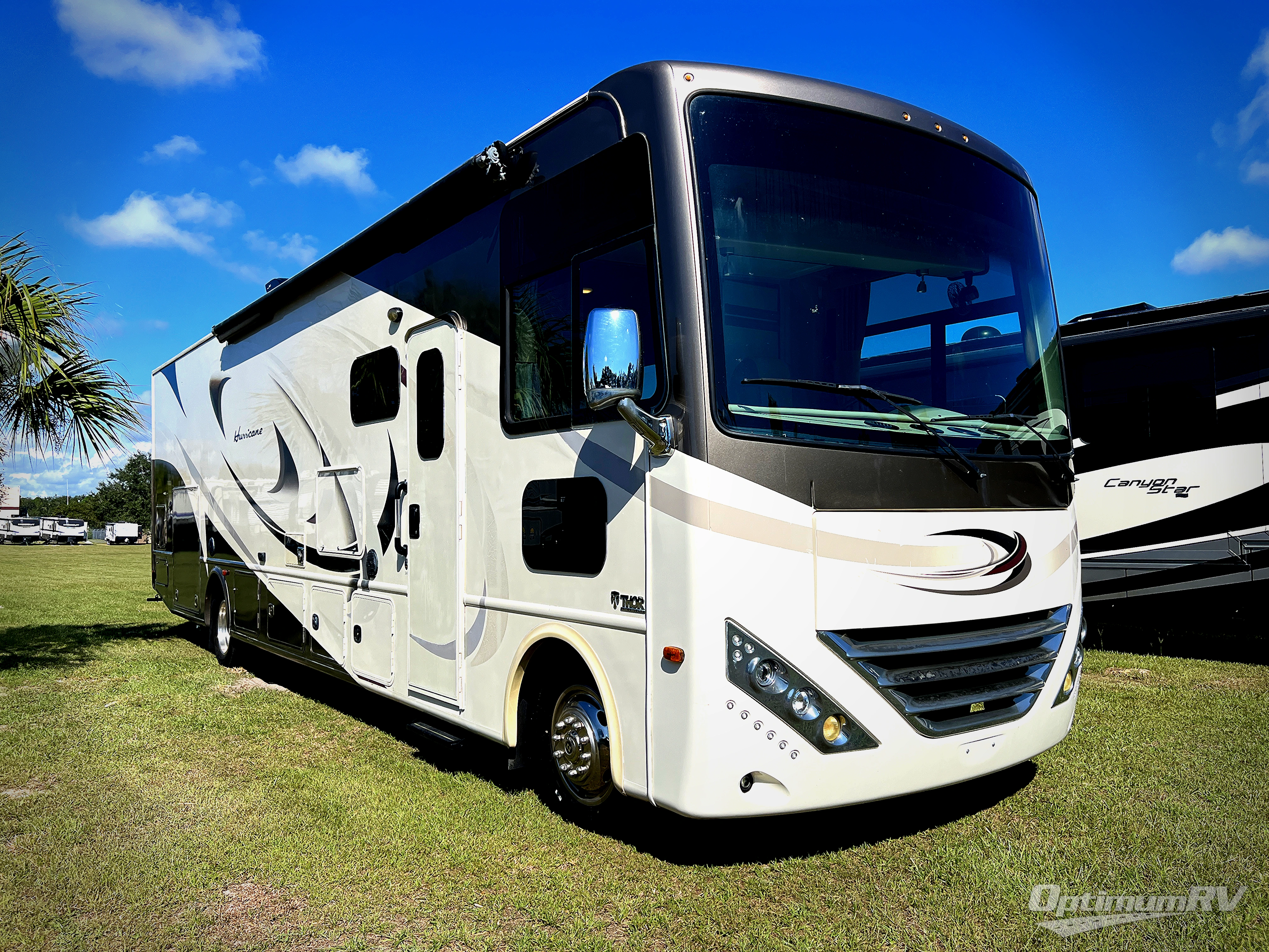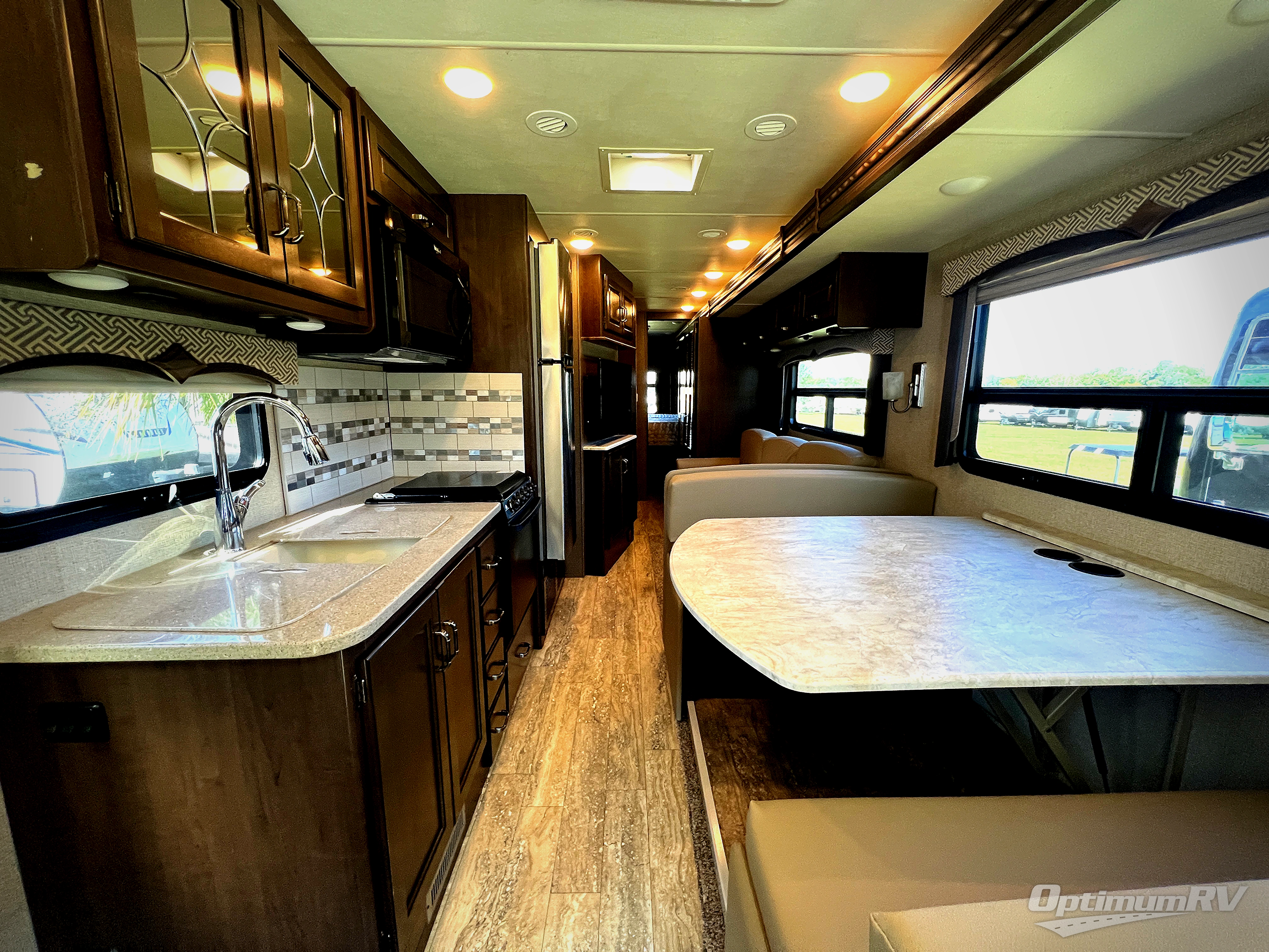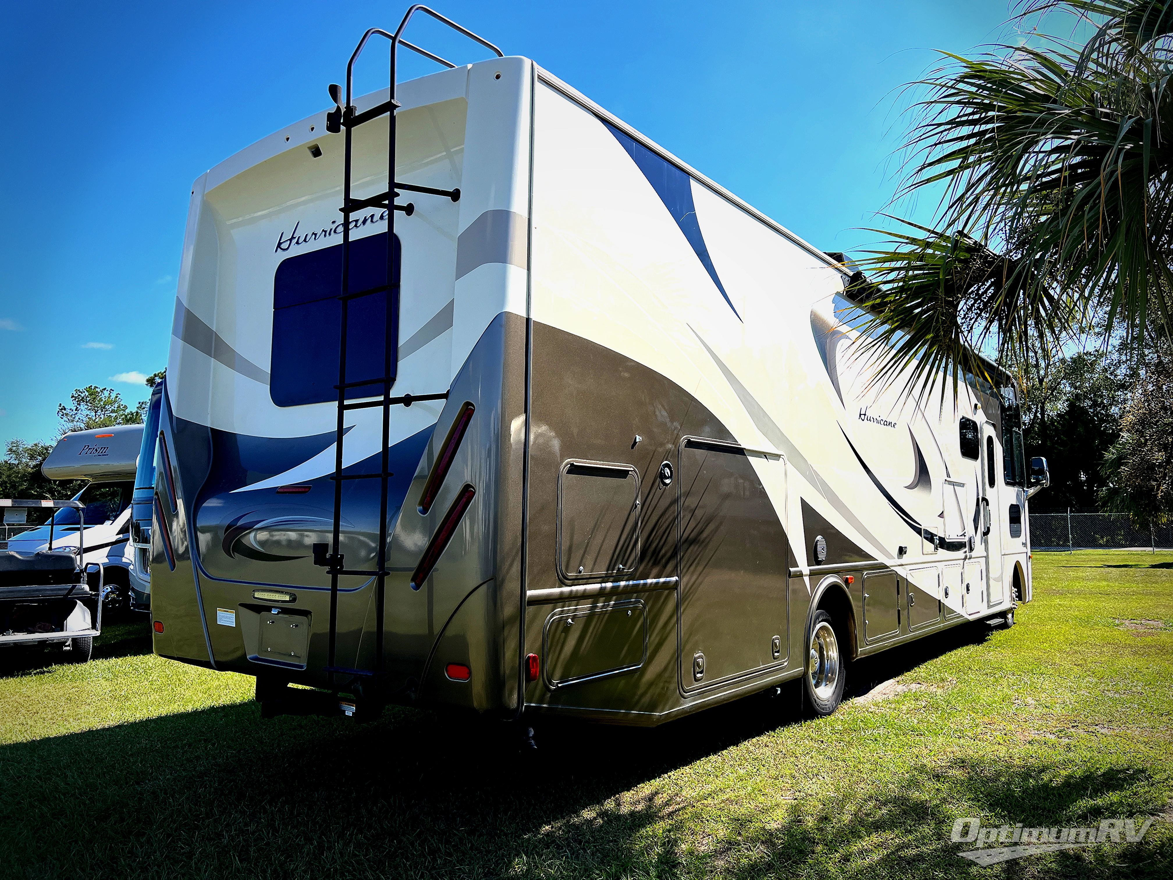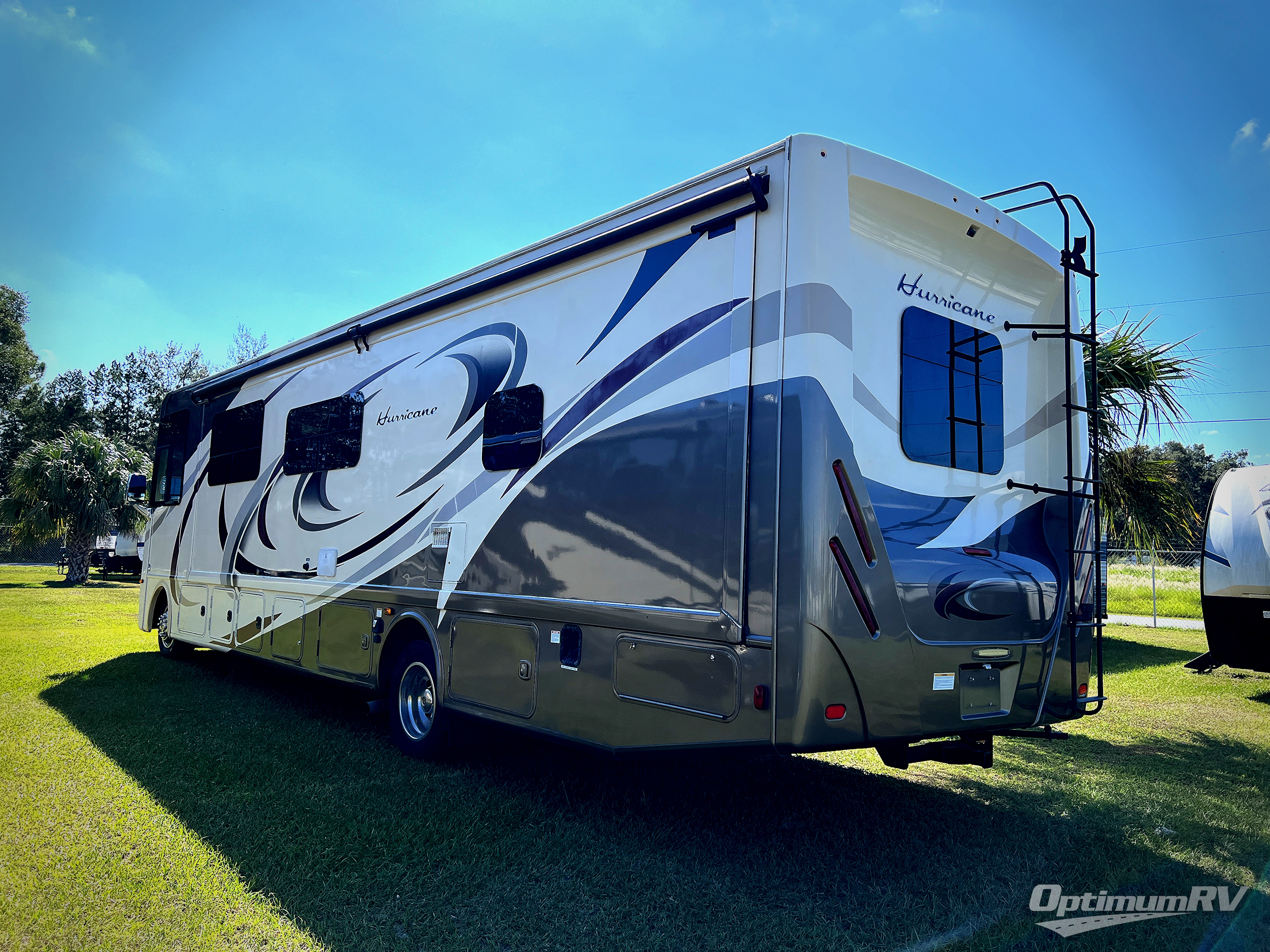 As you enter the Hurricane 34F Class A gas motor home by Thor Motor Coach, you will notice a full wall slide out along the driver's side that opens up this whole coach. Within the living area, there is a dream dinette, and a sofa along with overhead cabinets. Just beyond the sofa, there are two wardrobes, one that includes washer/dryer prep.