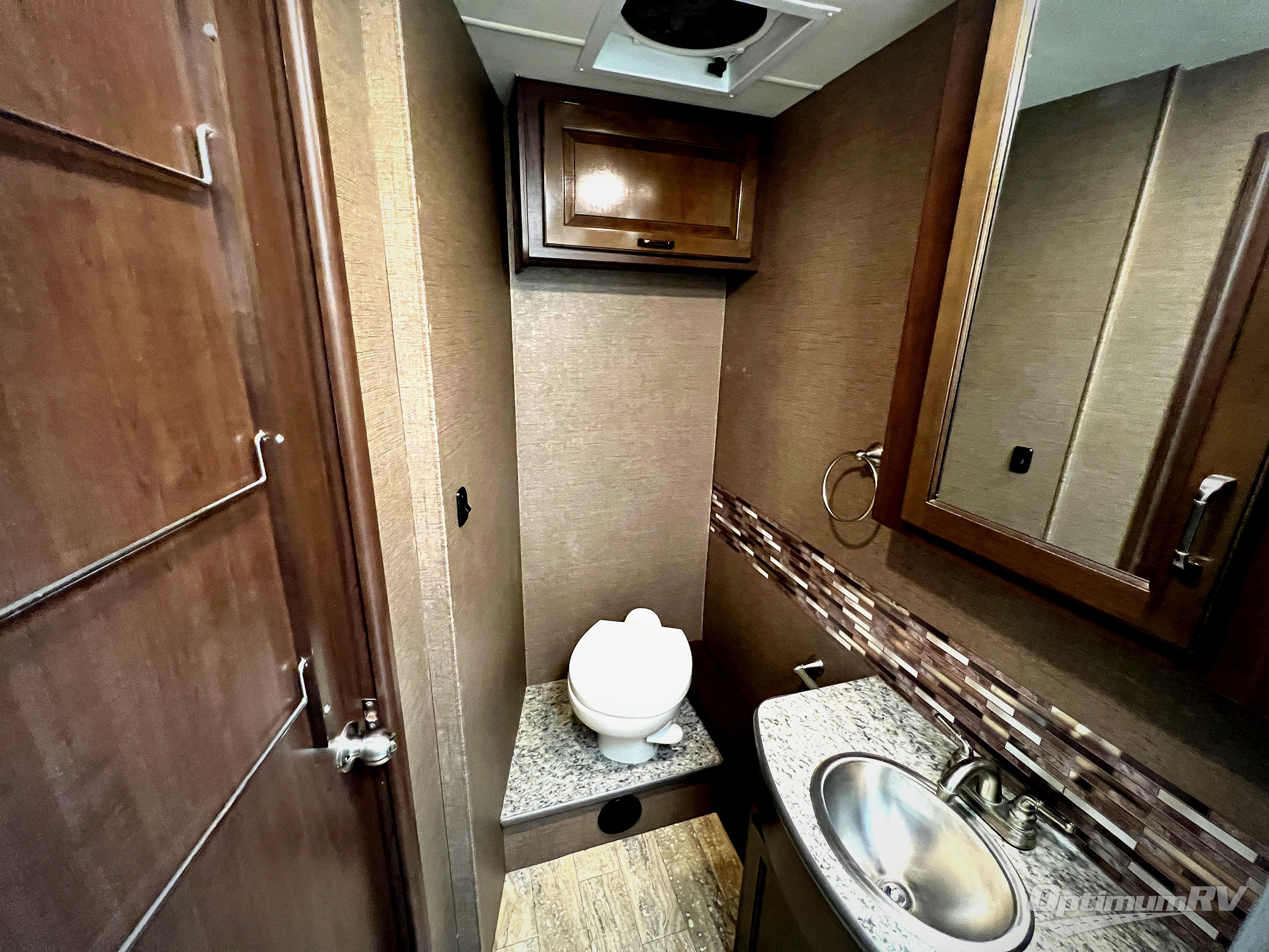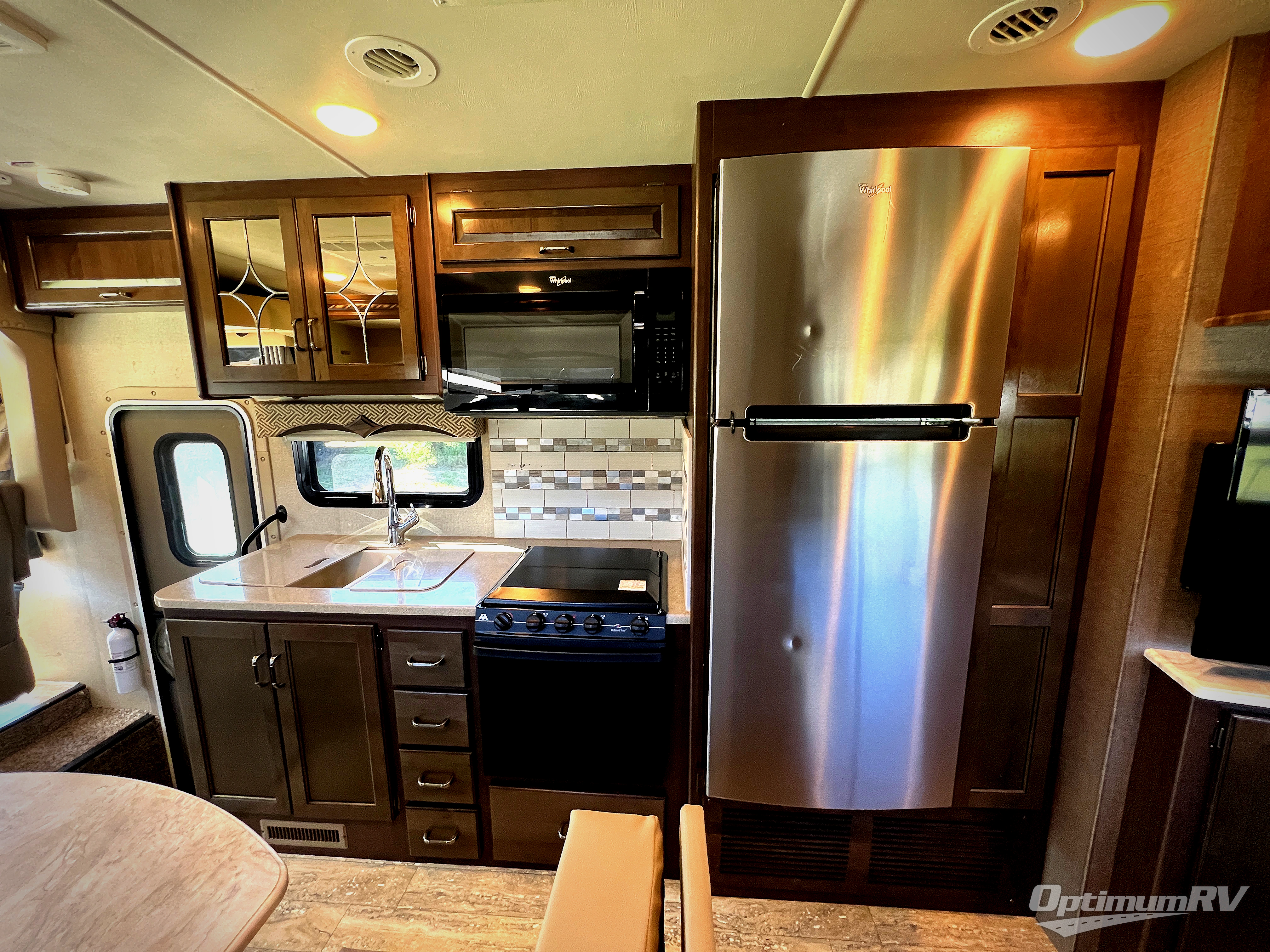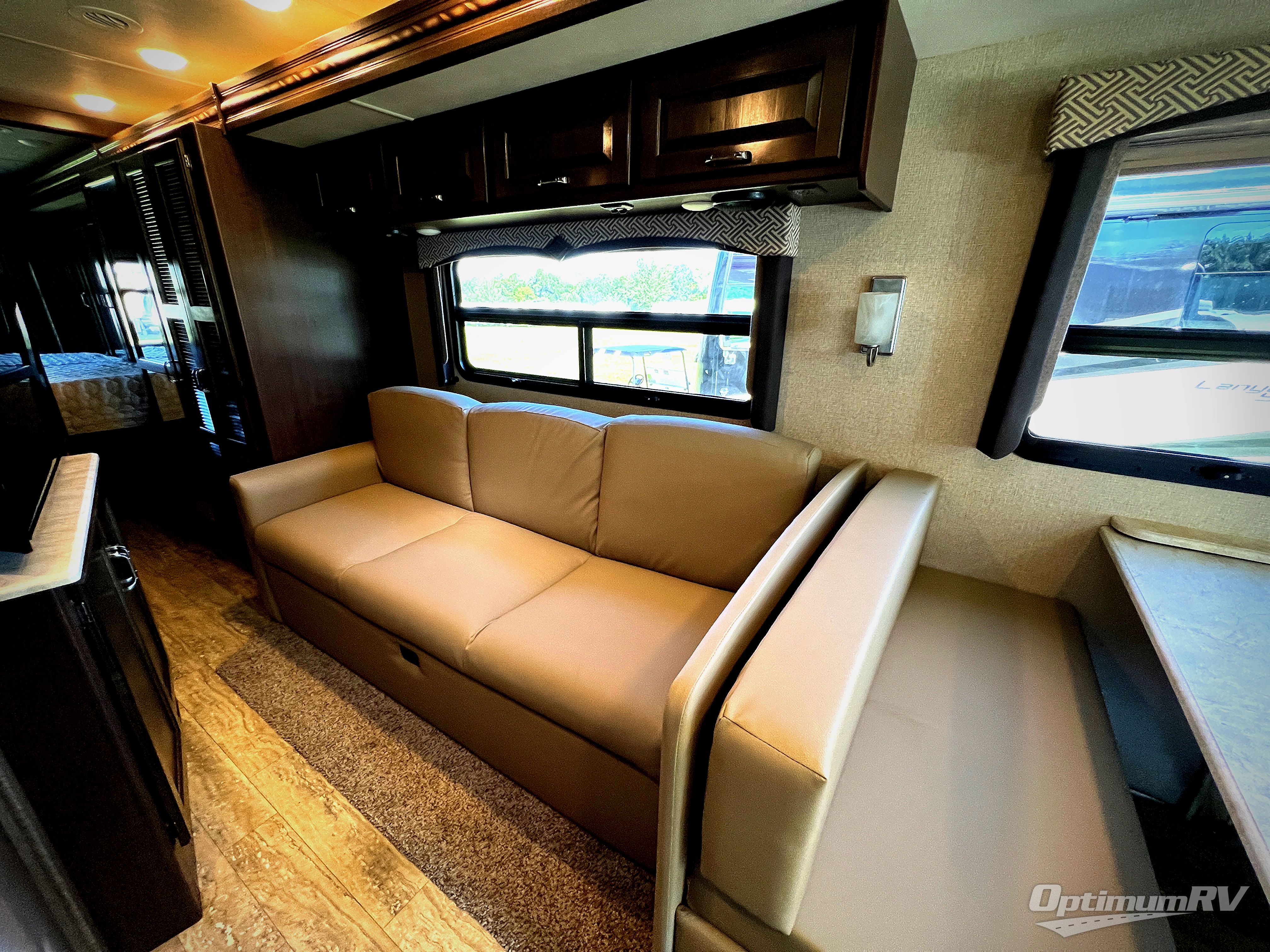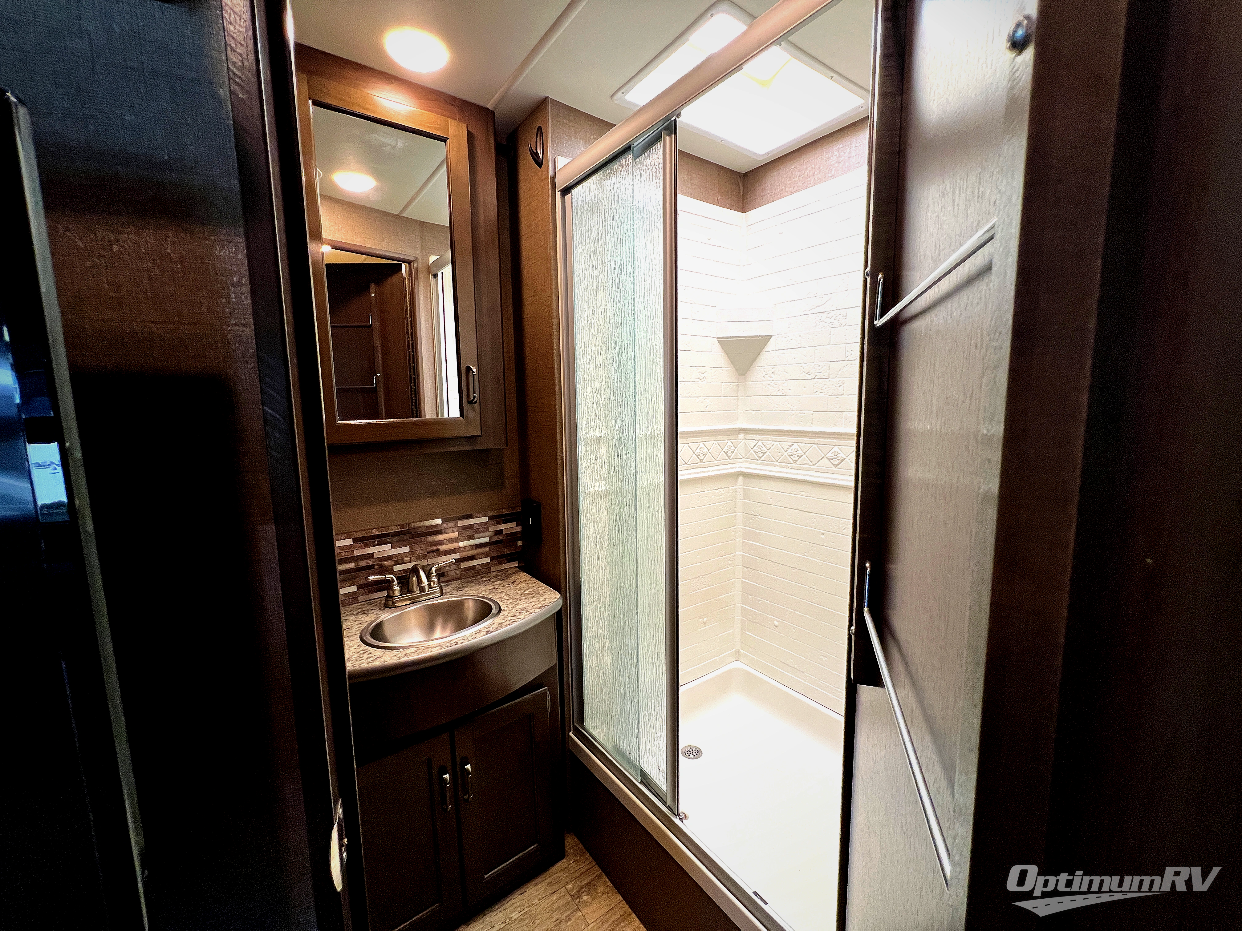 As you enter the Hurricane 34F Class A gas motor home by Thor Motor Coach, you will notice a full wall slide out along the driver's side that opens up this whole coach. Within the living area, there is a dream dinette, and a sofa along with overhead cabinets. Just beyond the sofa, there are two wardrobes, one that includes washer/dryer prep.