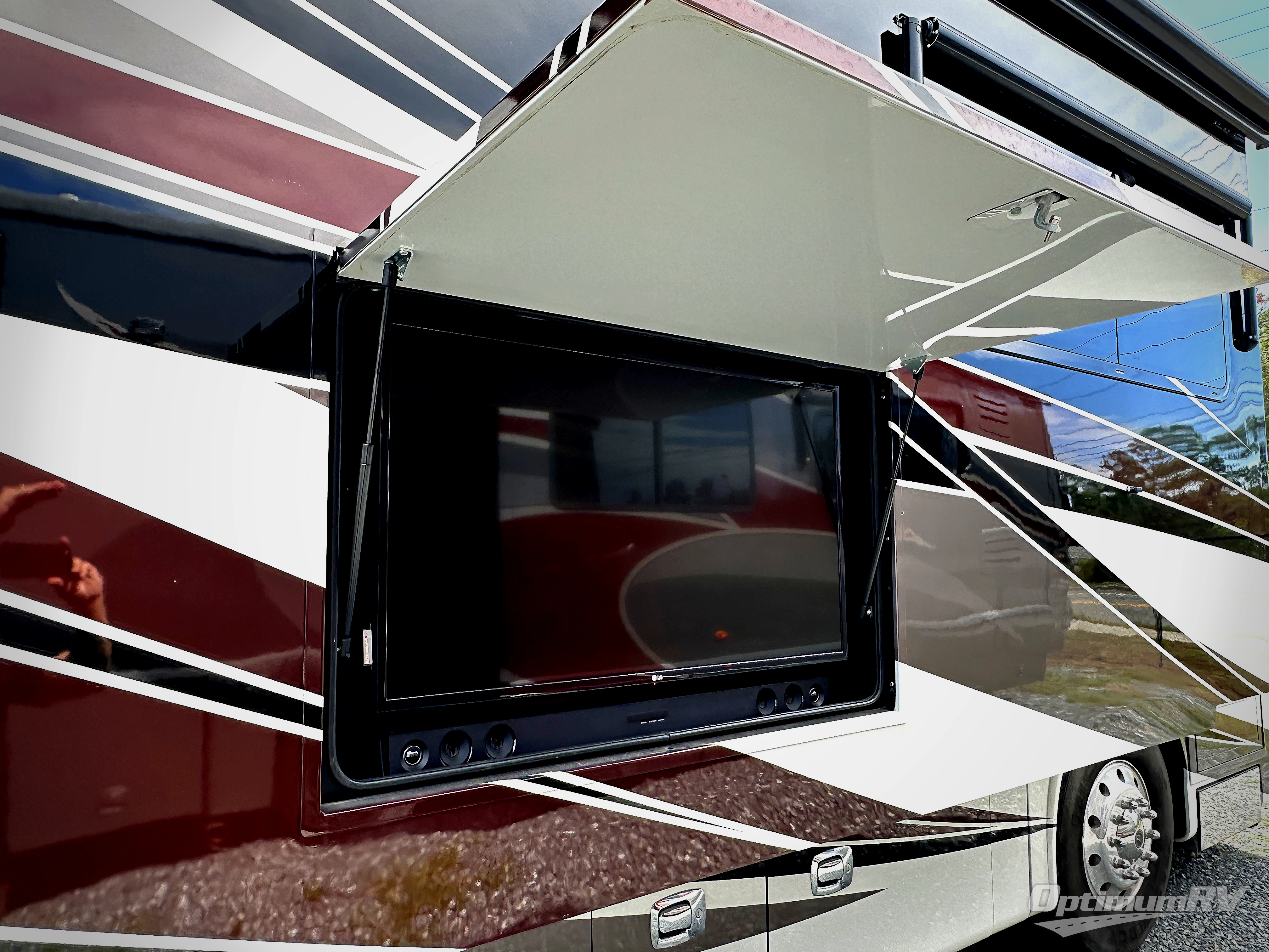 In the rear of this diesel coach you will find a private retreat featuring a slide out queen size bed with nightstands where you can rest easily and get ready for the next days adventure. There is also a large closet with optional washer and dryer which is very convenient while traveling. Across from the bed is a slide which includes a TV, storage drawers below a counter and double lavatory sinks. In the bathroom you will also find a toilet and shower.
