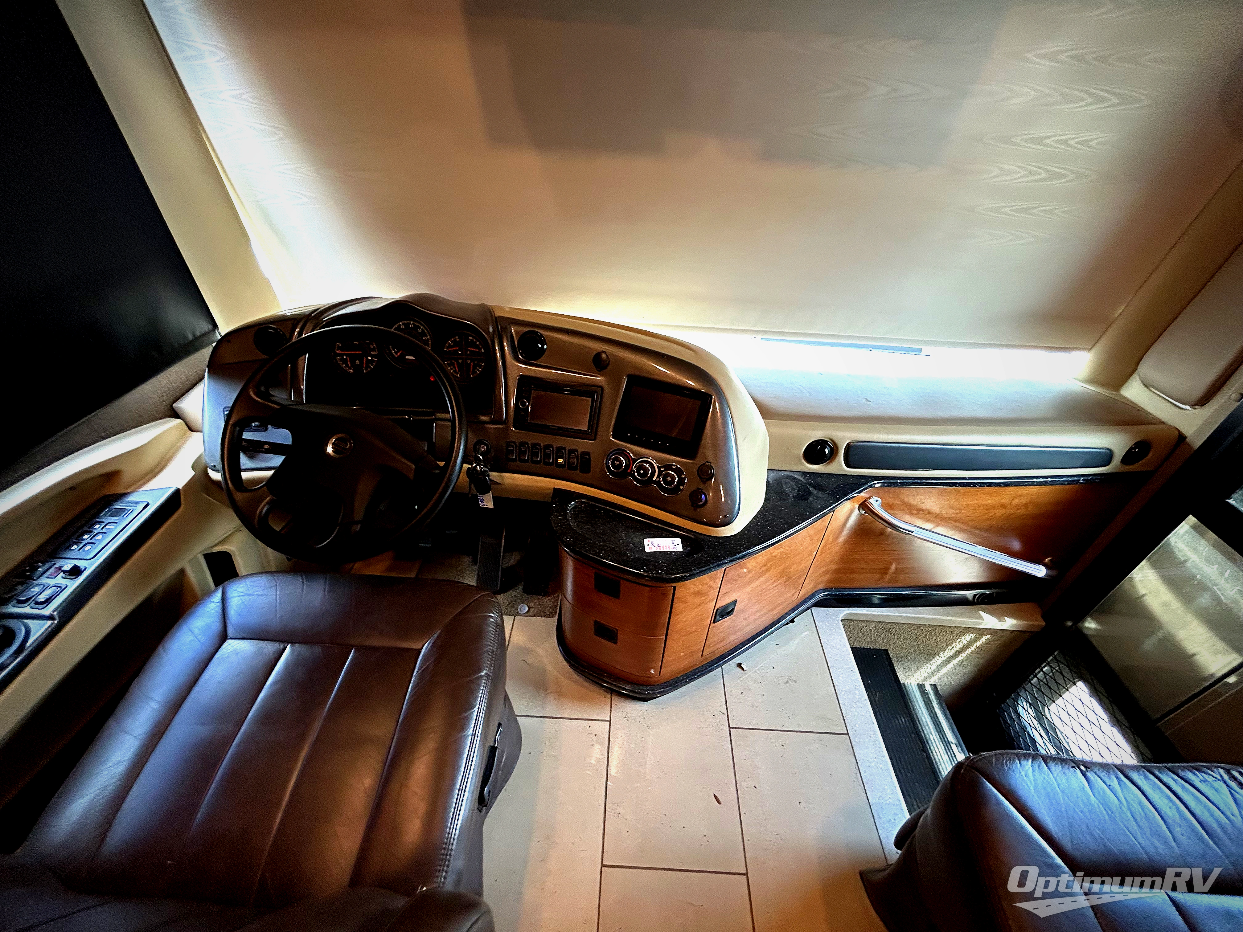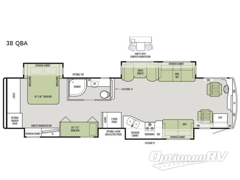 Step inside model 38 QBA and enjoy what you see. There are quadruple slide outs which make moving around very easy once parked. The entrance is in front of the passenger seat which swivels around along with the driver seat to create a great conversation area up front for enjoyment. There is overhead storage in the cab area, as well as a TV.