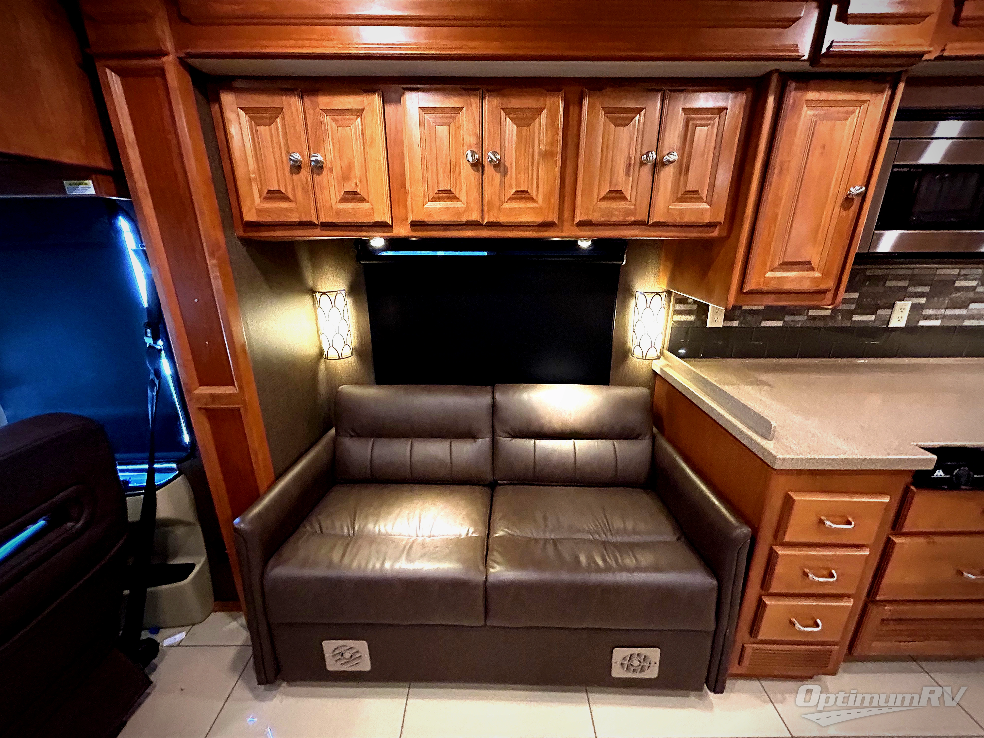 On the driver side find a slide out sofa bed with booth dinette. There is overhead cabinet space above the sofa bed for storage. Just off the dinette area you will find a standard TV for enjoyment. If you want you can swap out the booth dinette for a dinette with computer workstation.
