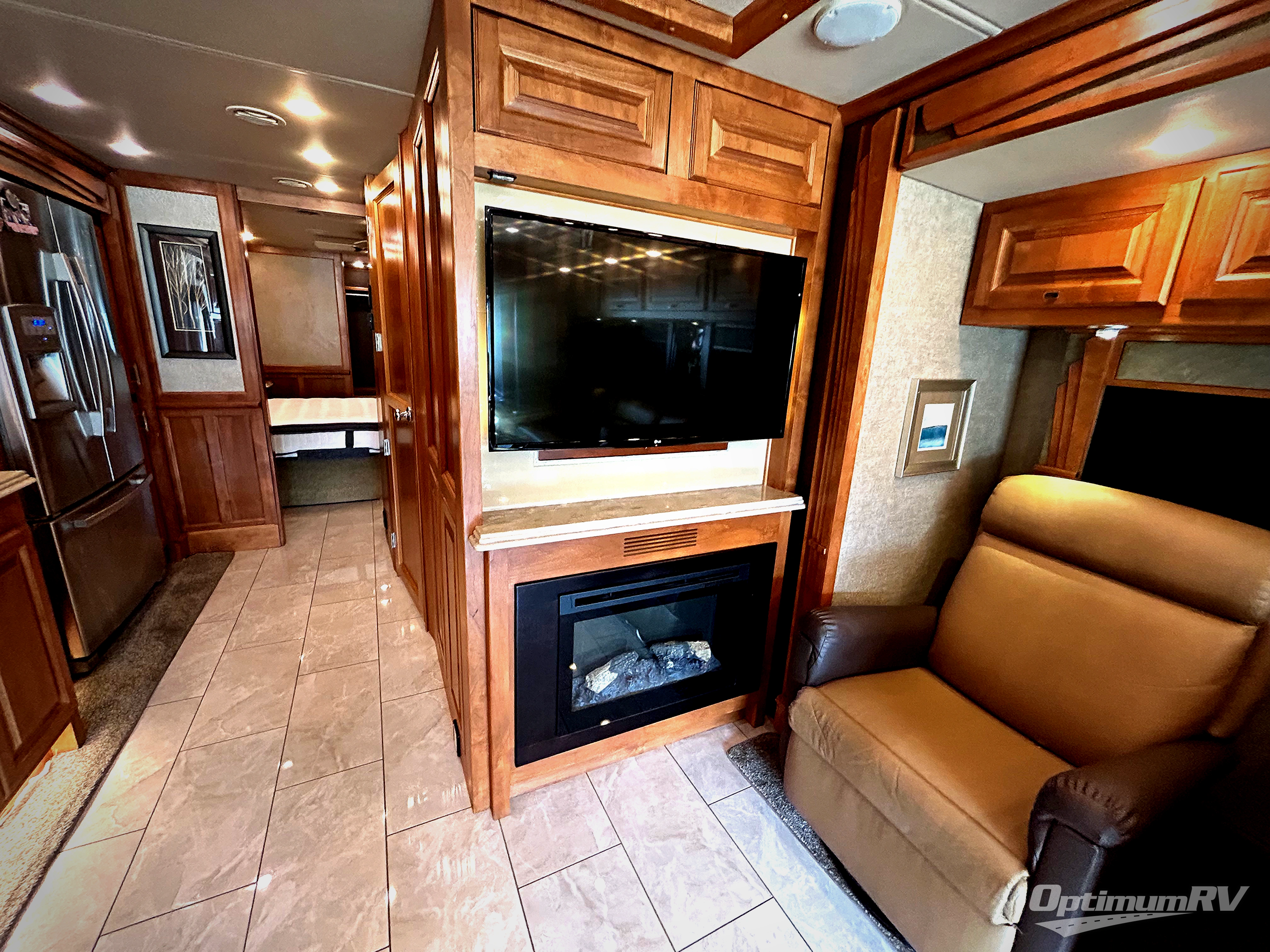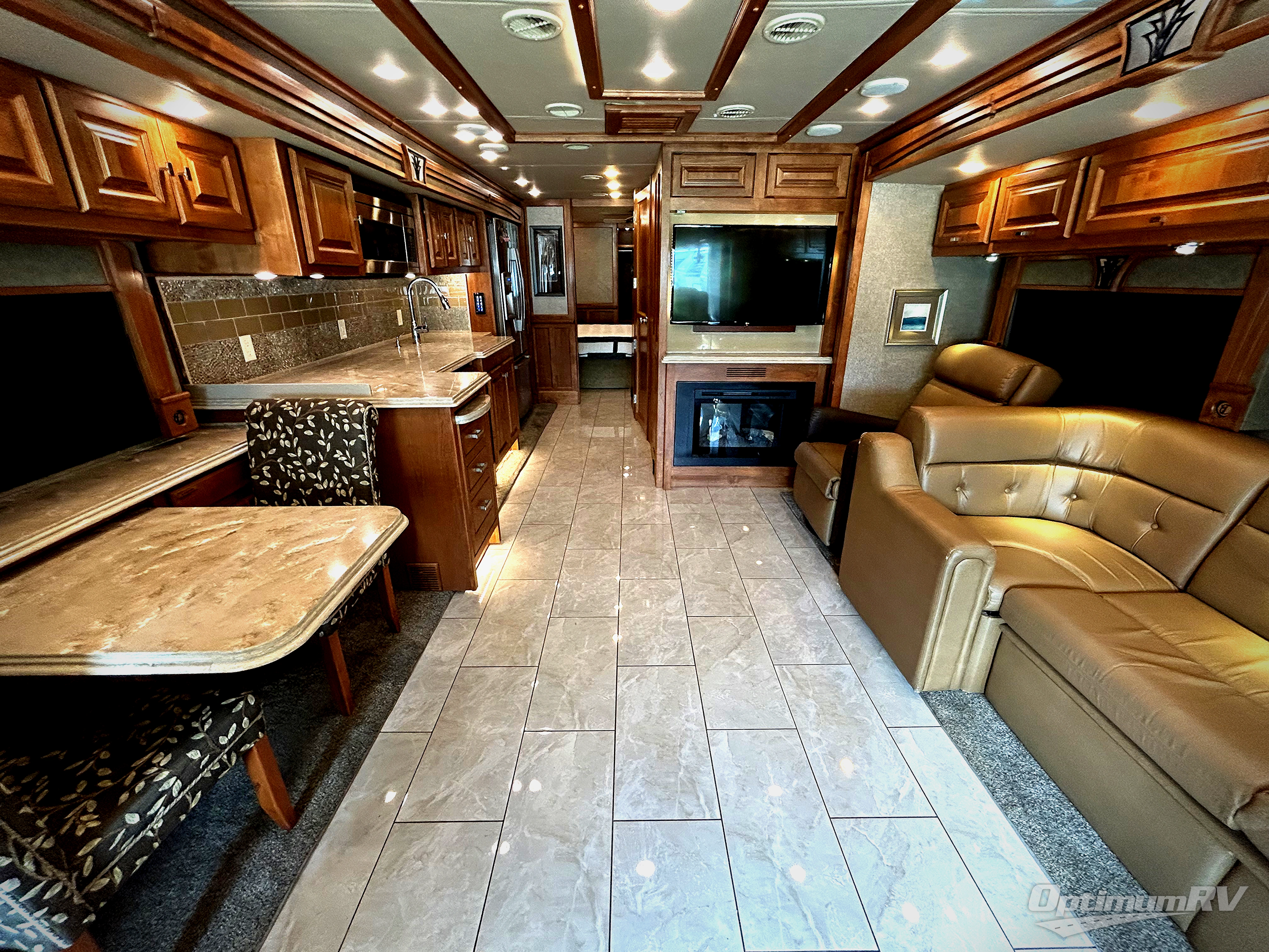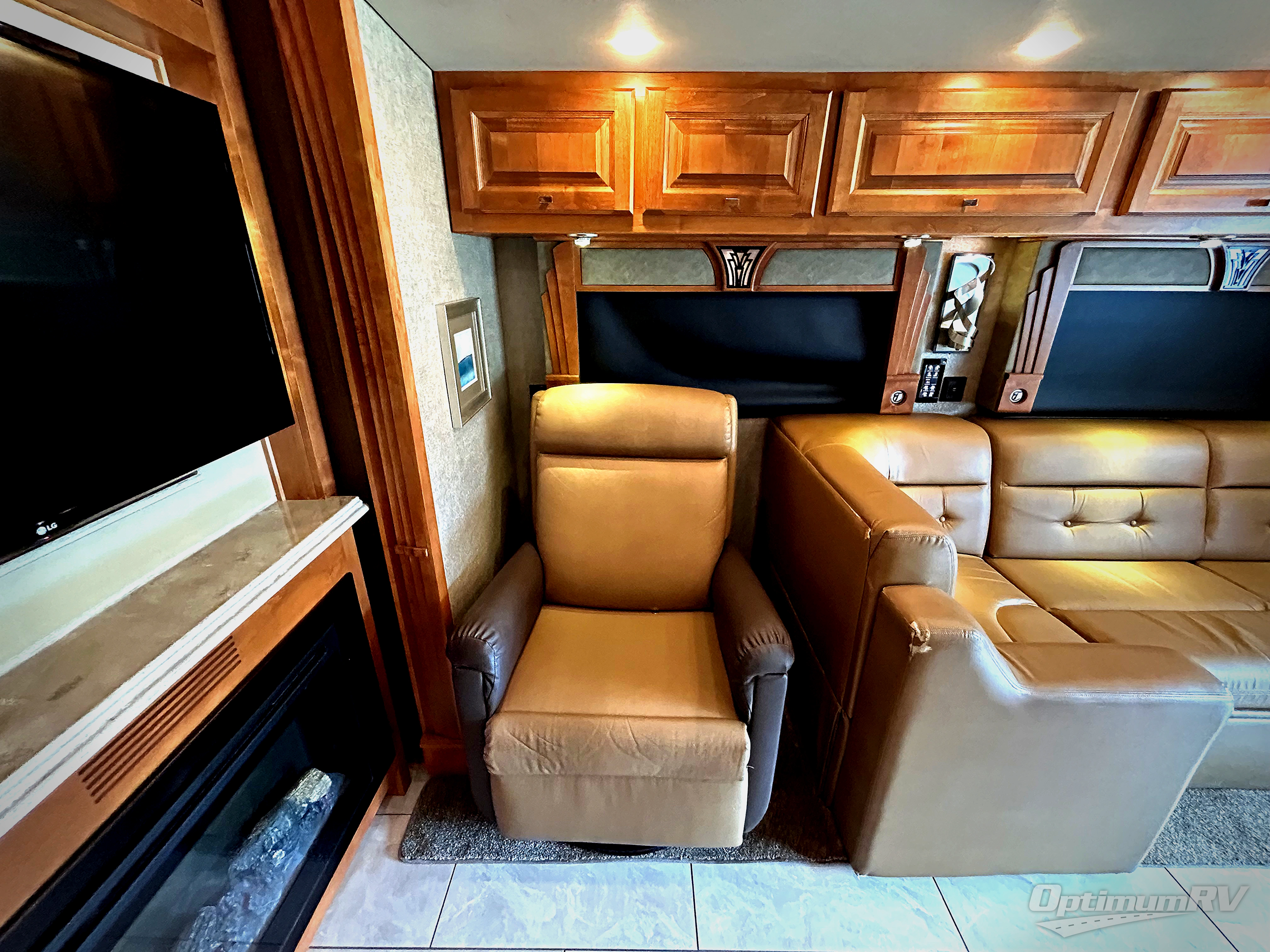 A large road side slide has a chair and sofa bed, or you can choose an optional L-shaped chaise sofa bed. Adjacent to the slide out along the interior wall there is a TV and an optional fireplace.