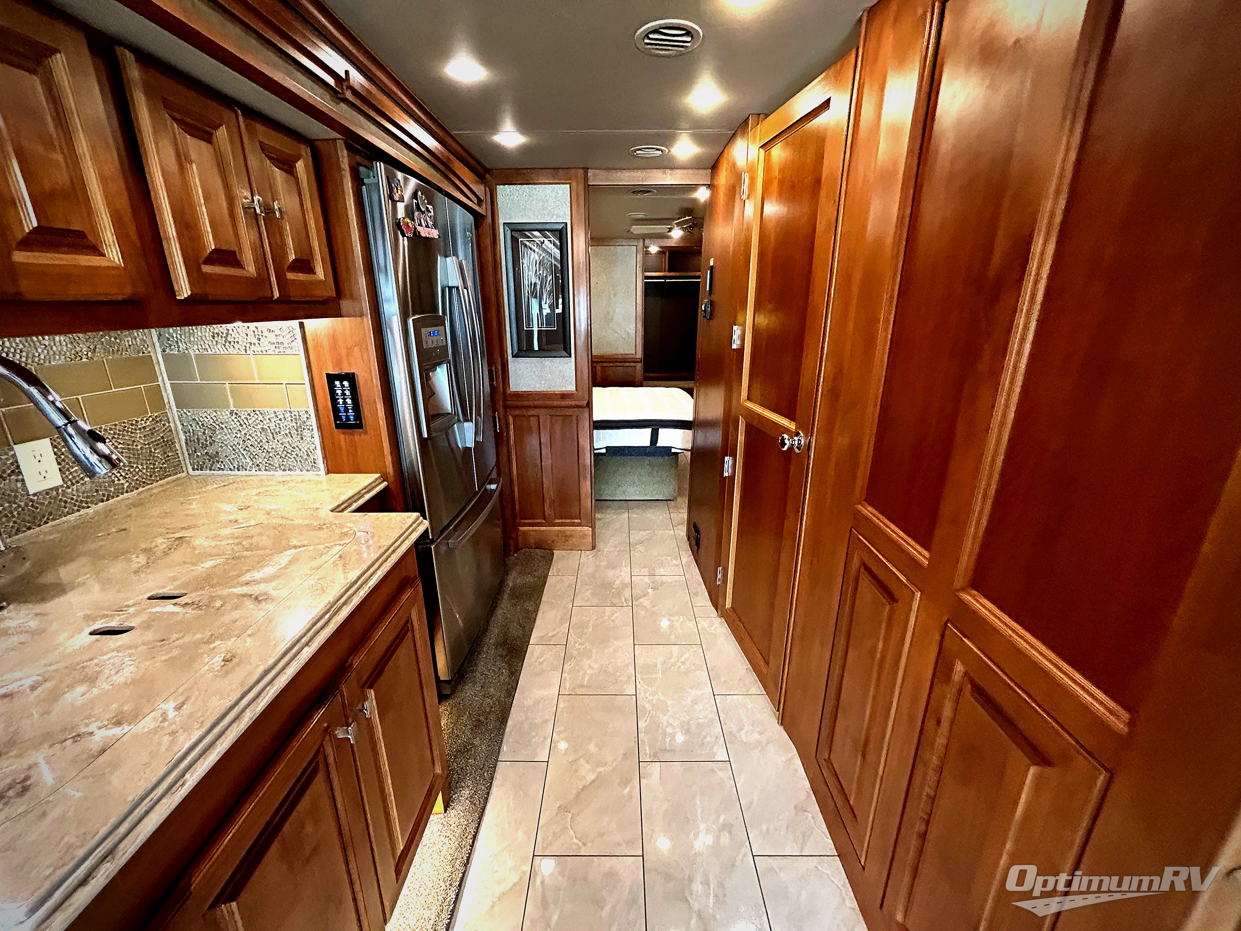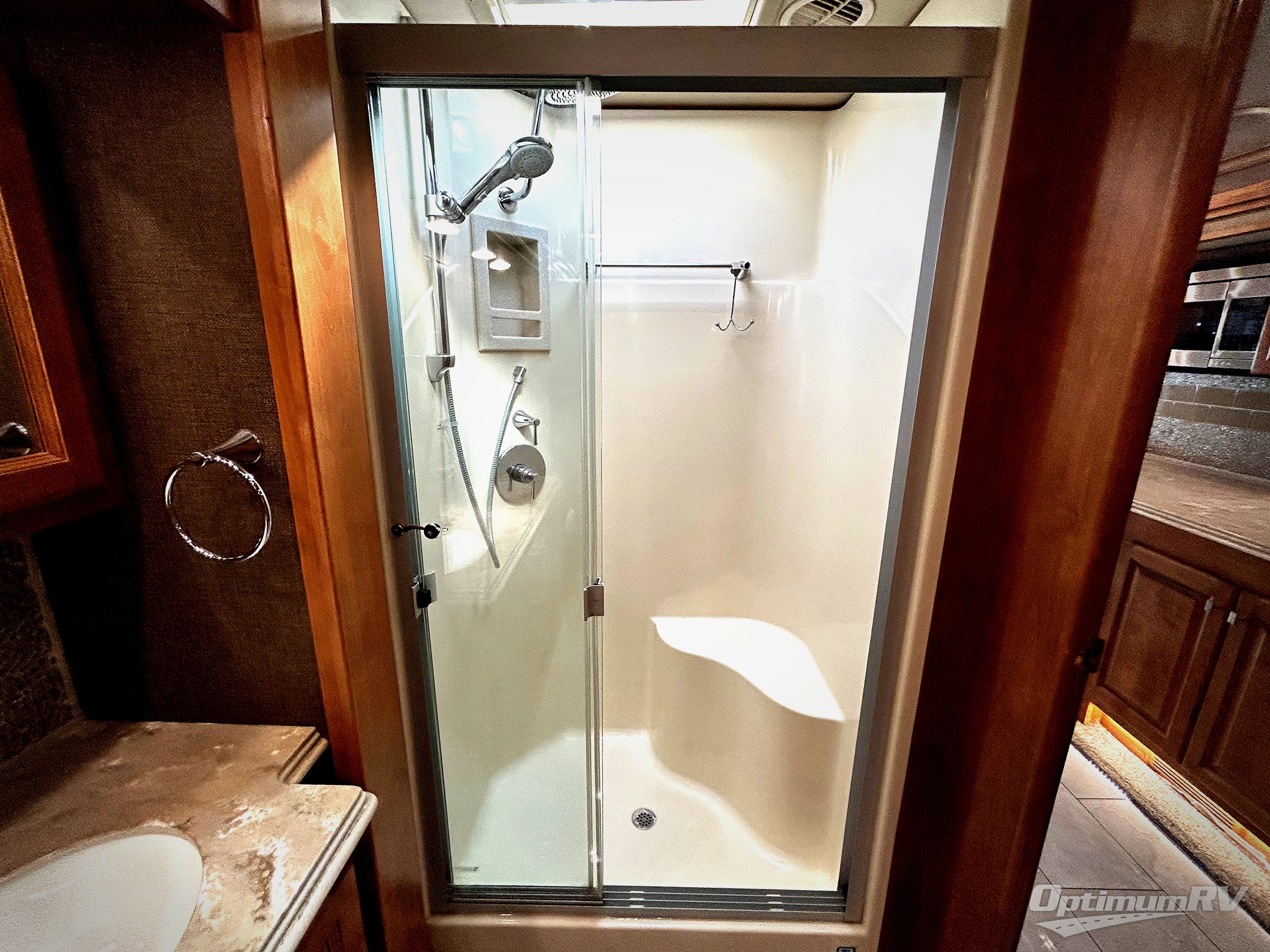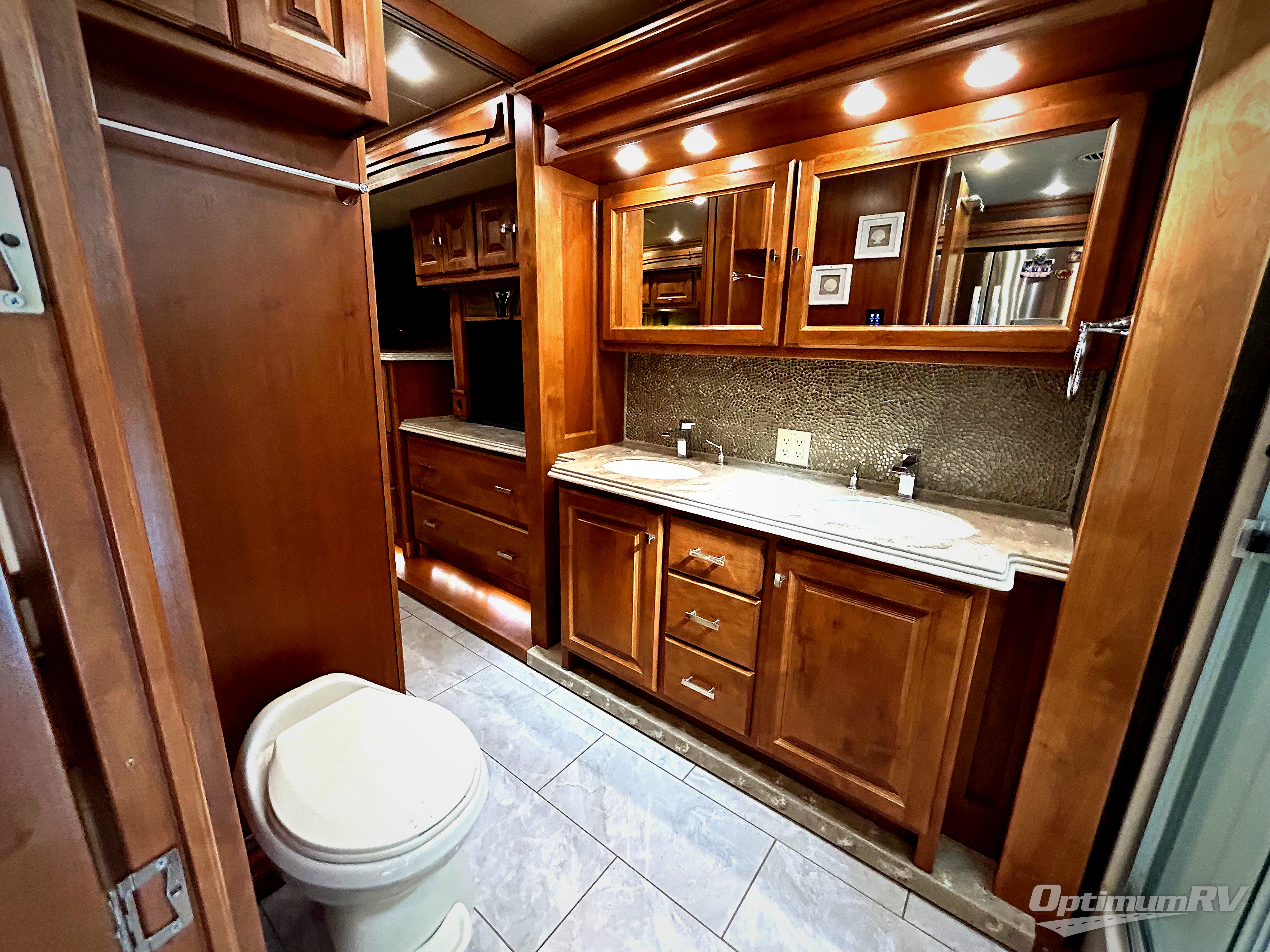 The slide out continues into the side aisle bathroom with his and her sinks and overhead cabinets. The bath also includes a toilet, a shower and access from either the bedroom or the living area.