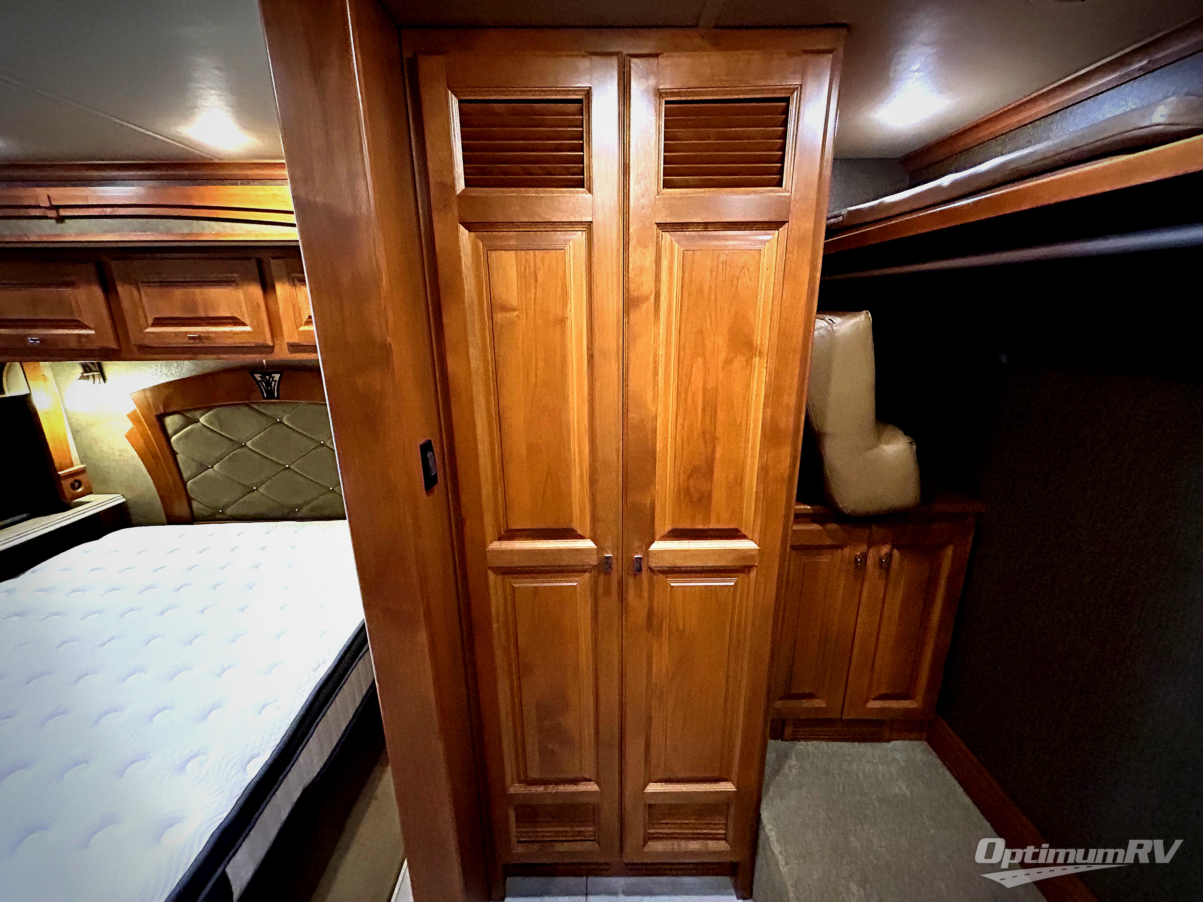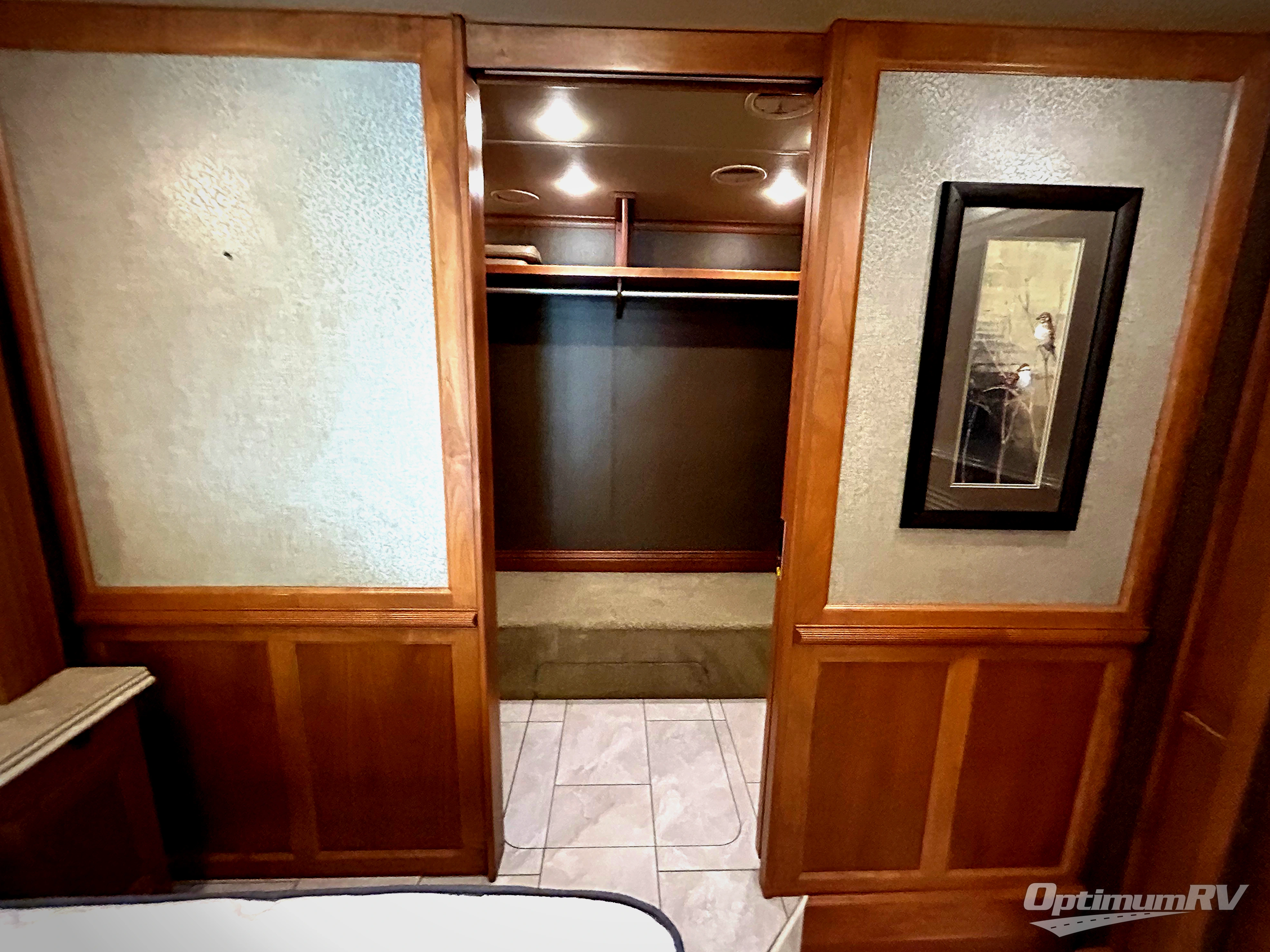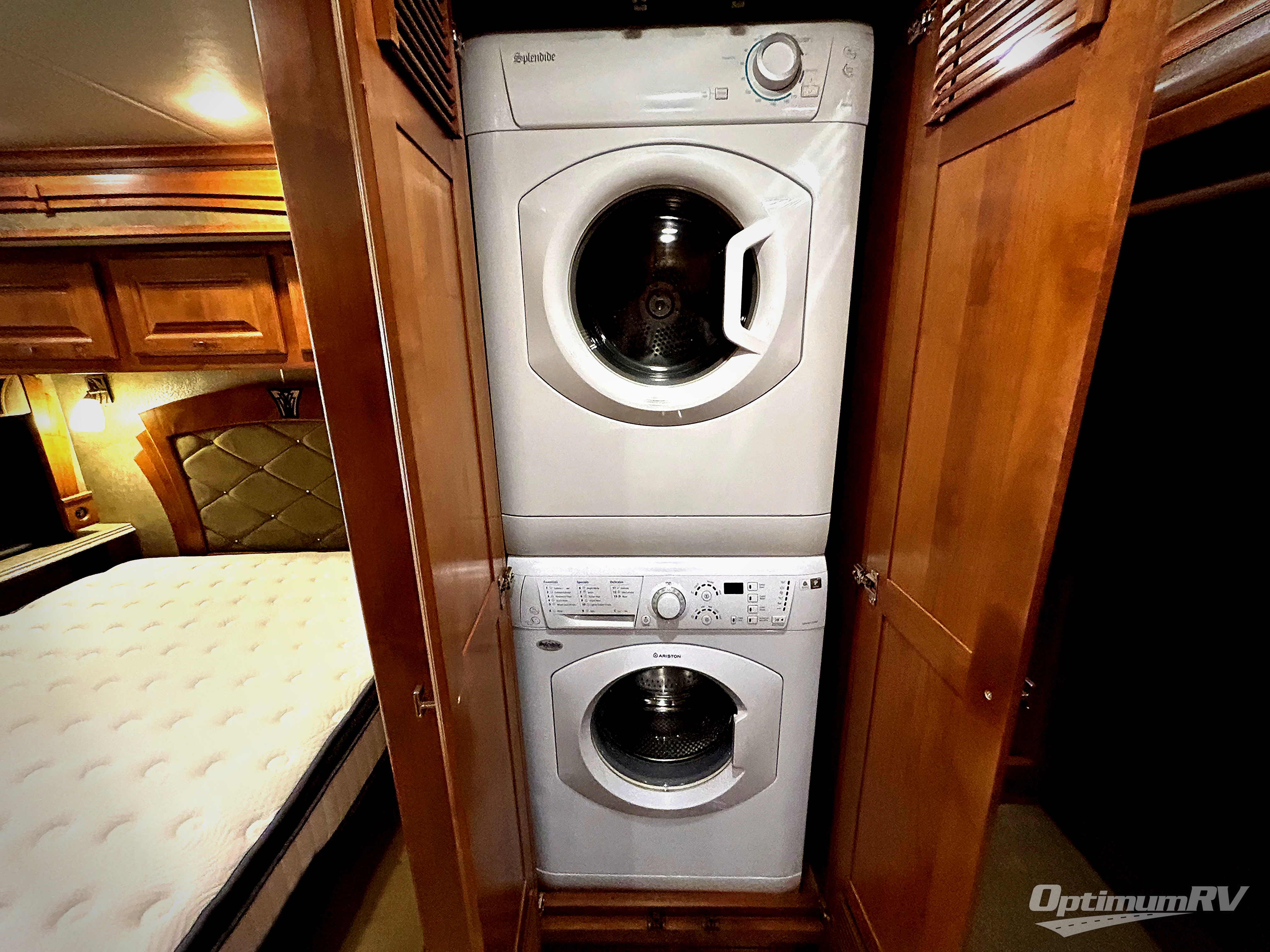 At the rear of this class A diesel coach there is a shelf with hanging rod below, drawers, and a closet for an optional washer/dryer all within a walk in wardrobe.