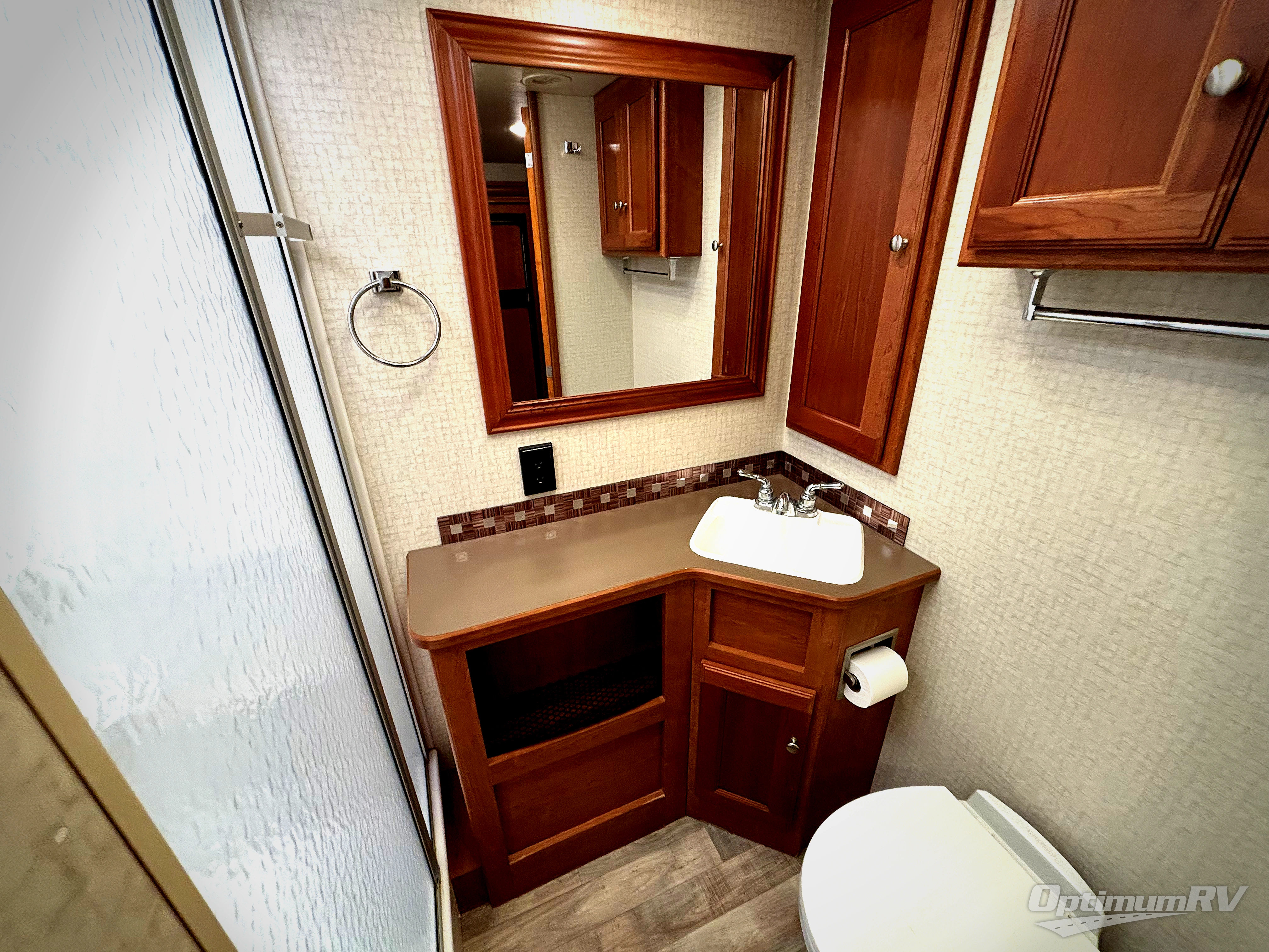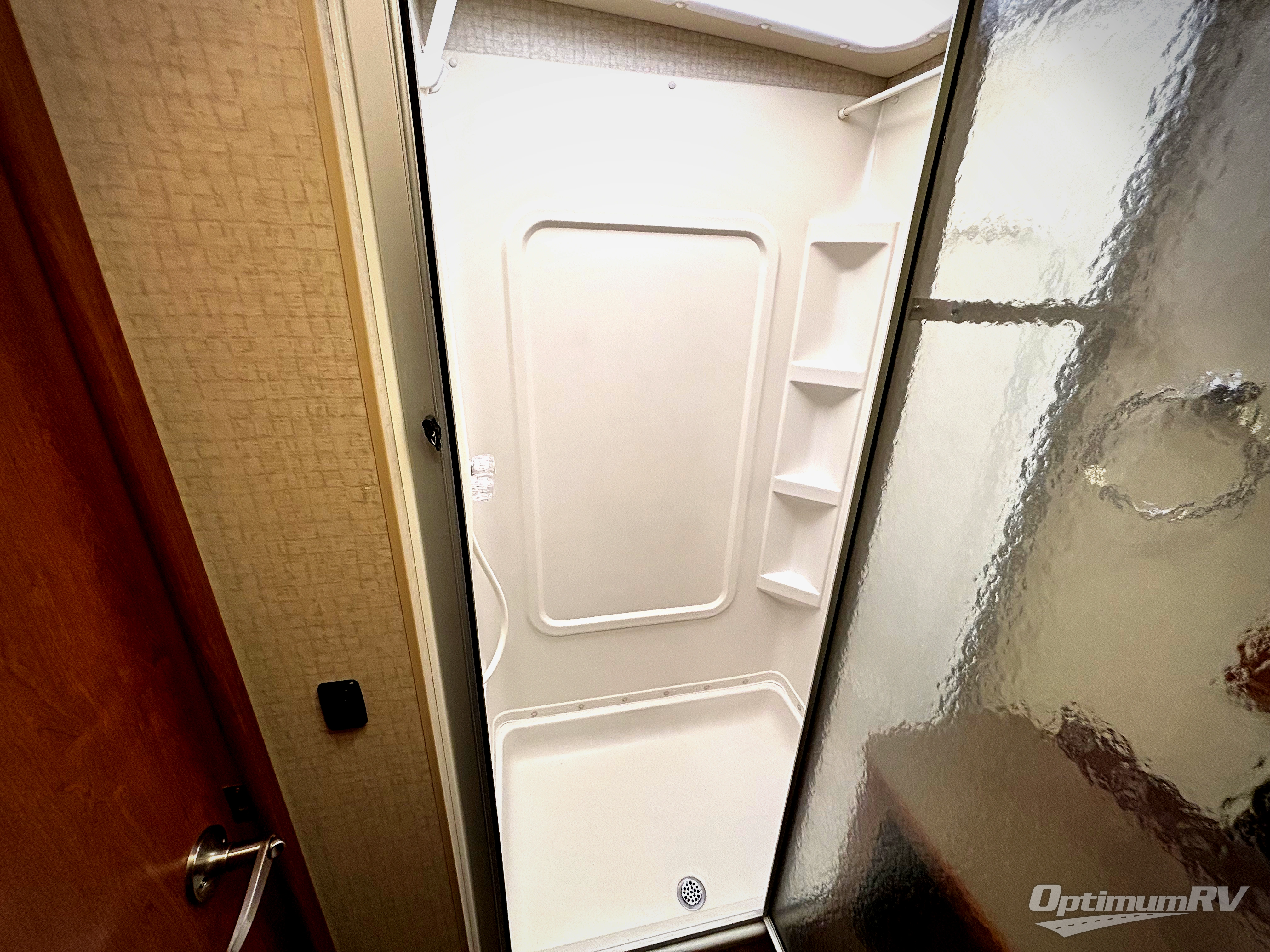 A complete bath adds another travel convenience that makes this home on wheels perfect for all of your adventures. The bath offers a shower, toilet, and vanity with sink, plus overhead storage too.