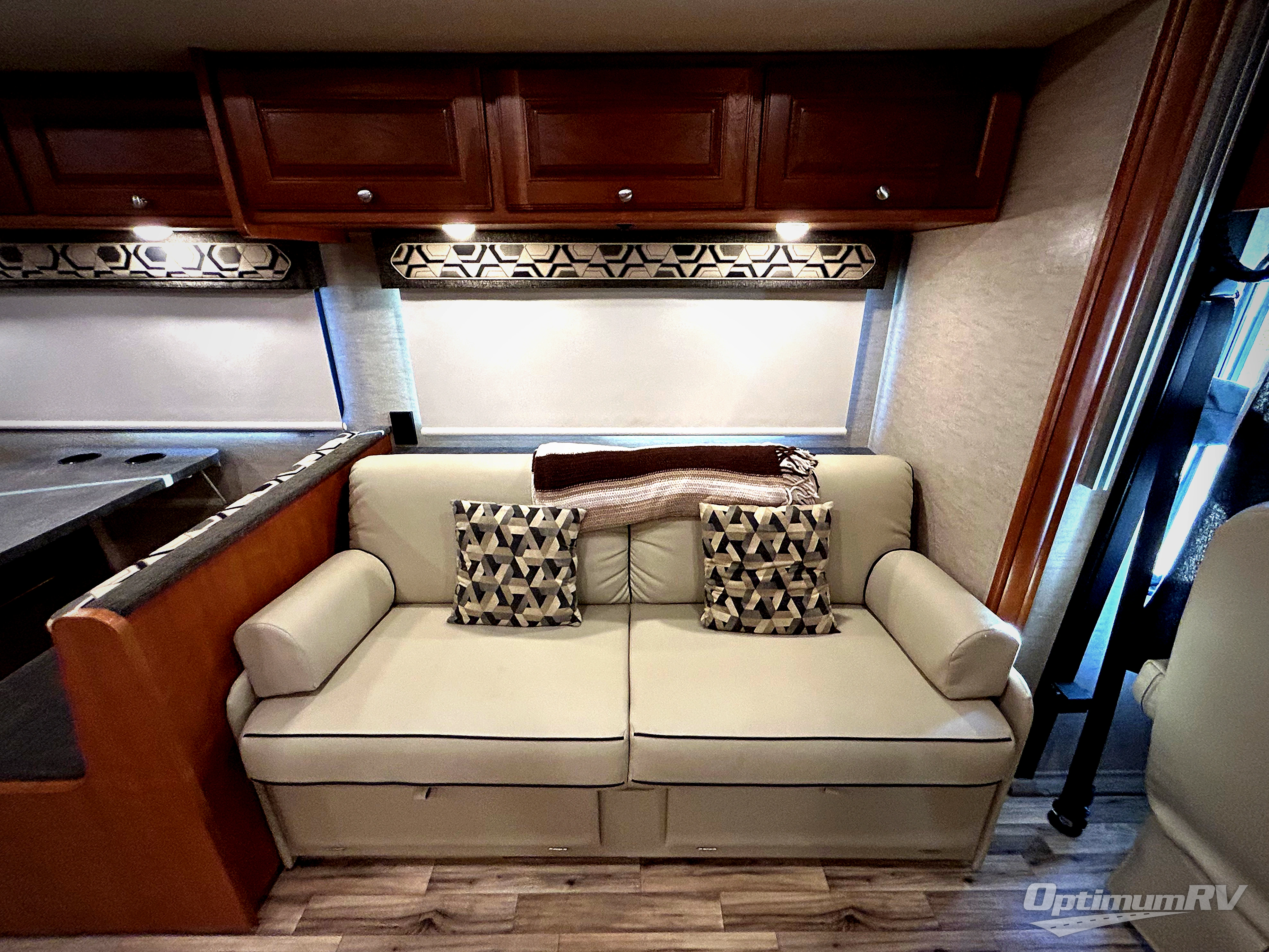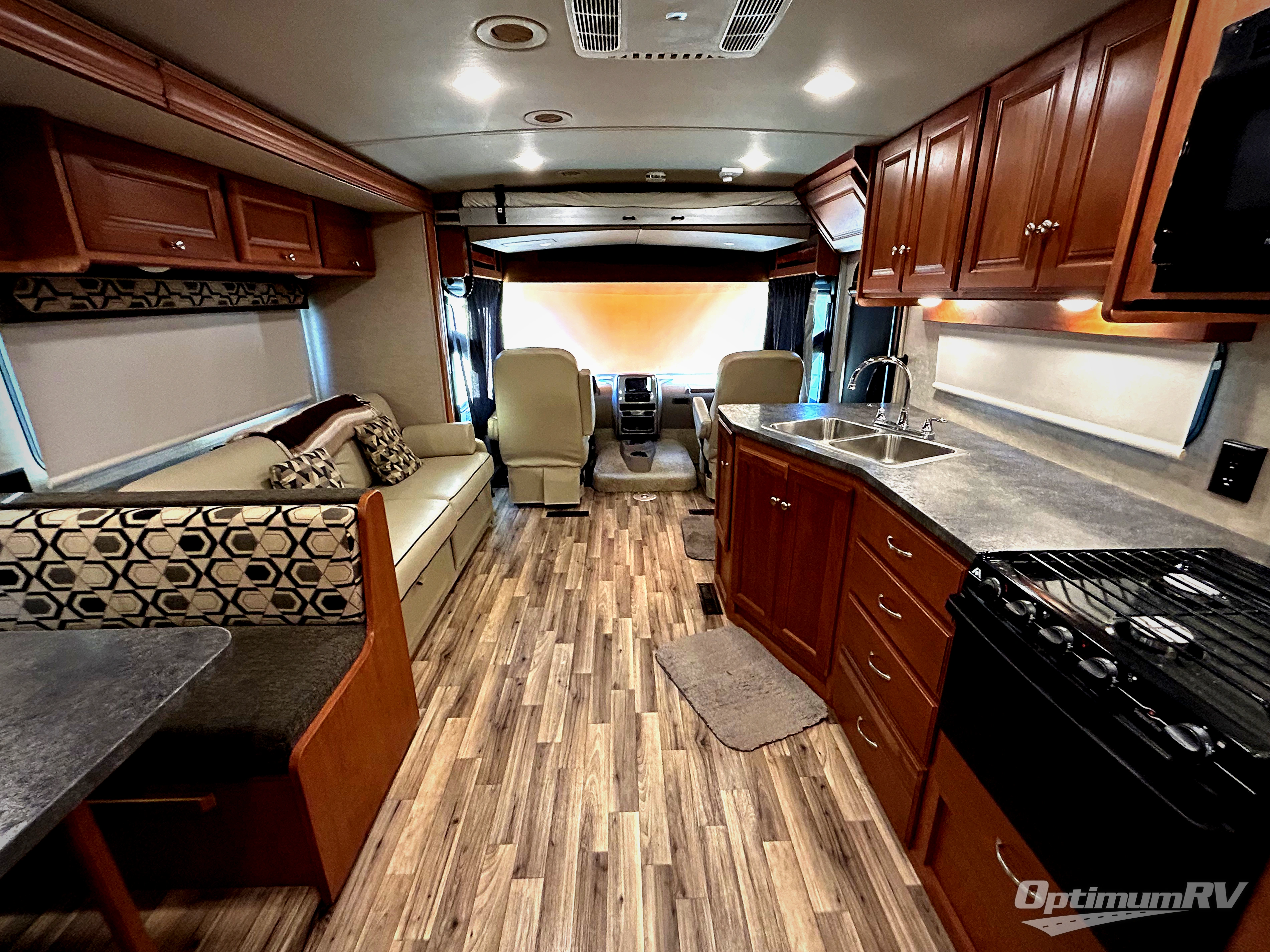 Step inside and notice how open the living area feels when the large slide out sofa/bed and 42" x 68" booth dinette is fully extended. If you swivel the front driver and passenger seats around you can create a very nice lounge space for family and friends to enjoy. You will find in this area five sets of seatbelts between the sofa and dinette seating so your rear traveling passengers will be safe. You will also find a removable table between the front cab seats which is great when parked. There is an optional 48" x 80" StudioLoft bed that can be added which is powered for ease of raising and lowering if you think you may need the added sleeping space. Also, you are sure to enjoy the 40" flat screen TV just off the dinette slide which is viewable from any space in this front area.