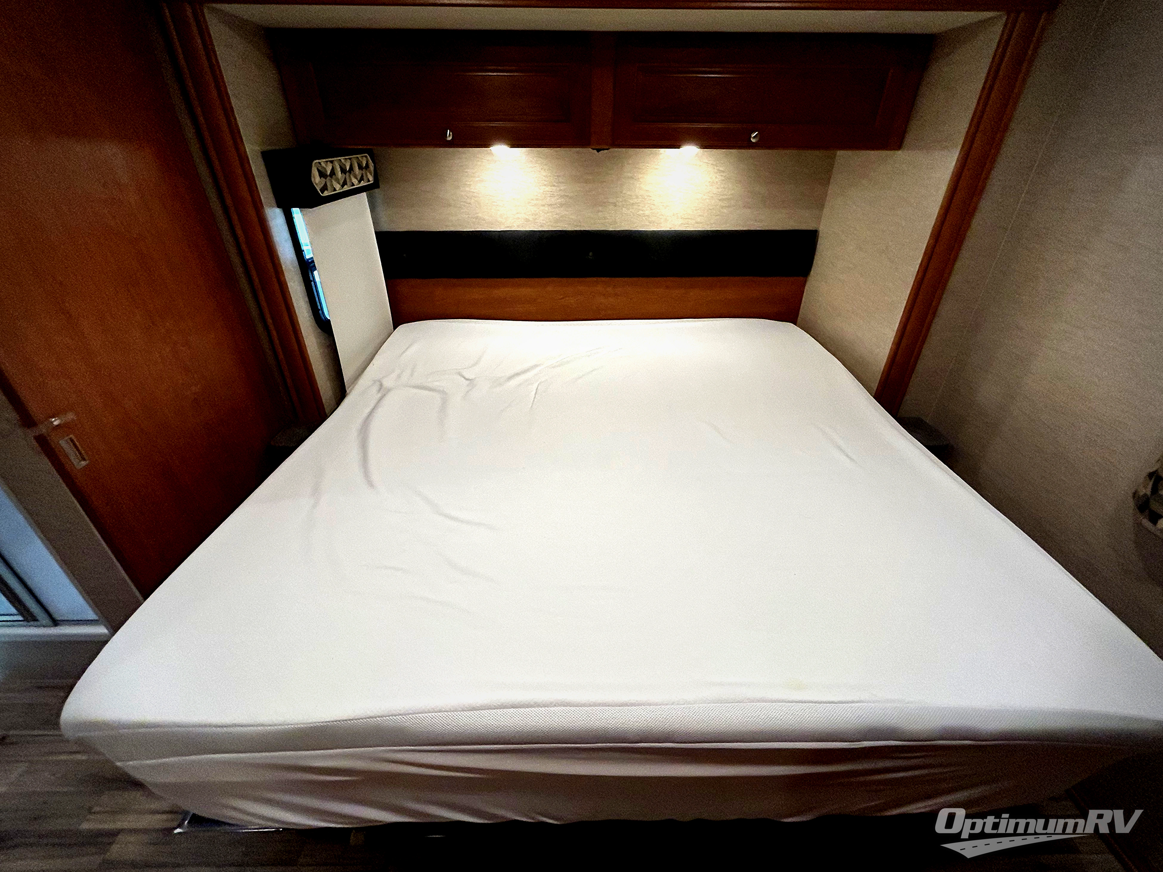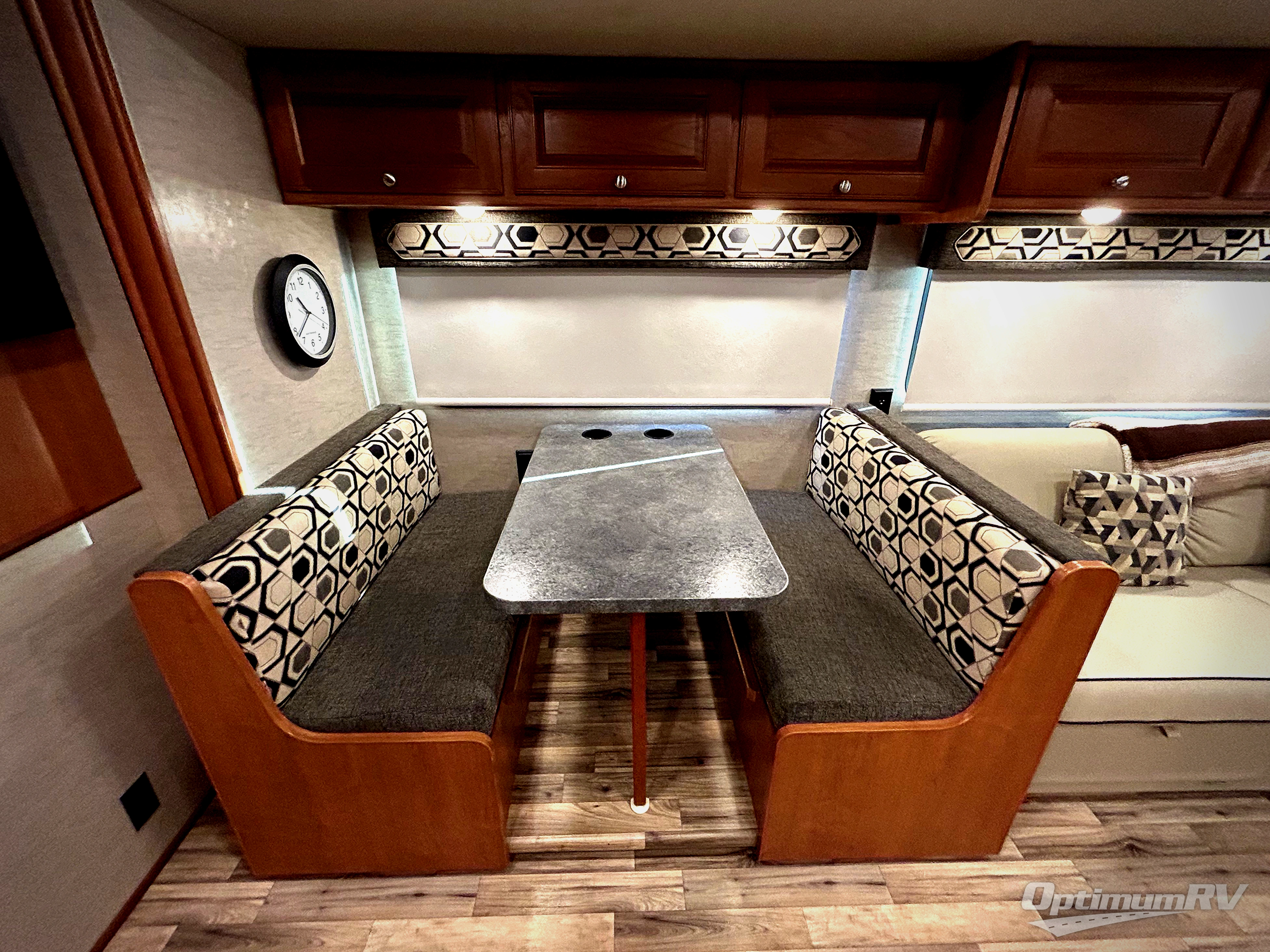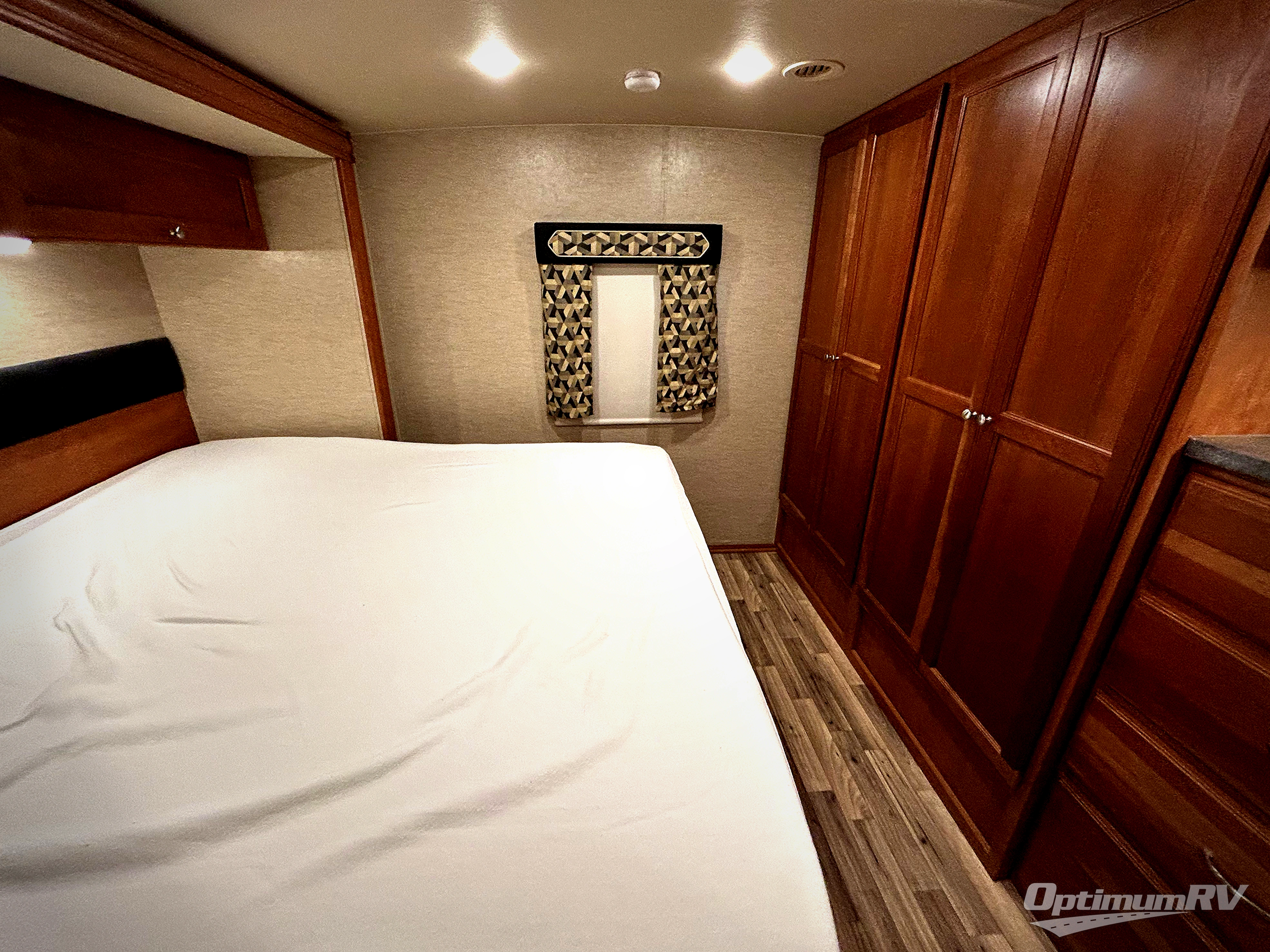 A sliding door leads into the rear private bedroom where you will enjoy a great night's rest on a king size bed that slides out and provides a bit more walking around space inside the room. There are nightstands on either side of the bed, plus overhead storage for your things. Opposite enjoy a wardrobe for all of your clothing storage, and a chest of drawers with a space for an optional TV for your viewing pleasure. Catch the tale end of your TV show or movie all snugged in bed with this choice, plus so much more!