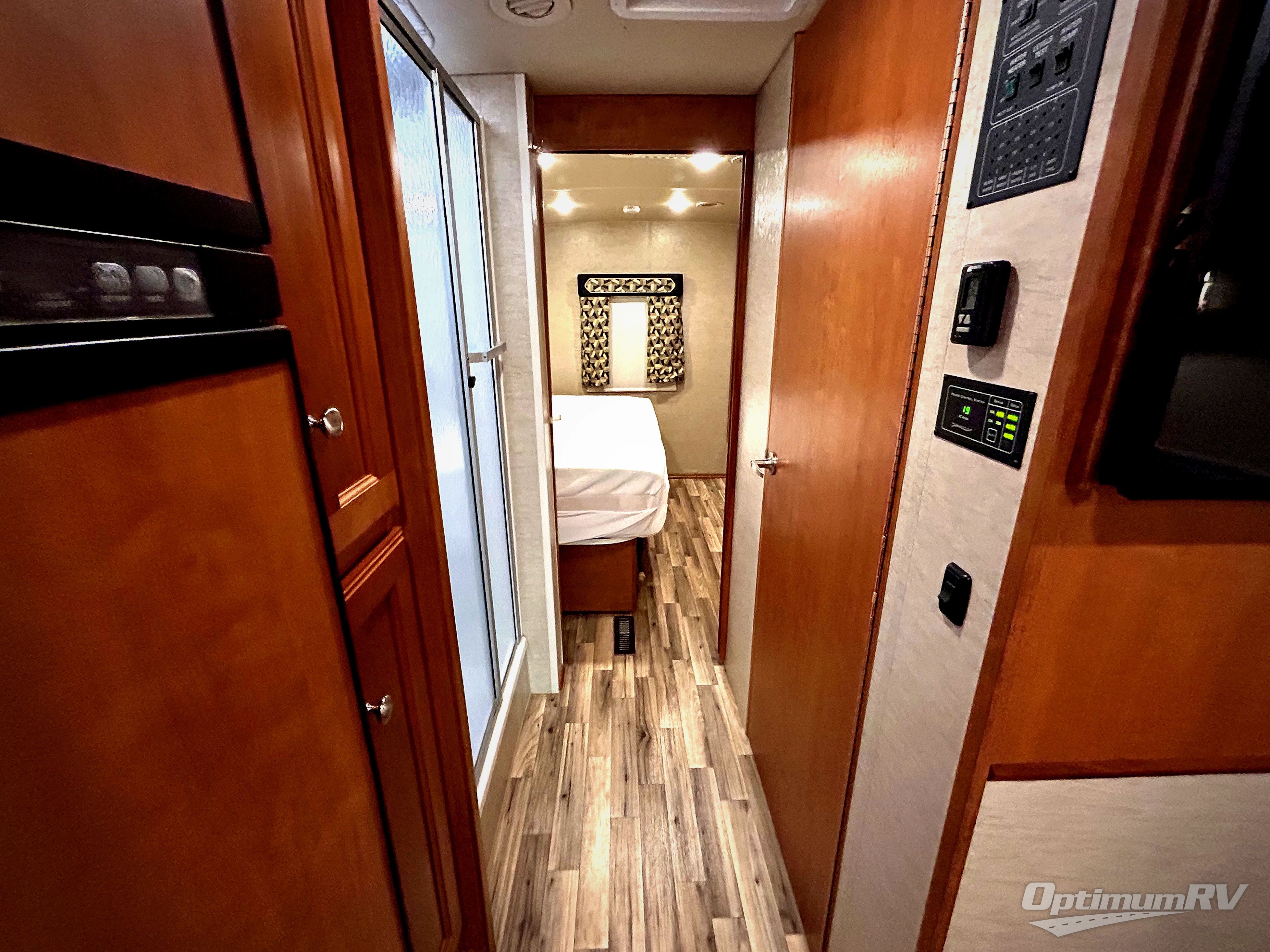 Continue on back and find a split bath that includes a shower on your left, and private toilet area with wraparound vanity and sink on your right, plus overhead storage.