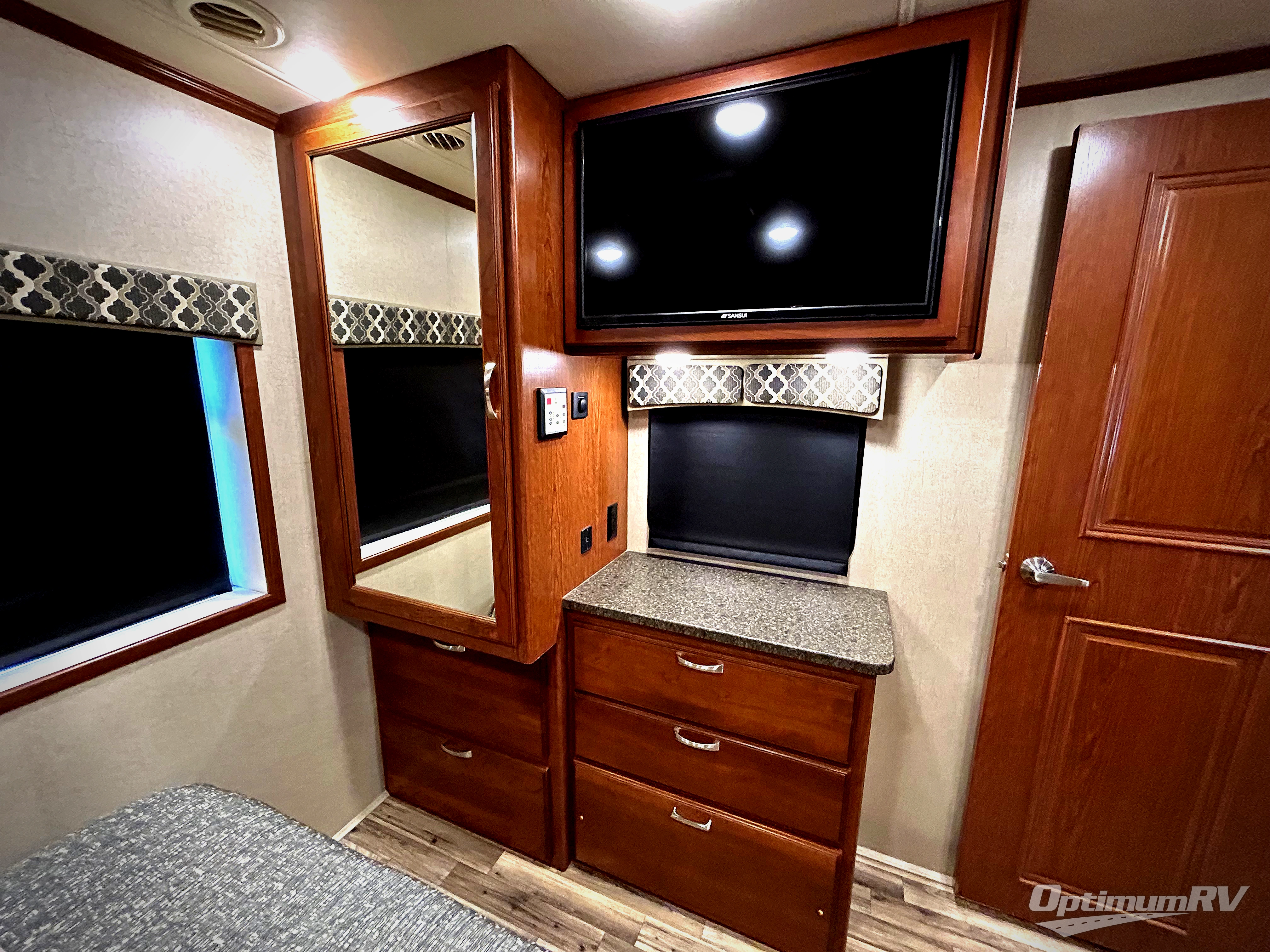 In the rear bedroom find a slide out with a king bed, and overhead cabinet. Across from the bed there are two wardrobes and a TV.