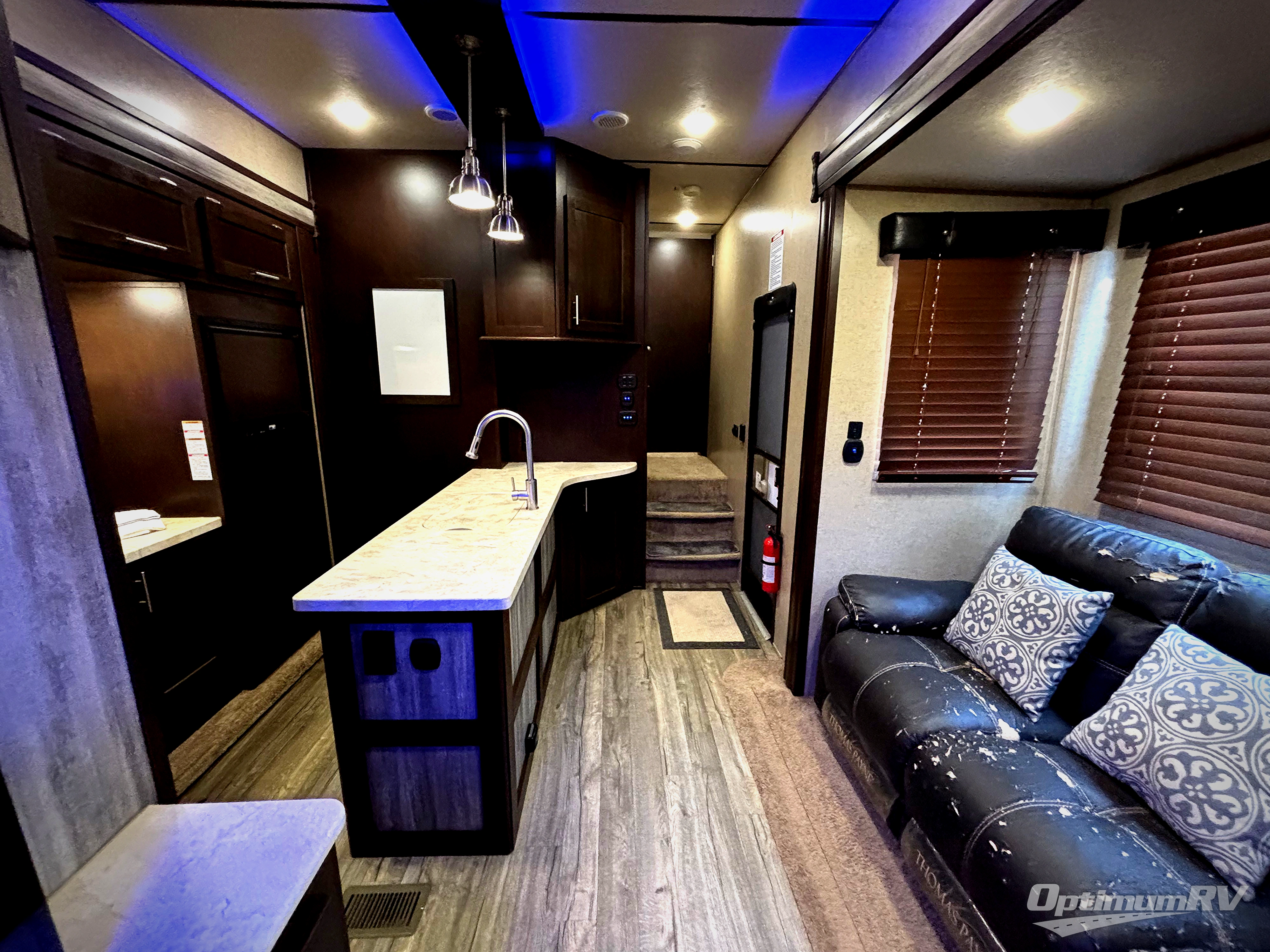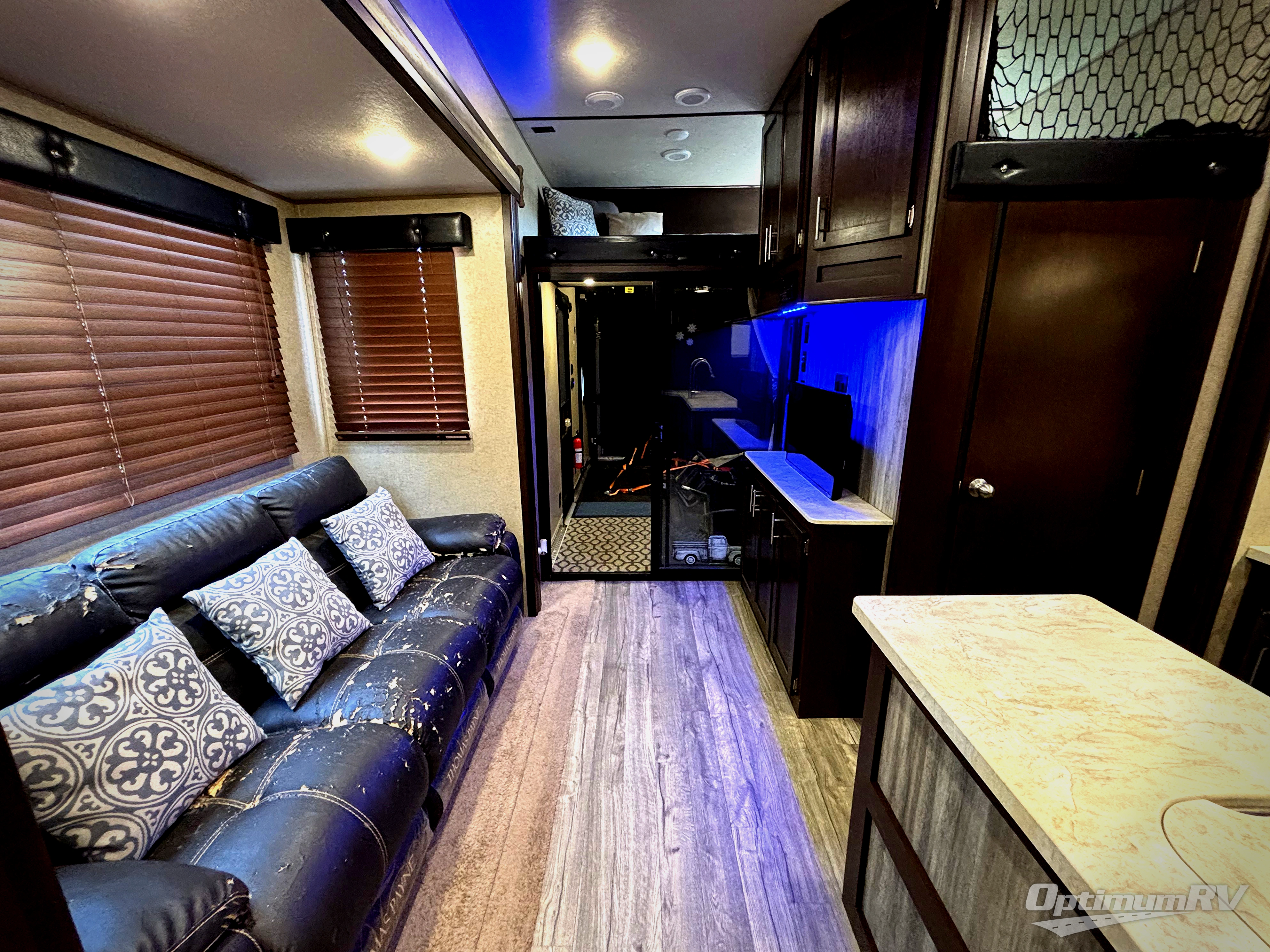 Come see just how fun and easy any camping trip can be with this double slide out Cherokee Wolf Pack 325PACK13 toy hauler fifth wheel. With the 13' of cargo space you can bring along a few dirt bikes, an ATV, or a four wheeler. After your gear is unloaded then set up the sofas. Above the sofas there is a Happijac power bed which offers sleeping space for two. Off of the cargo area there is a convenient half bathroom where you can clean up before coming into the main living area. Overlooking the kitchen and living area is the loft with a queen bed. At night you can retreat to the private front bedroom which features a queen bed with storage below and more!