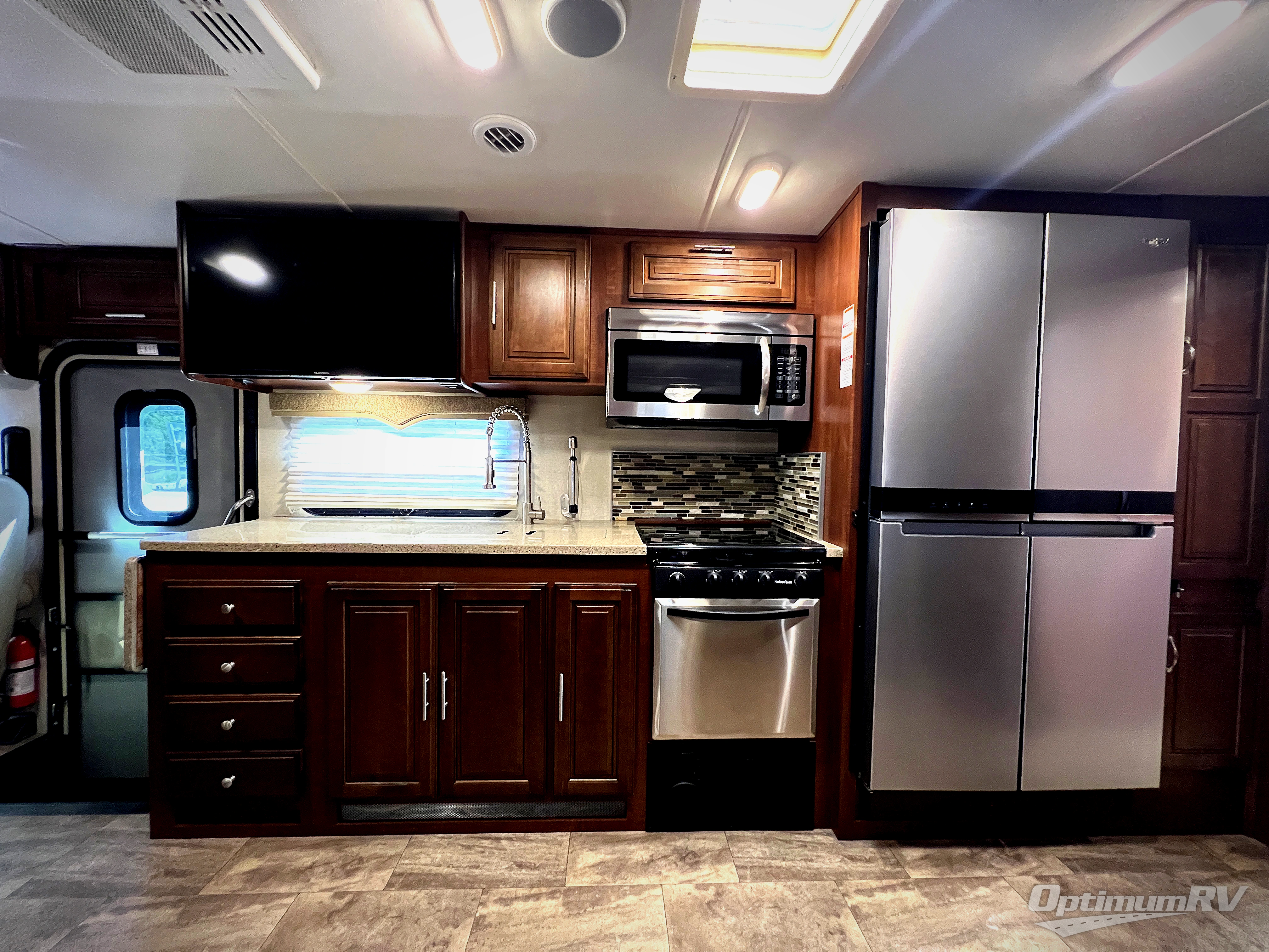 For comfort and style you will want a Forest River Georgetown 5 Series GT5 class A motor home. Along the exterior there is a "Super Storage" rear cargo compartment, an outside shower, as well as a stylish fiberglass front cap with lighted logo, LED accent lights and automotive bonded front windshield. As you step inside be prepared to be wowed from the stainless steel three-burner cooktop with oven to the solid surface countertops. In the cockpit there is a custom dash with ABS side consoles, drink holdrers, and a 110V outlet/USB. You will also enjoy the convenience of the MyRV touchscreen with wireless technology and more!