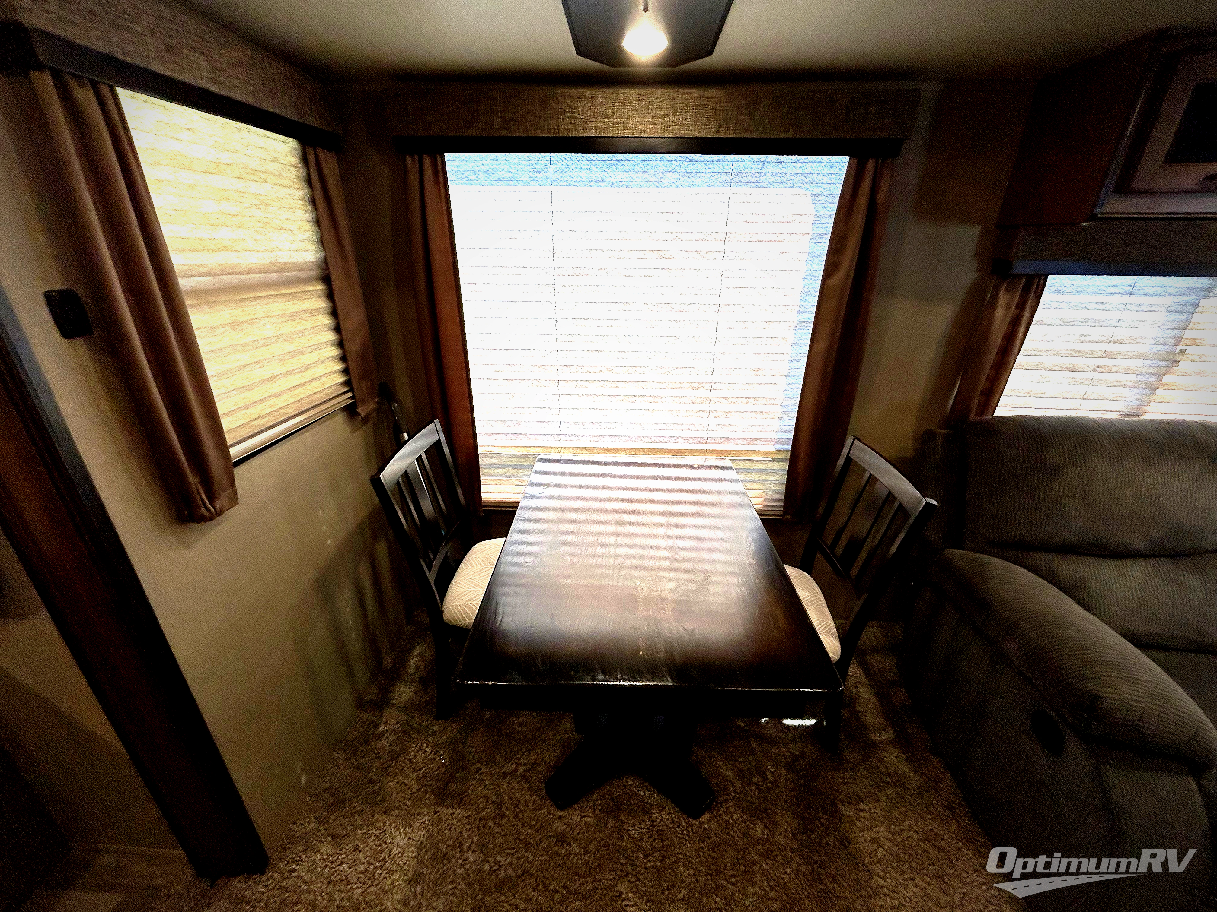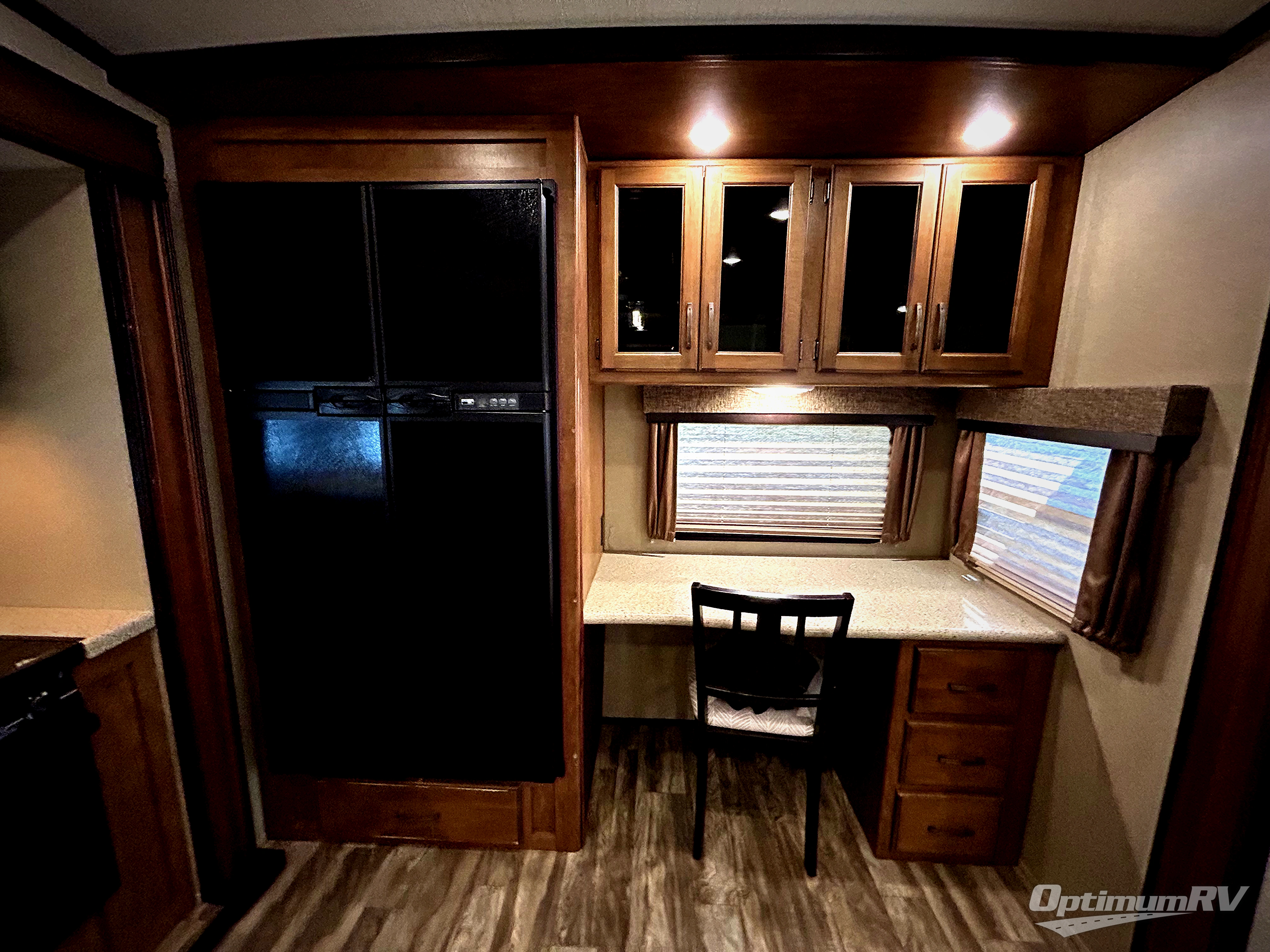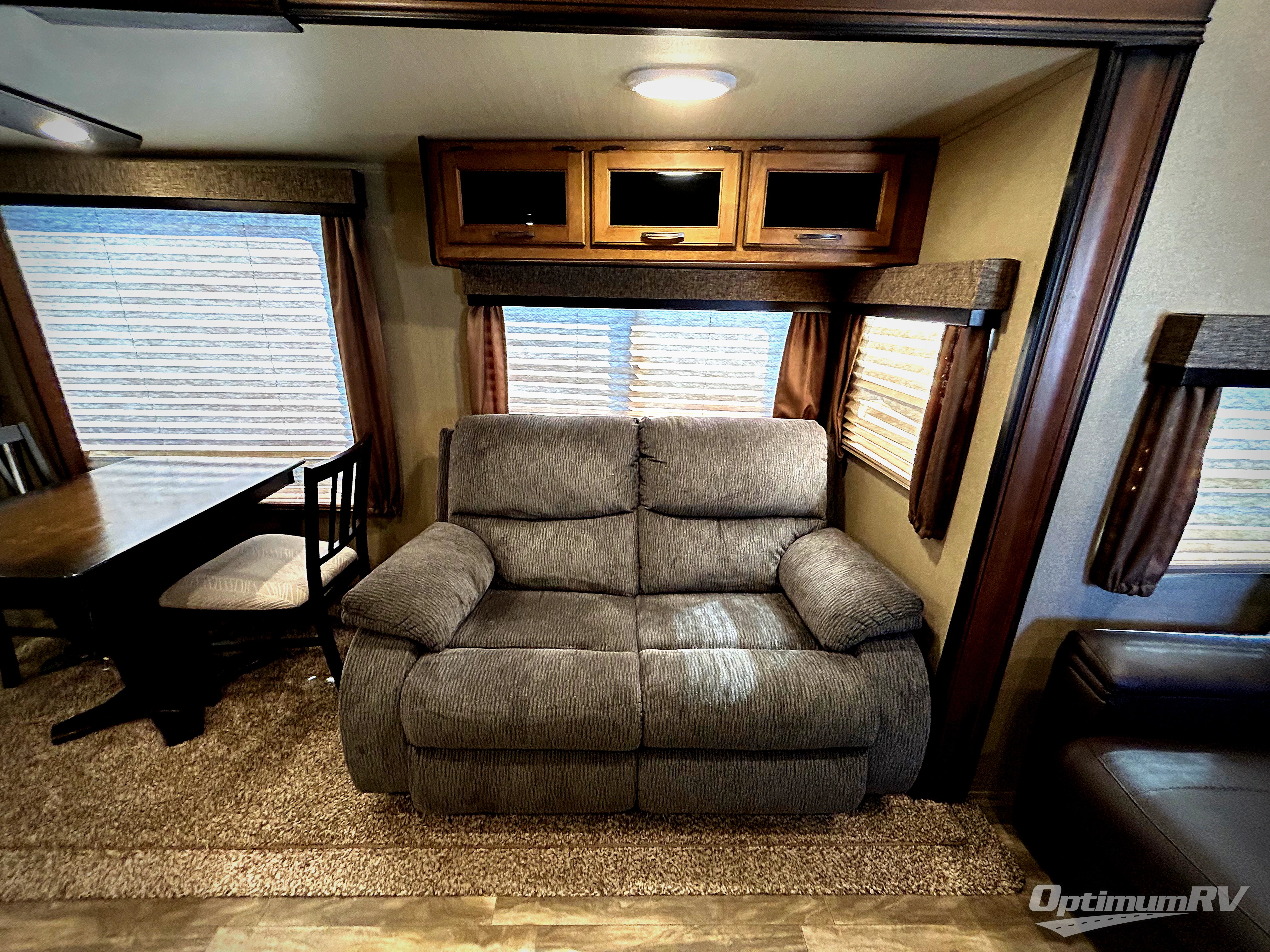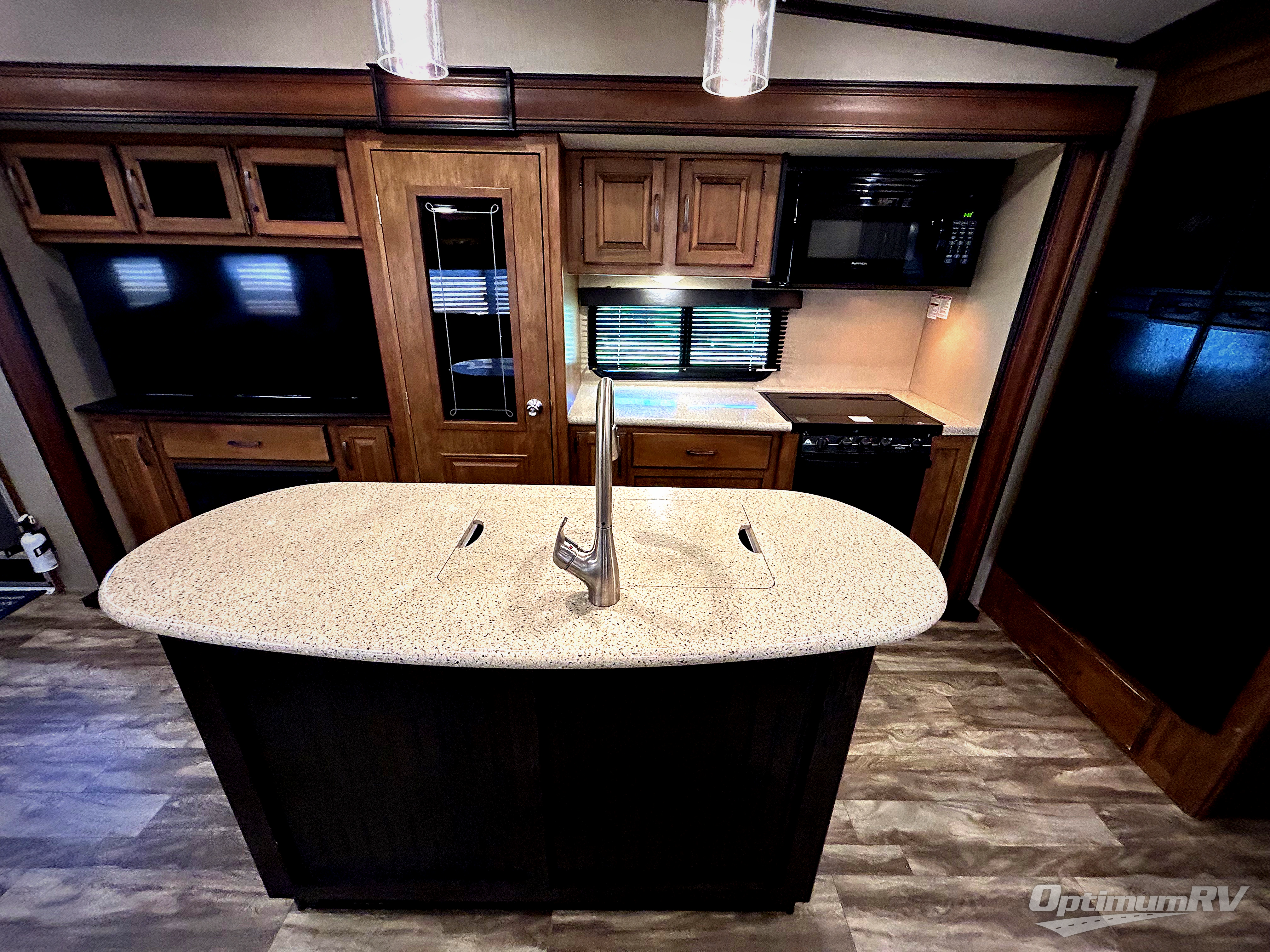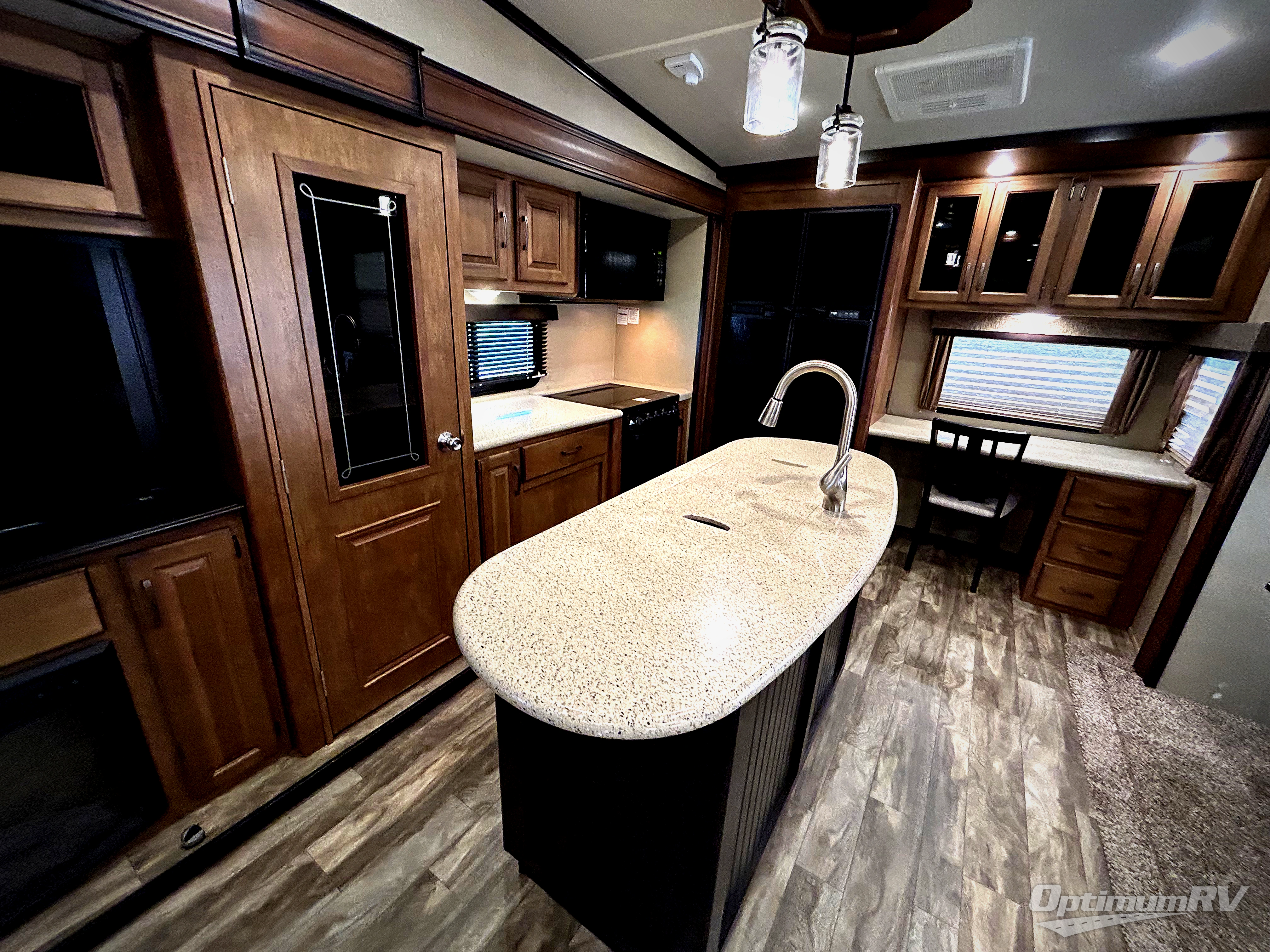 To your immediate left of the entrance you will see an entertainment center with 40" TV and fireplace, a pantry, counter space, three burner range, and a convection oven inside the first slide out. An 8 cu. ft. refrigerator with a 12 cu. ft. option, and a desk with chair and overhead storage can be found along the rear wall. There is a center kitchen island which includes a large sink for easy food prep and cleanup. The second slide along the road side wall features theatre seating for two, and a booth dinette with a free standing dinette option. There is also a hutch with overhead cabinets including a tri-fold sofa below along the interior wall providing more seating and storage.
