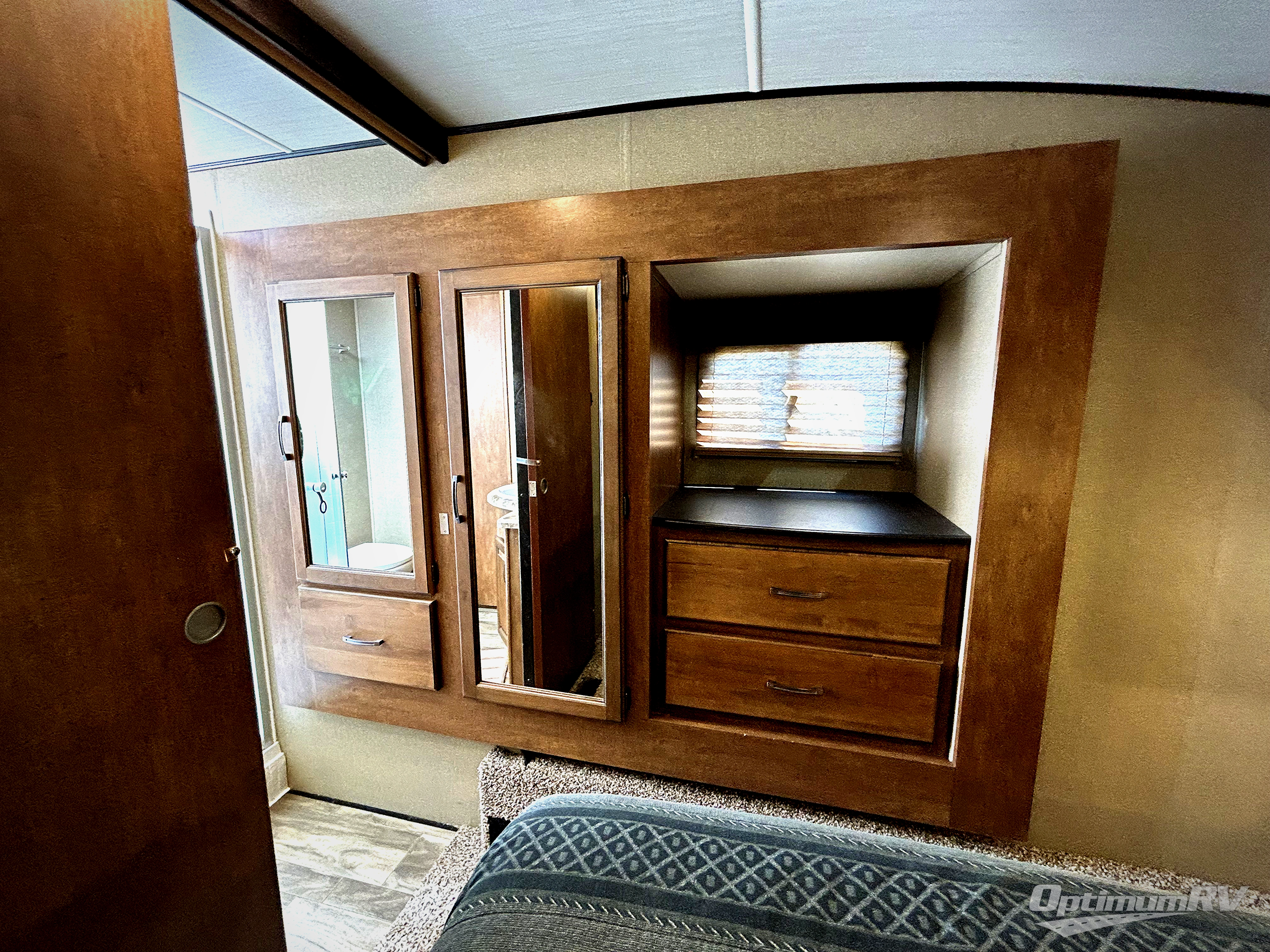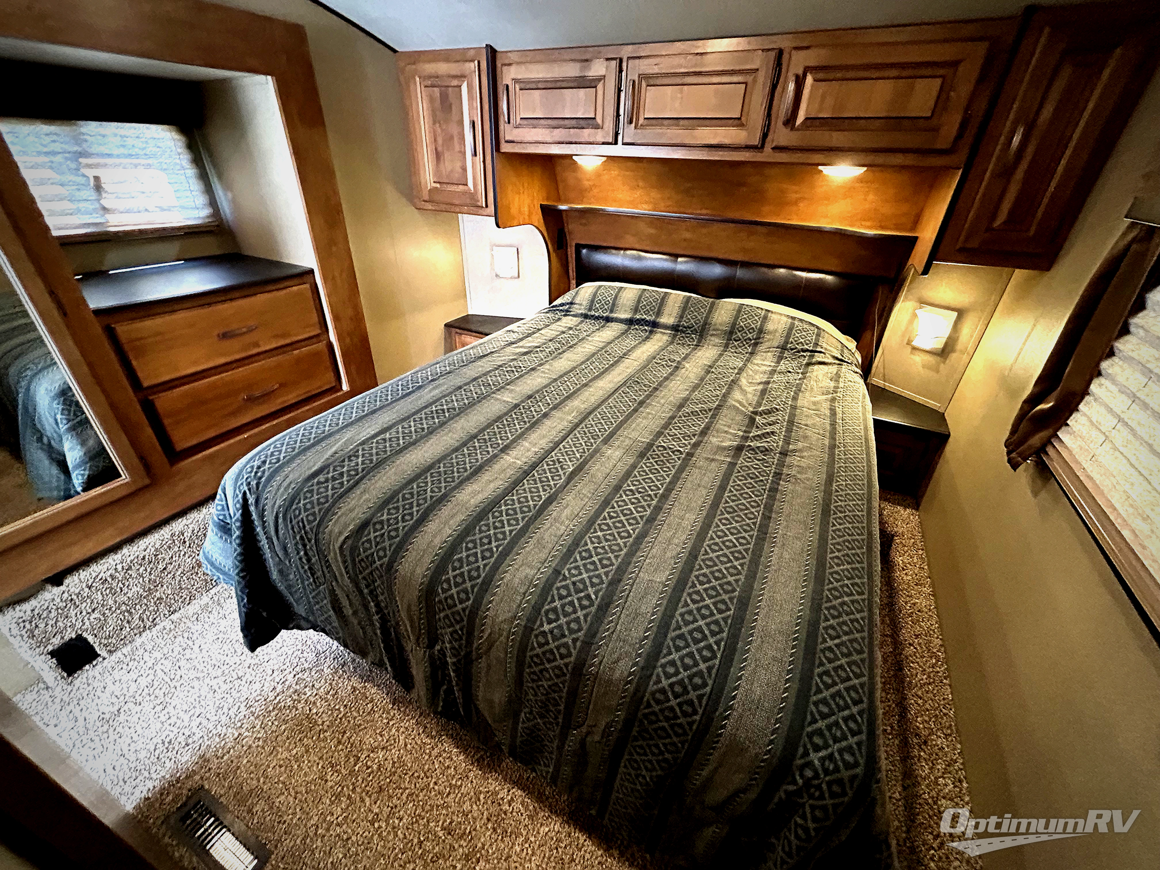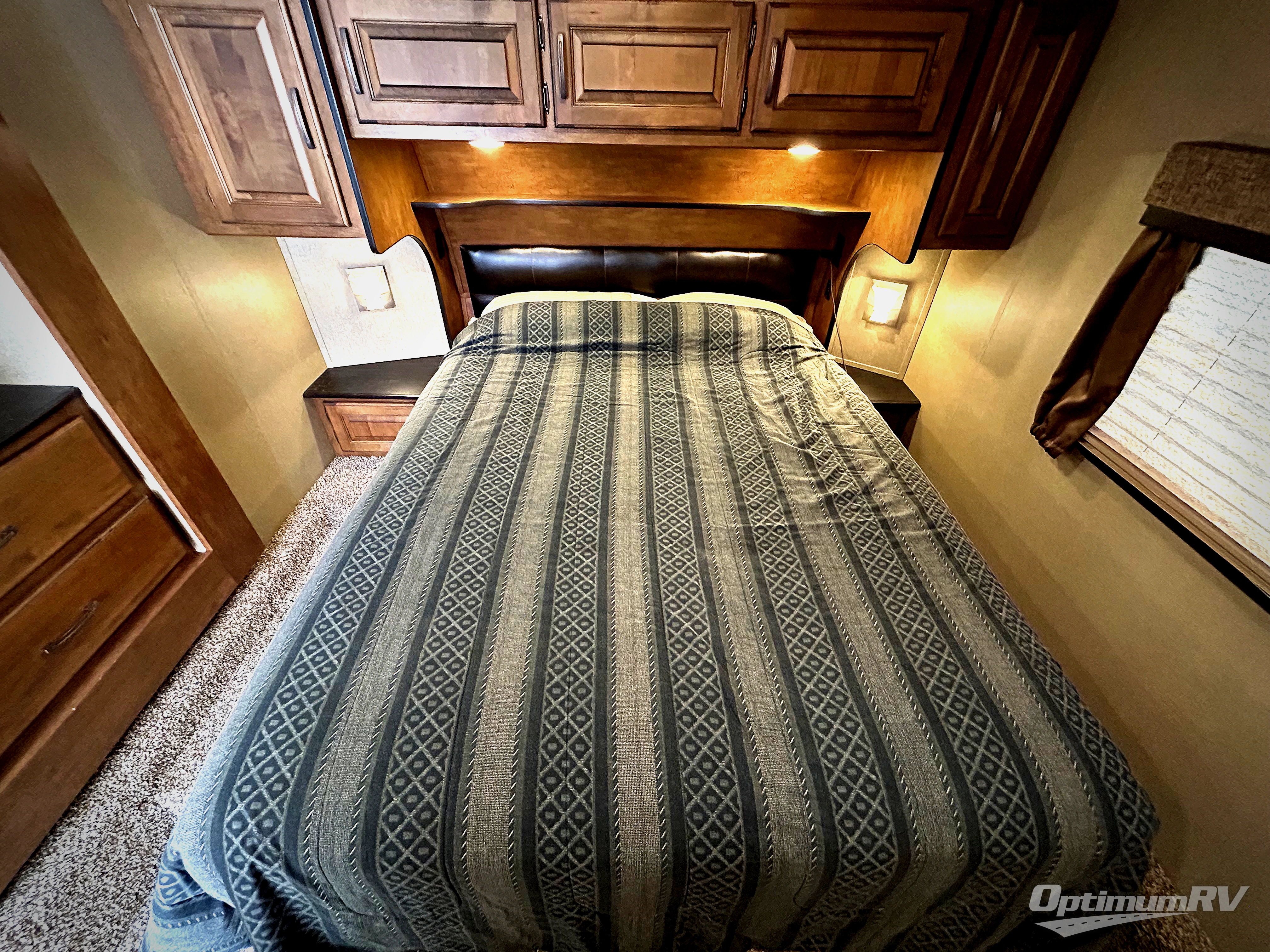 Enjoy a restful night's sleep in a comfortable queen bed including overhead storage cabinets and nightstands beside the bed. There is a slide out with a wardrobe, drawers, and a linen cabinet that falls within the bath mentioned above.