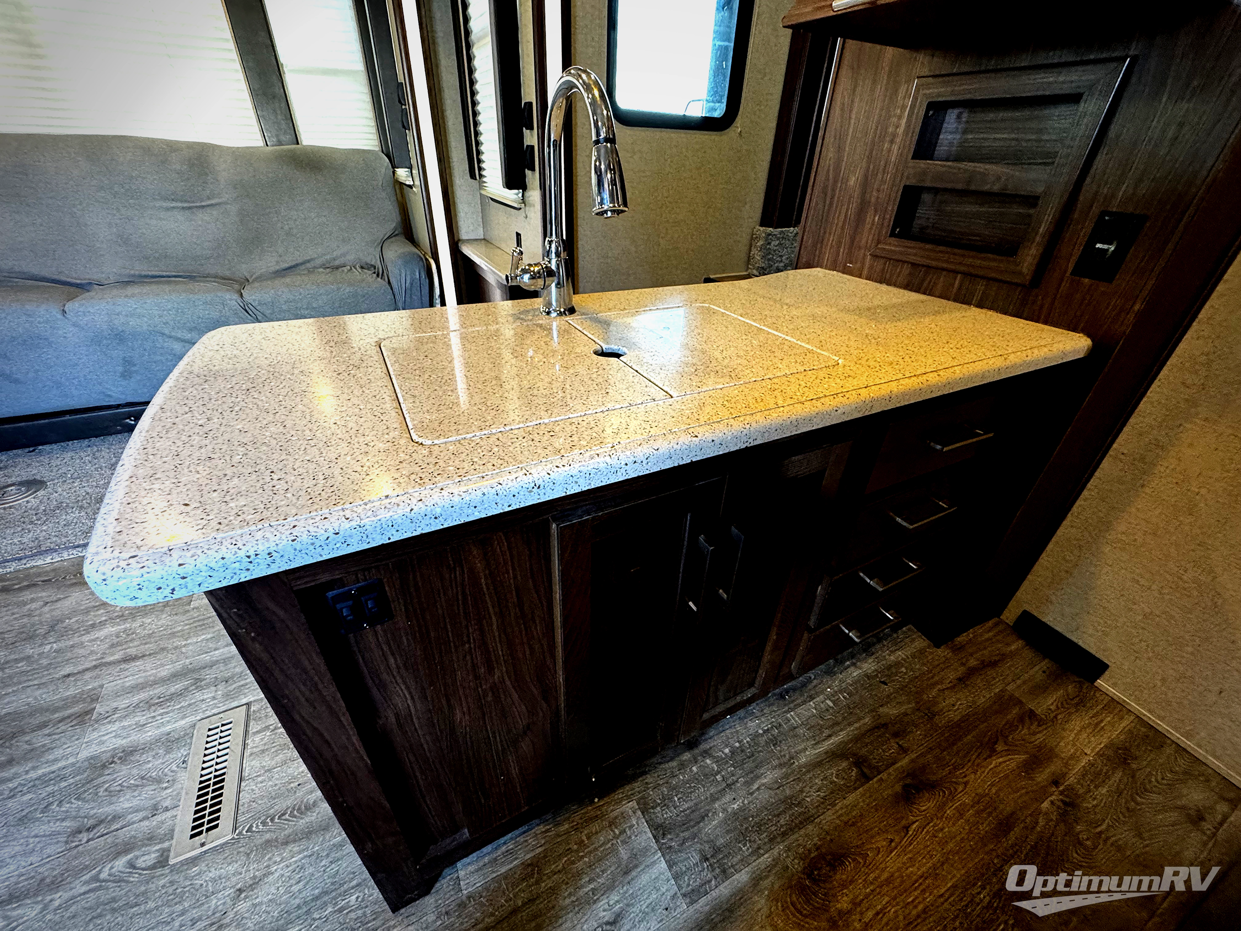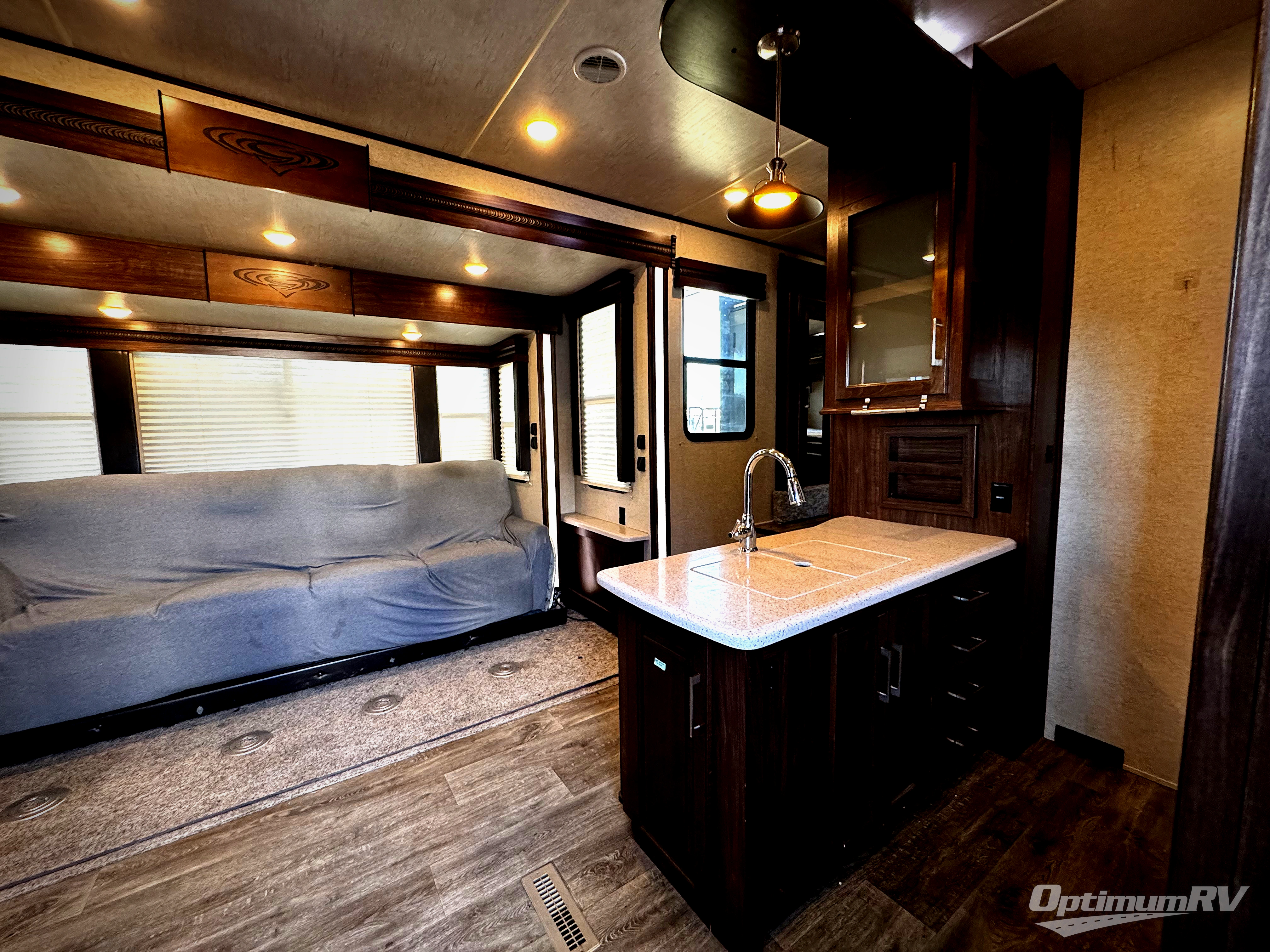 The Cyclone toy hauler fifth wheels by Heartland RV are not your ordinary toy hauler. These models have beautiful cabinets and plenty of comforts throughout such as high quality residential furniture, a 55” LCD HDTV flat screen TV, cable TV and satellite hook-ups, plus a separate DVD/CD/MP3 Bluetooth stereo for the garage and exterior. Along the exterior there are stunning graphics and you will enjoy the view out of the large bedroom picture windows. The two side awnings with LED lights provide plenty of shade during the day, and at night you can grab a snack, your camp chair, and enjoy visiting outdoors just a bit longer. The ultra-light ramp door allows you to easily load your off road toys. In the garage you will also find an electric rear screen, decorative chair rail, plus built-in overhead cabinets with an entertainment center and more! You may even want to add the S5 Package which includes a 2nd fuel cell, 40" garage TV, solid surface counter top in the bedroom, central vacuum, 32" bedroom TV, and upgraded furniture with USB ports and built-in tables.