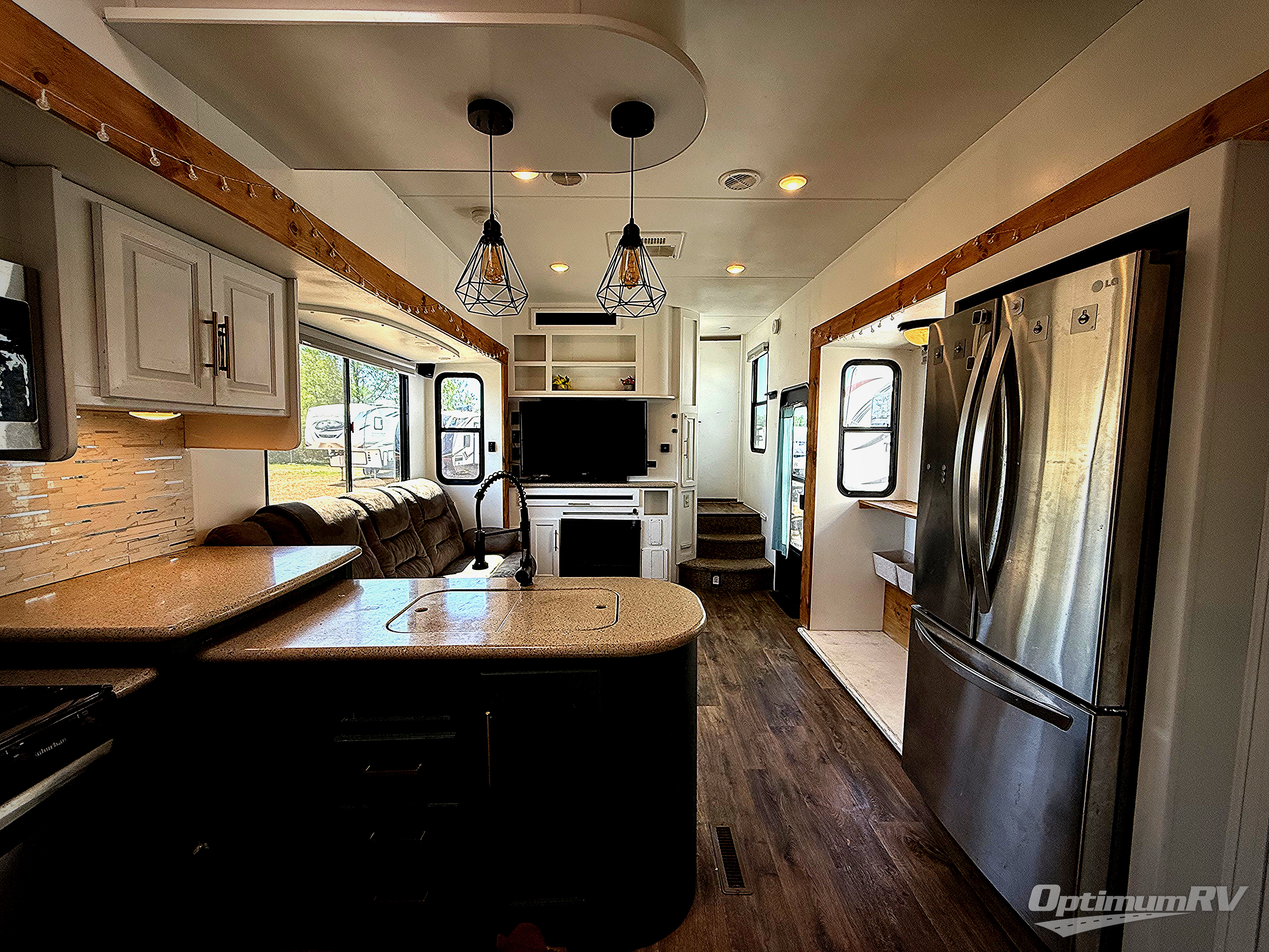 Find comfort and functionality throughout this Cyclone 4005 toy hauler fifth wheel by Heartland RV. This triple slide out model features plenty of room for your whole family from the 13’ rear garage with loft to the front bedroom which features a tilting king bed, a slide out, and plenty of storage space. At the top of the stairs is the main bathroom and in the garage you will find a half bathroom where you can easily clean up when you come in from playing outside. Also outside you will find a kitchen and a slide out TV, so now you can watch a movie out under the stars. Inside there are plenty of seating choices in the living area. From the sofa, lounge chairs, or the loveseat you can easily watch TV at the 55” LCD HDTV and more!