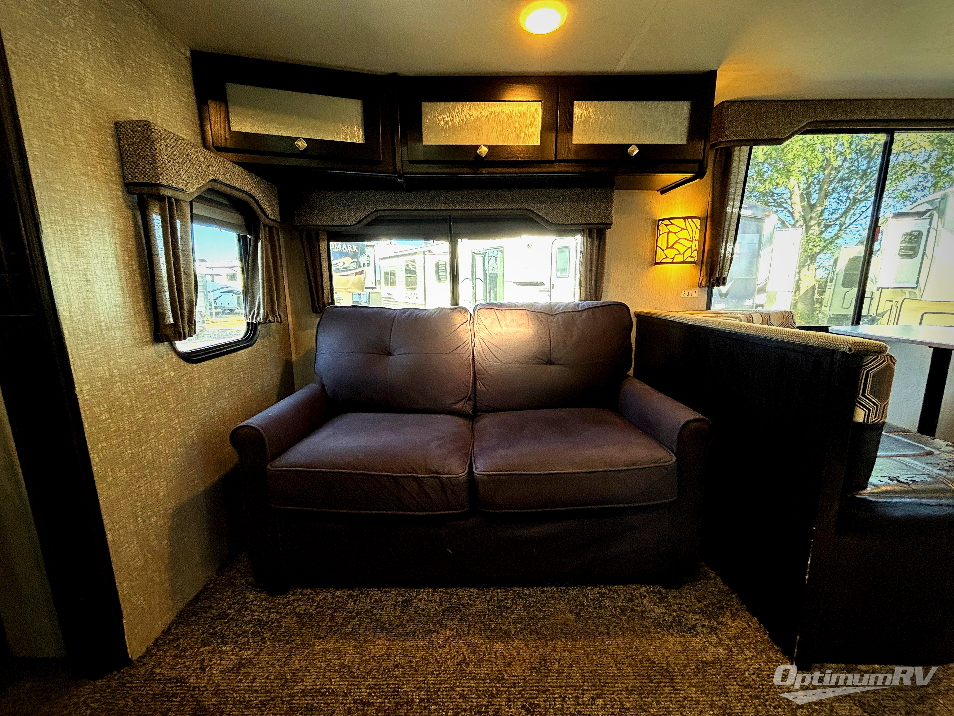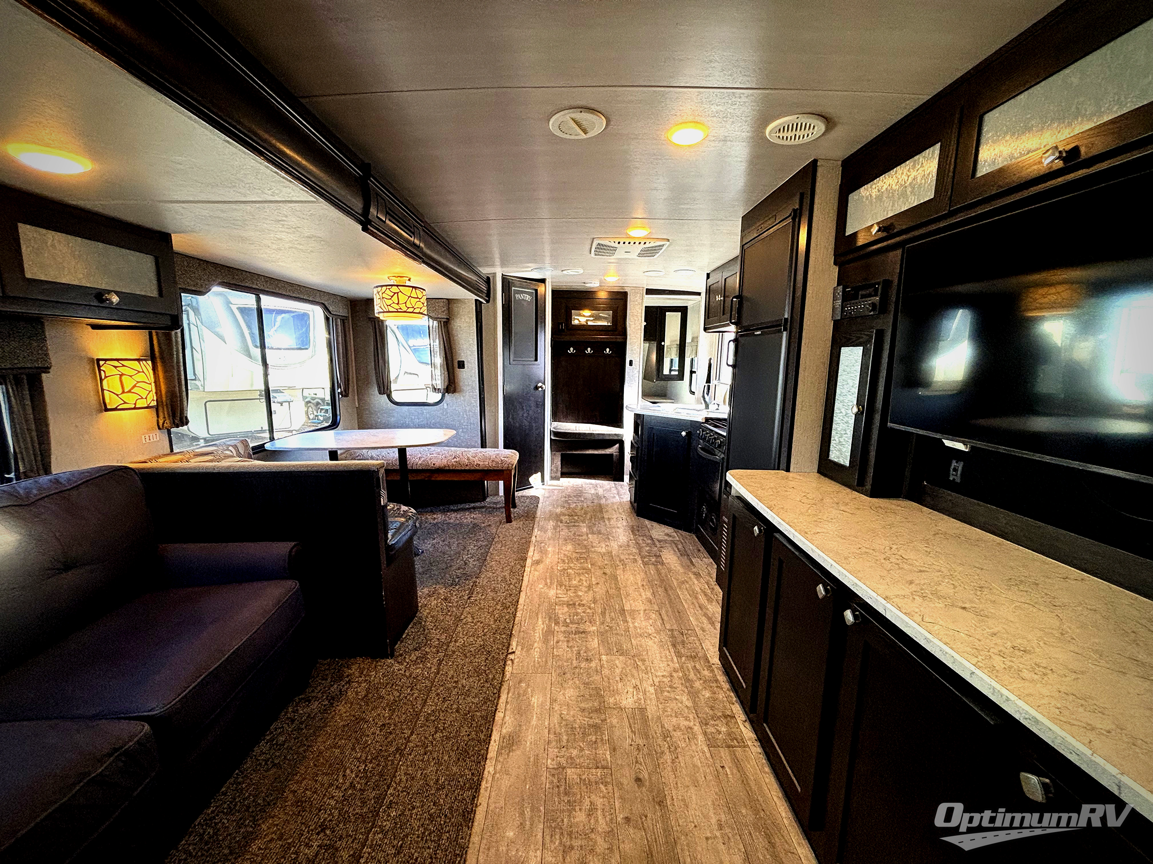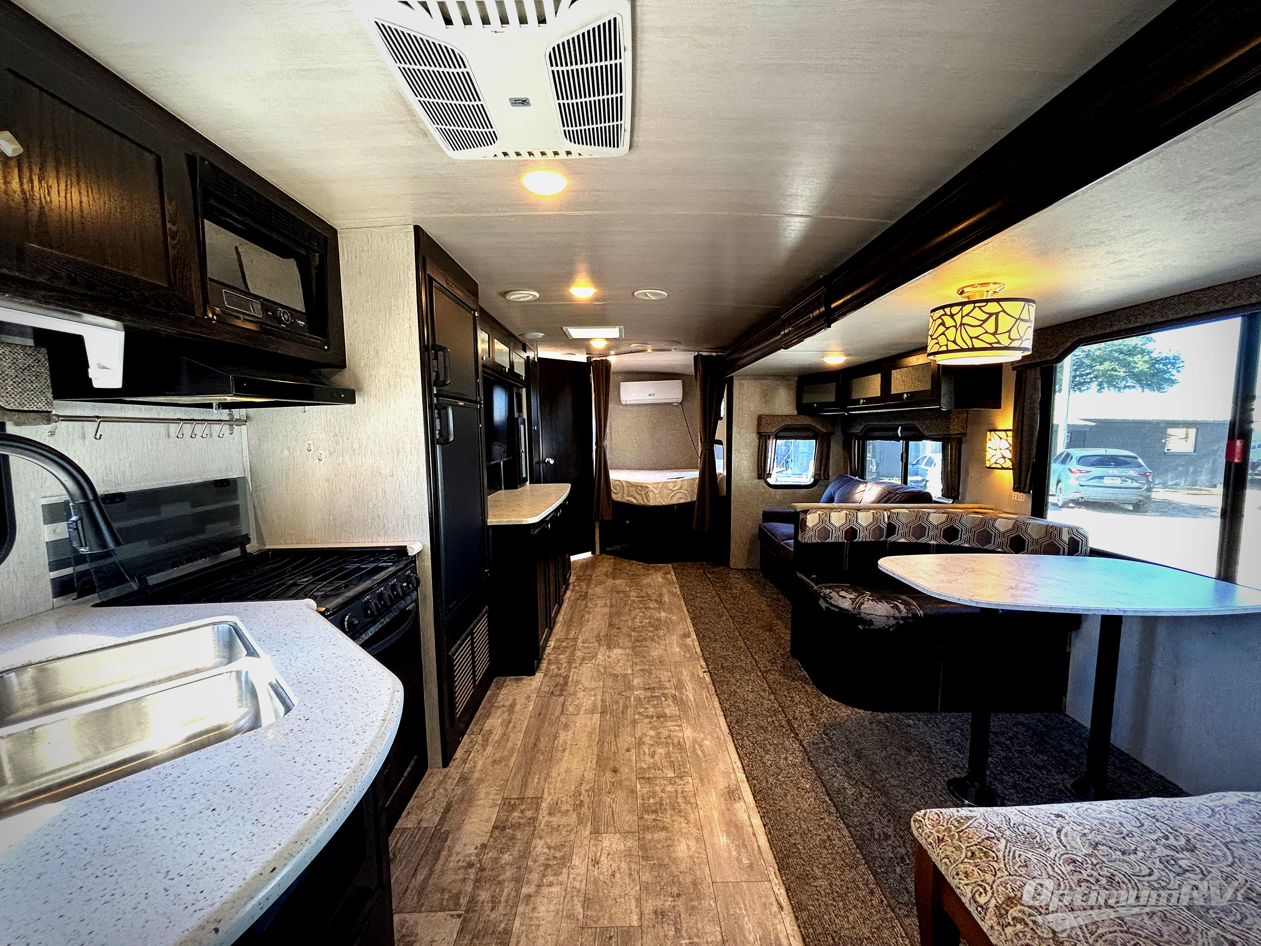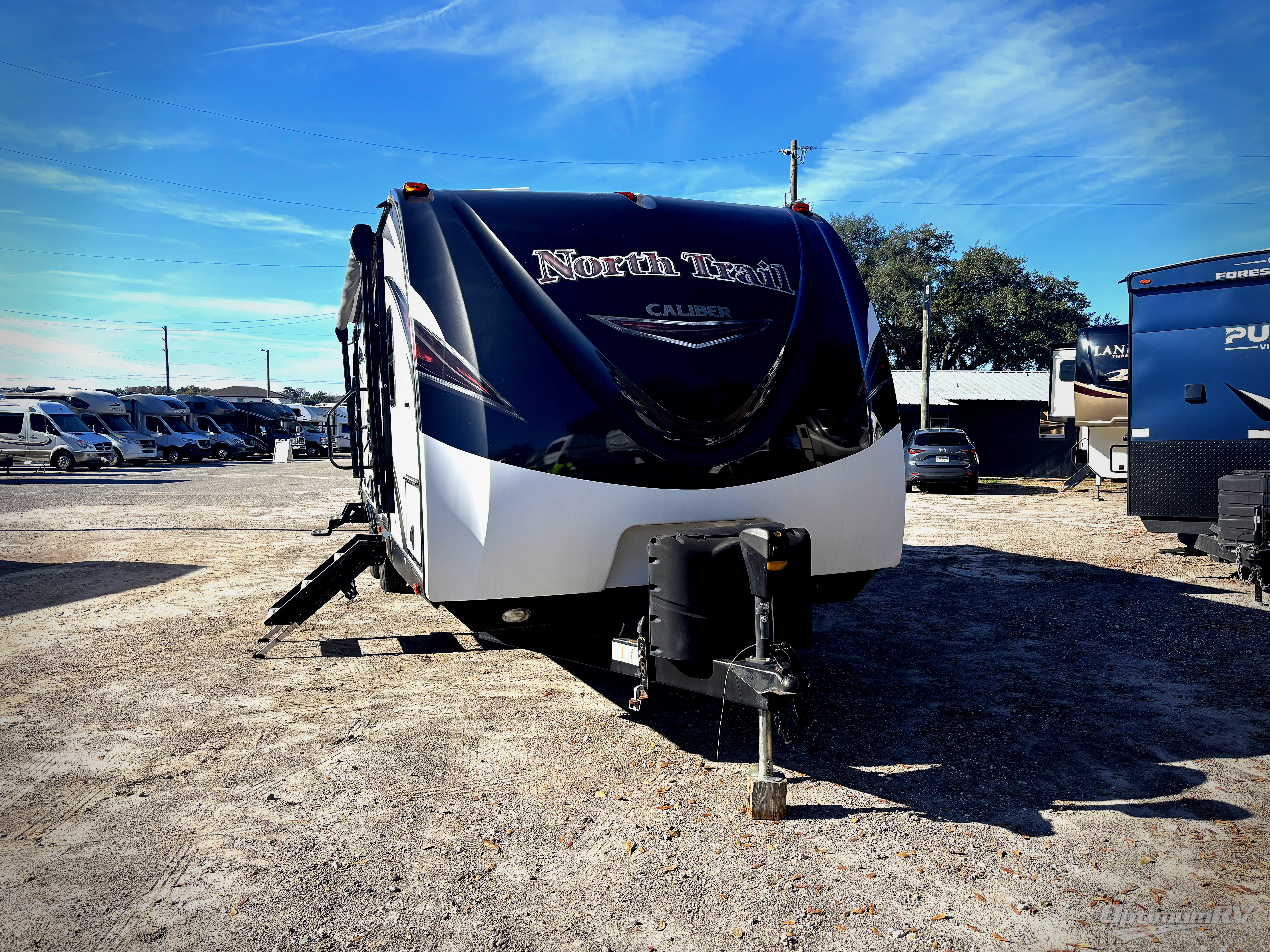 This camping season come choose to camp in this single slide out 31BHDD North Trail travel trailer! It is easier than ever to camp with your whole family or even a few friends since there is a set of double bunk beds in the rear. Enjoy your meals at the u-dinette and at night this area can convert into additional sleeping space. Mom and dad can retreat to the private front bedroom where there is a queen bed. You will find that this model has two entry doors - the front door leads into the combined kitchen/living area, and the rear door leads into the bathroom so you can easily access the bathroom from outside. With the outside kitchen you can easily prepare your dinner or lunch while watching your kids play! This North Trail travel trailer is also available in a Caliber Edition.