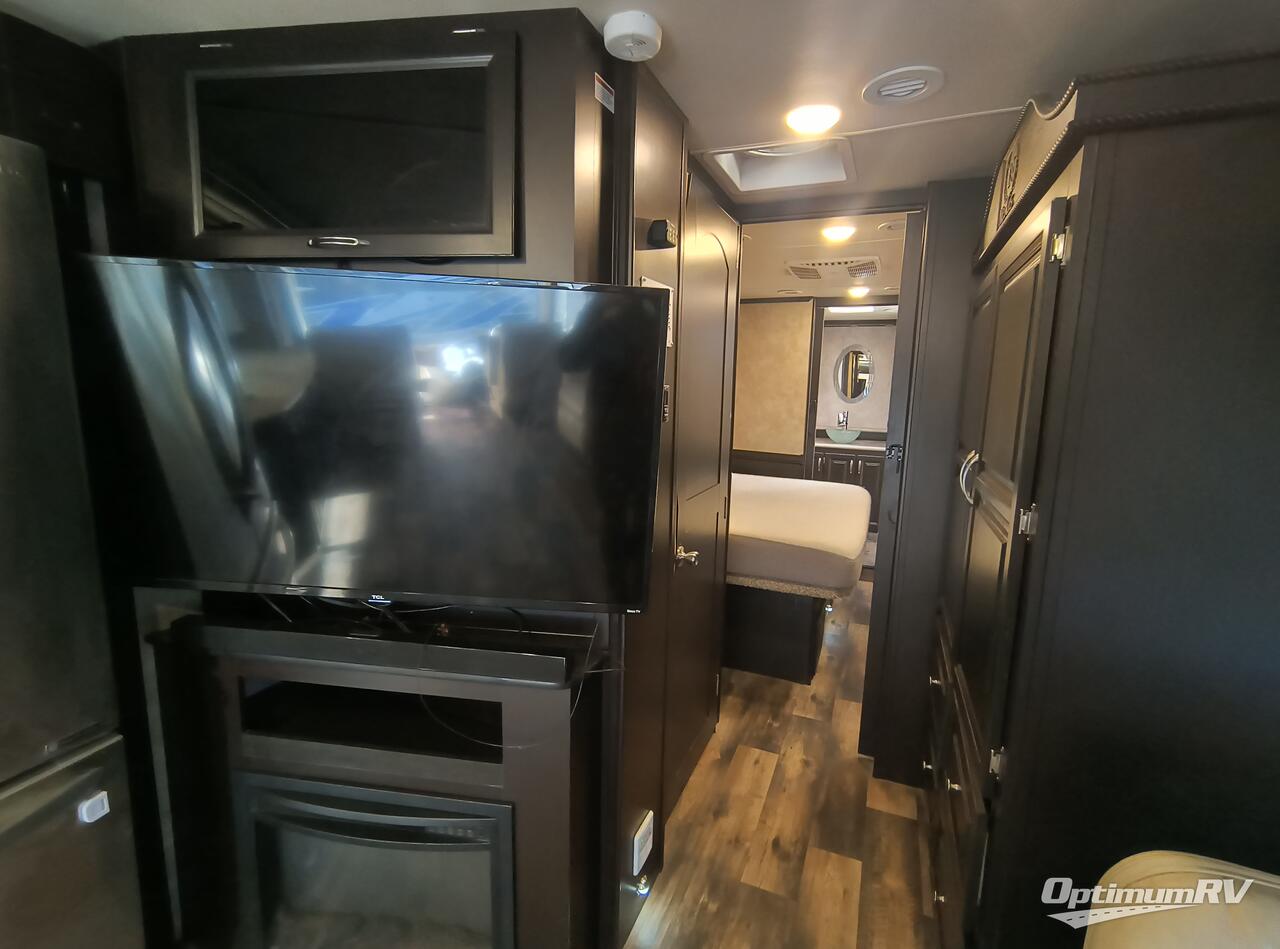 Slide the door back to enter the walk through bedroom. Inside you will find dual slide outs allowing more floor space. There is a wardrobe slide with an LED TV, and a king size bed in the opposite slide out. Slide the next door open to enter the rear full bath. You can enjoy a shower with seat, toilet, vanity with sink, and dual closets. You may choose to add an optional washer and dryer if you like.