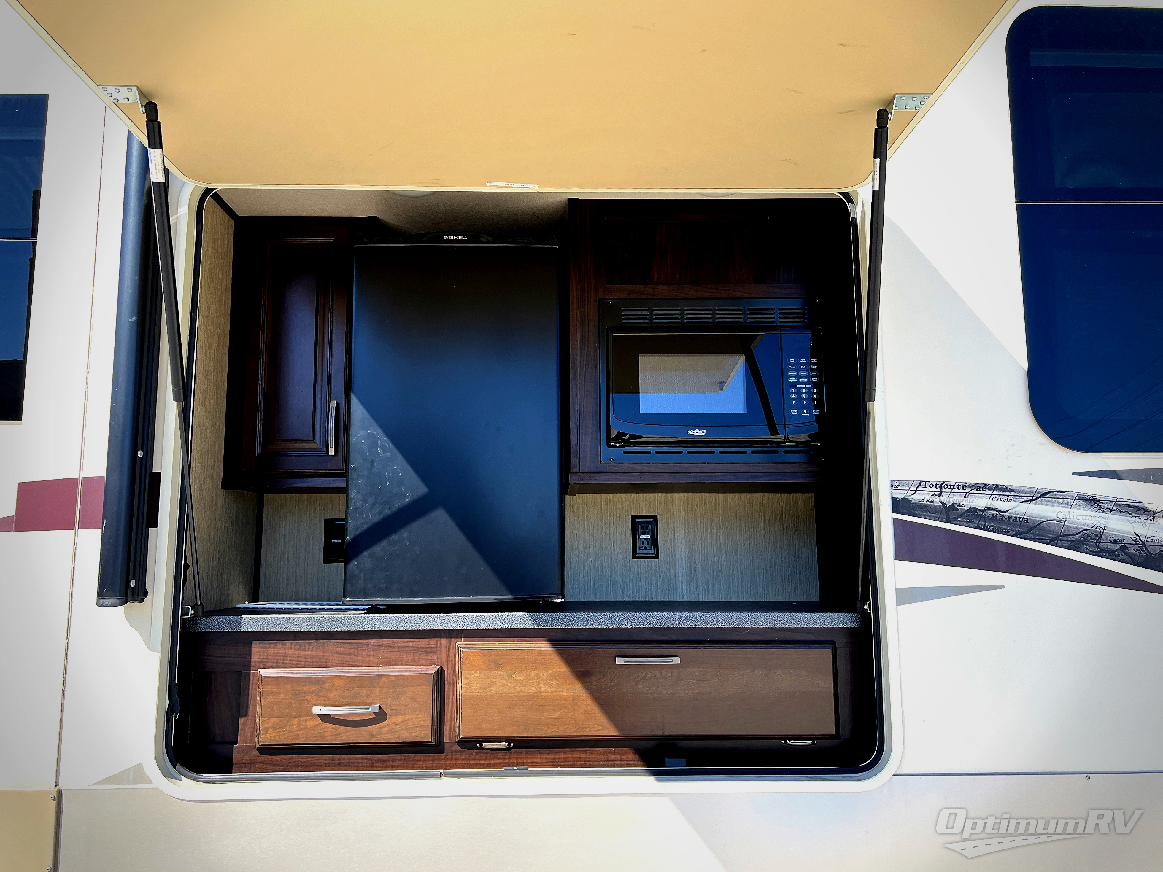 If you like to cook while away from home with the choice of being outside or inside, take a look at this Columbus 366RL fifth wheel. When it is time for breakfast, the kitchen island offers plenty of countertop and floor space thanks to the dual slide outs in this area. You might even like the cook the bacon on the outside kitchen. All the furniture including the 80" tri-fold sofa provides a place to relax and enjoy your drink while looking outside at your beautiful view or watching the 50" LED TV. After shopping in the local town square or riding your bikes on the trails, the pillowtop mattress in the master bedroom will be waiting for you. Take a look today!