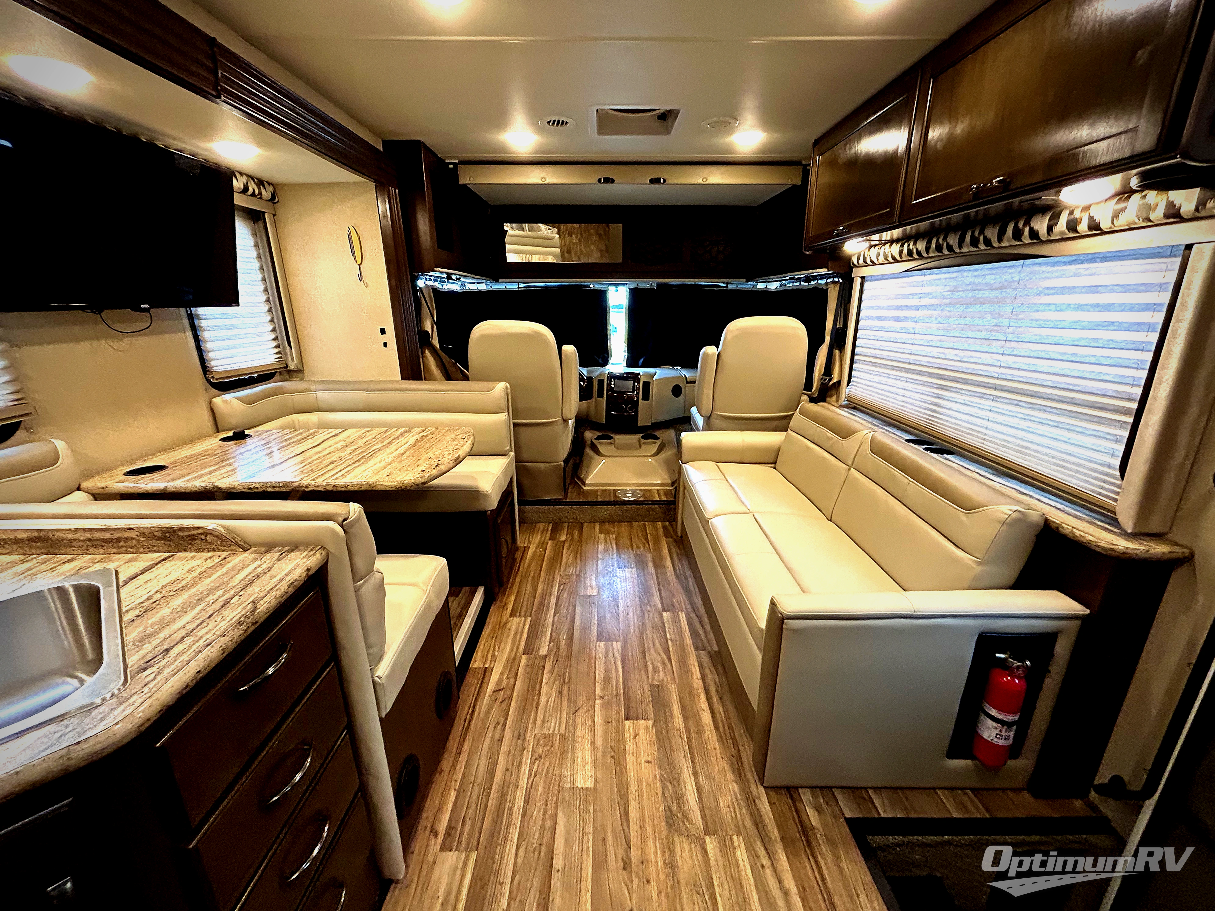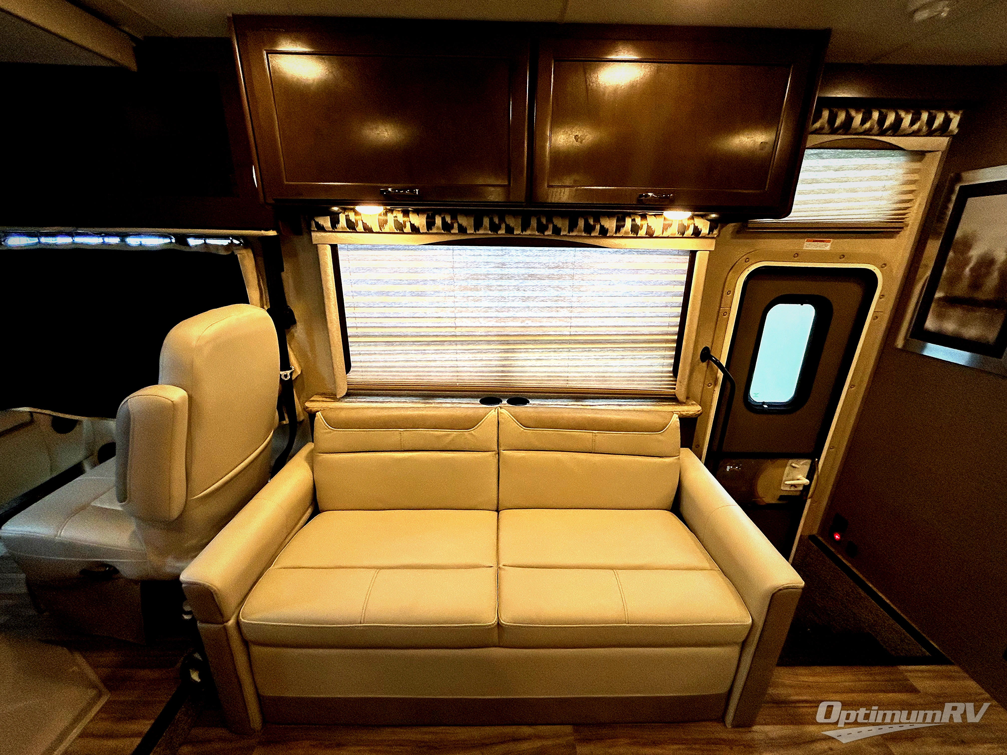 To the right of the entry door you will find a 68" jack-knife sofa with two seat belts for your passengers. Above the cab there is a drop-down overhead bunk which features 46" x 74" of sleeping space. Between the driver and passenger seats there is a handy coffee table.