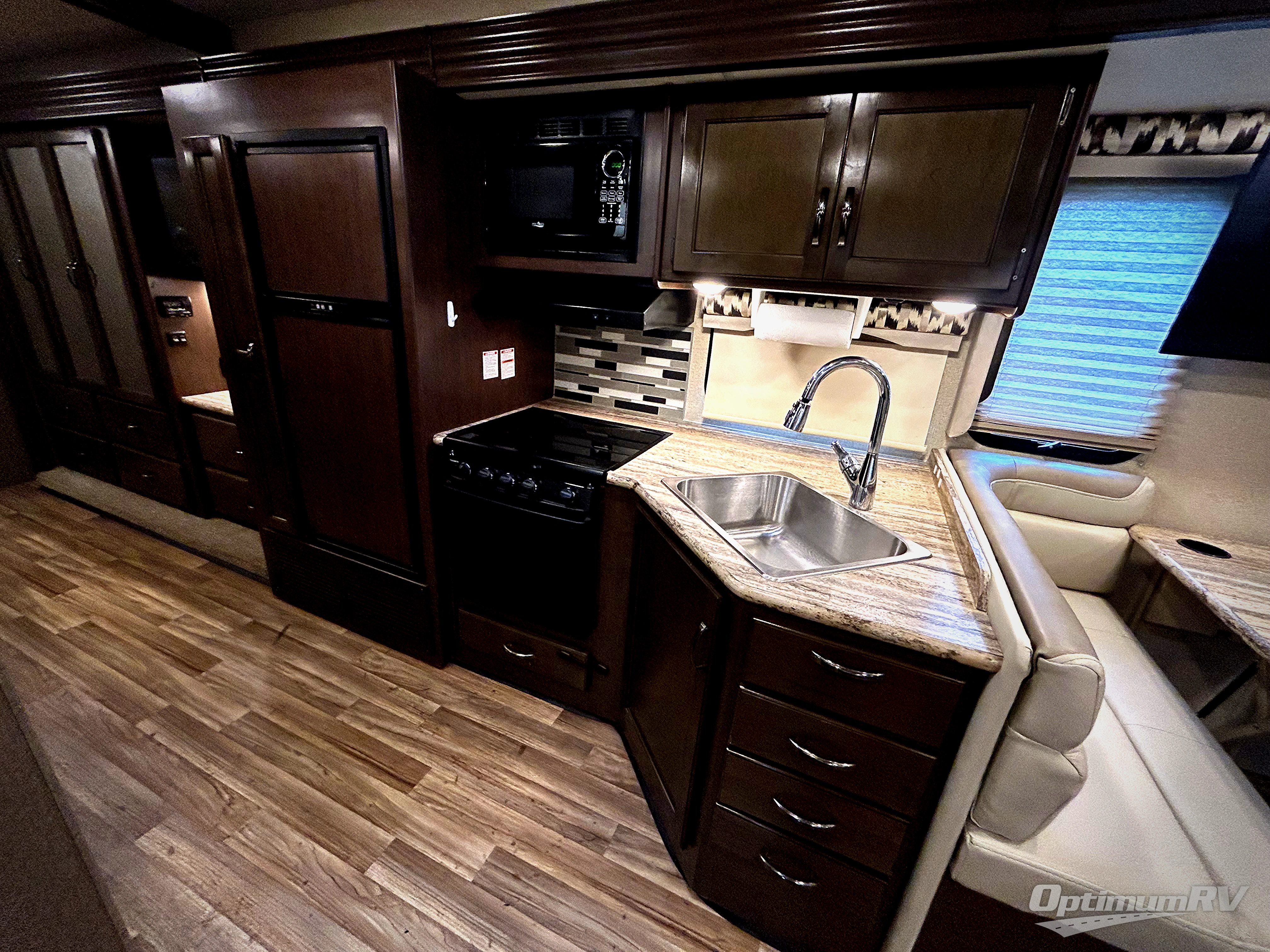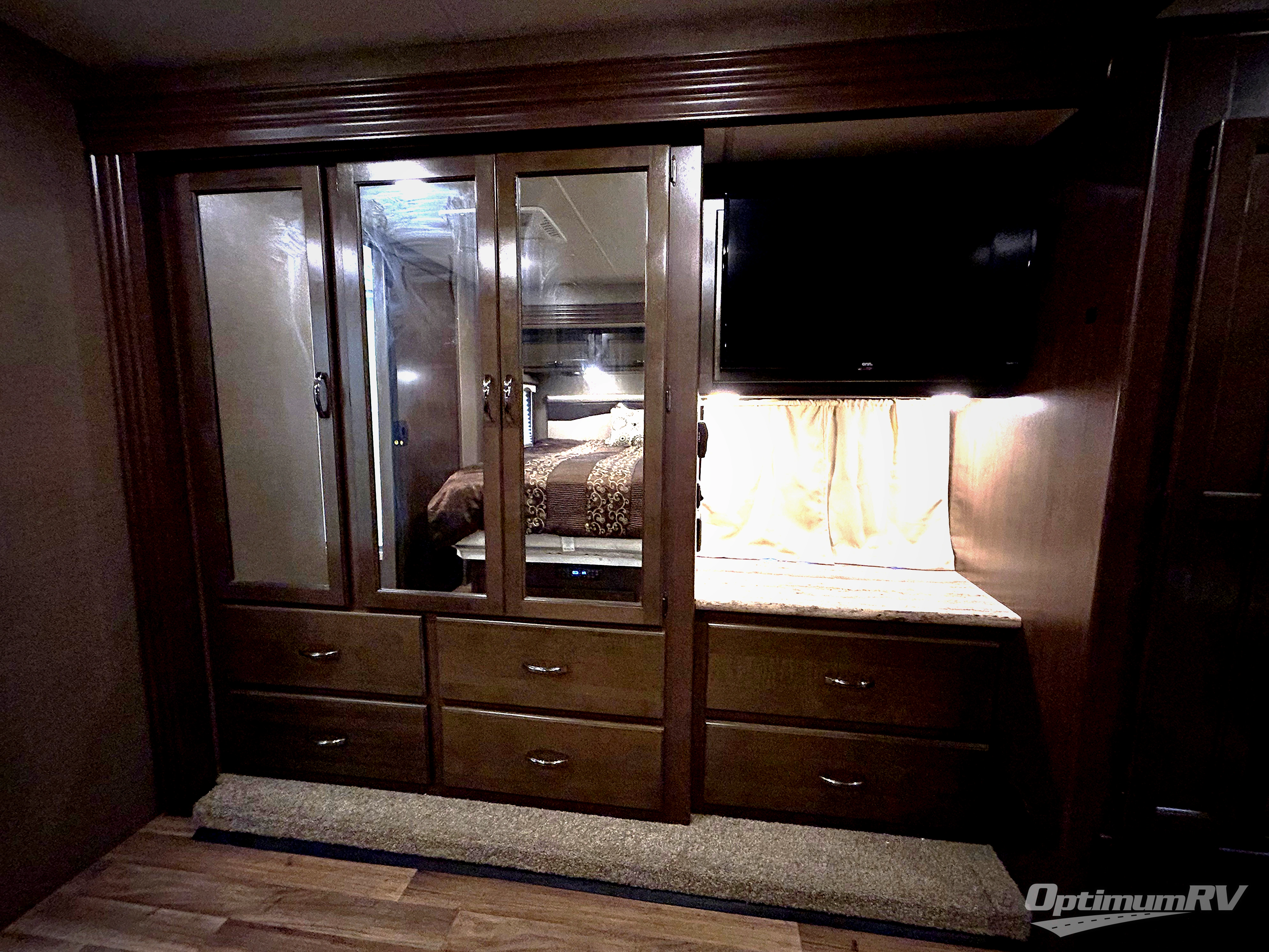 The full wall slide out along the roadside features a Dream Dinette, a 40" LED TV, an angled sink, a three burner range, an overhead microwave, a refrigerator, a pantry, and in the bedroom there is a 32" LED TV, a dresser, and a large closet.