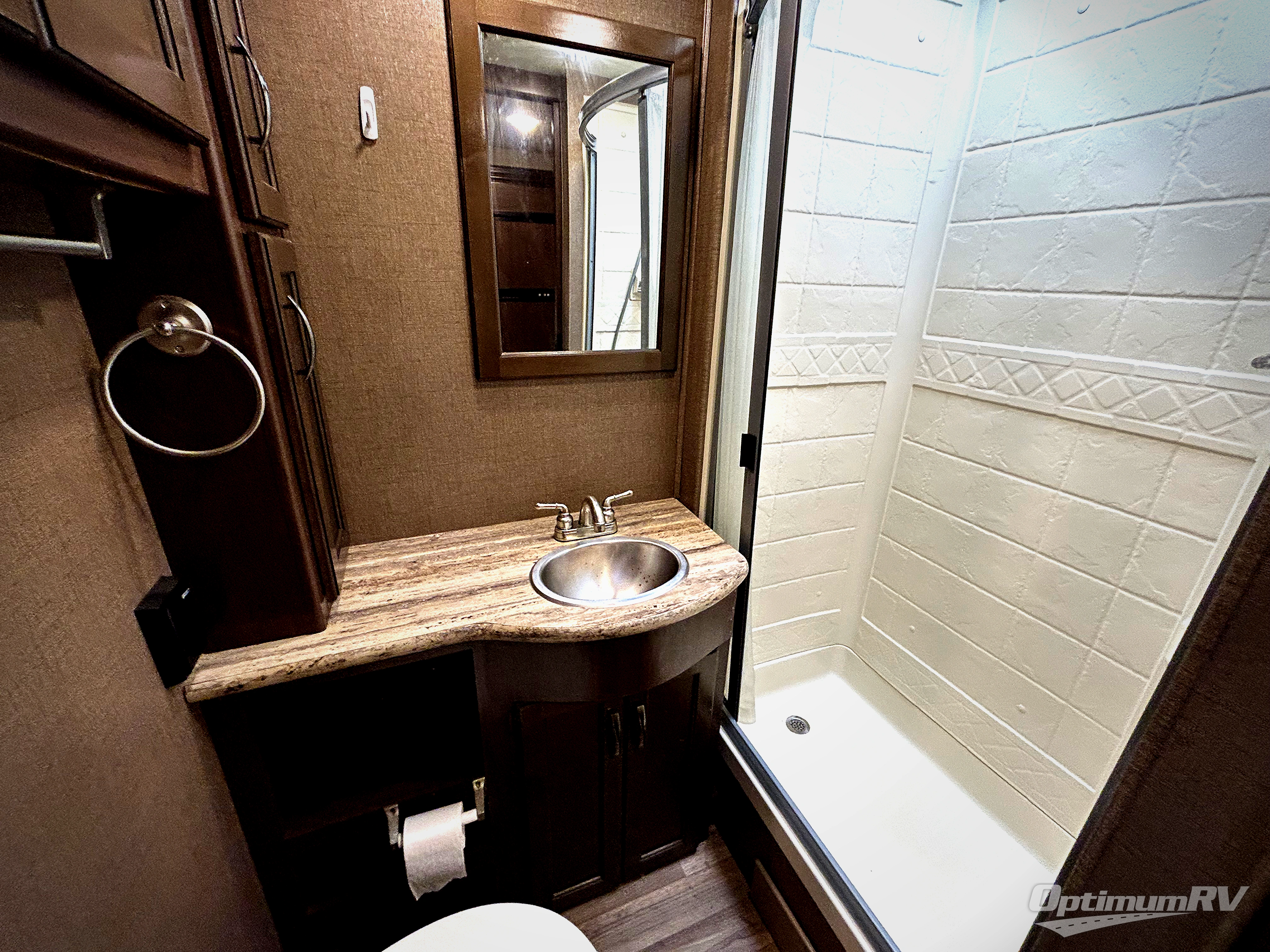 The side aisle bathroom has a toilet, linen cabinet, sink with plenty of counter space, and a 24" x 36" shower.