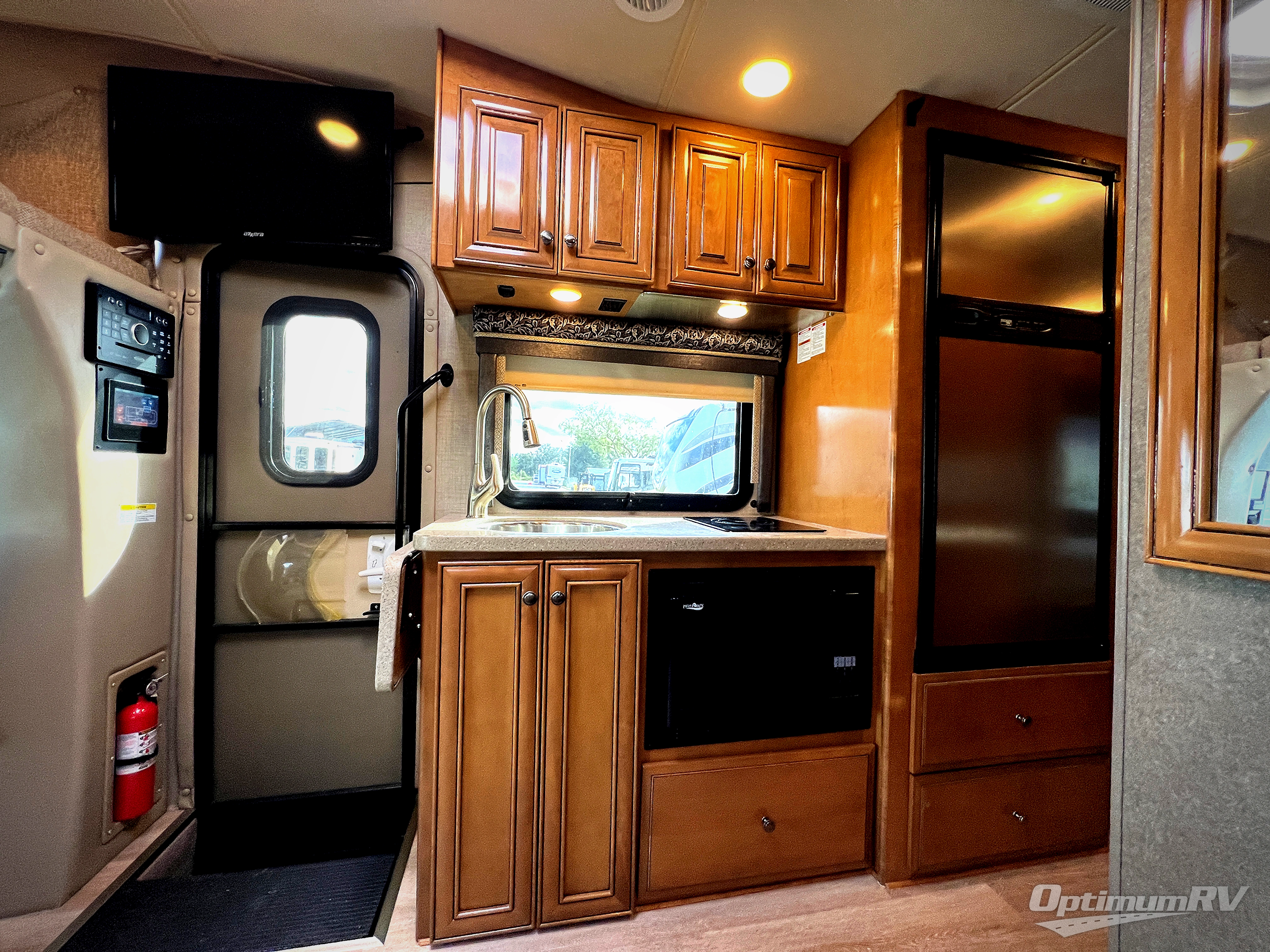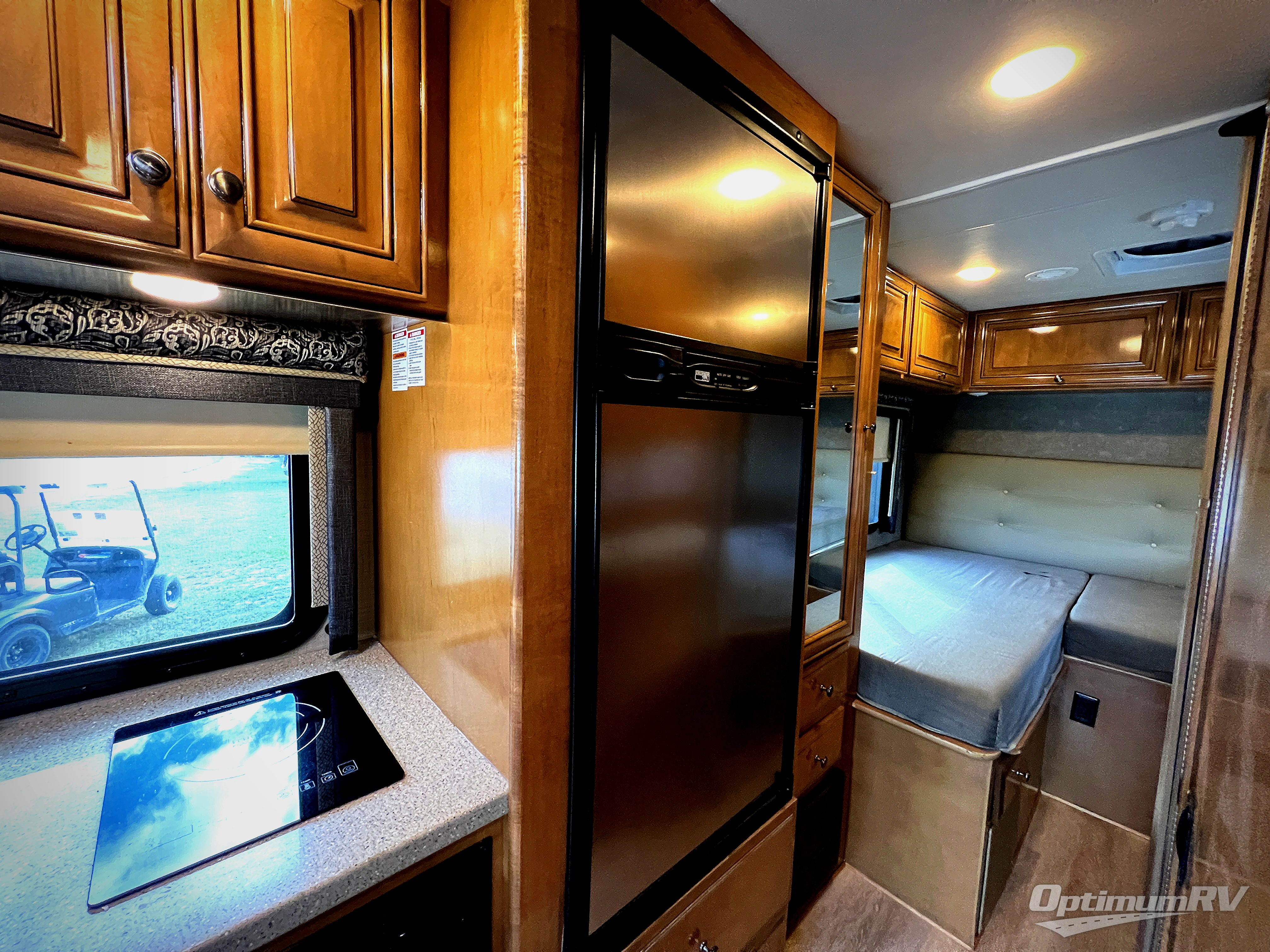 To the left of the entry door there is a kitchenette where you will find a round single bowl sink, an induction single burner, and an overhead cabinet for dishes. Next to the range you can store your perishables in the refrigerator. Along the road side opposite the kitchen area you will find a slide out with a sofa bed and a removable pedestal table, or you can choose the optional 55" reclining theater seating instead.