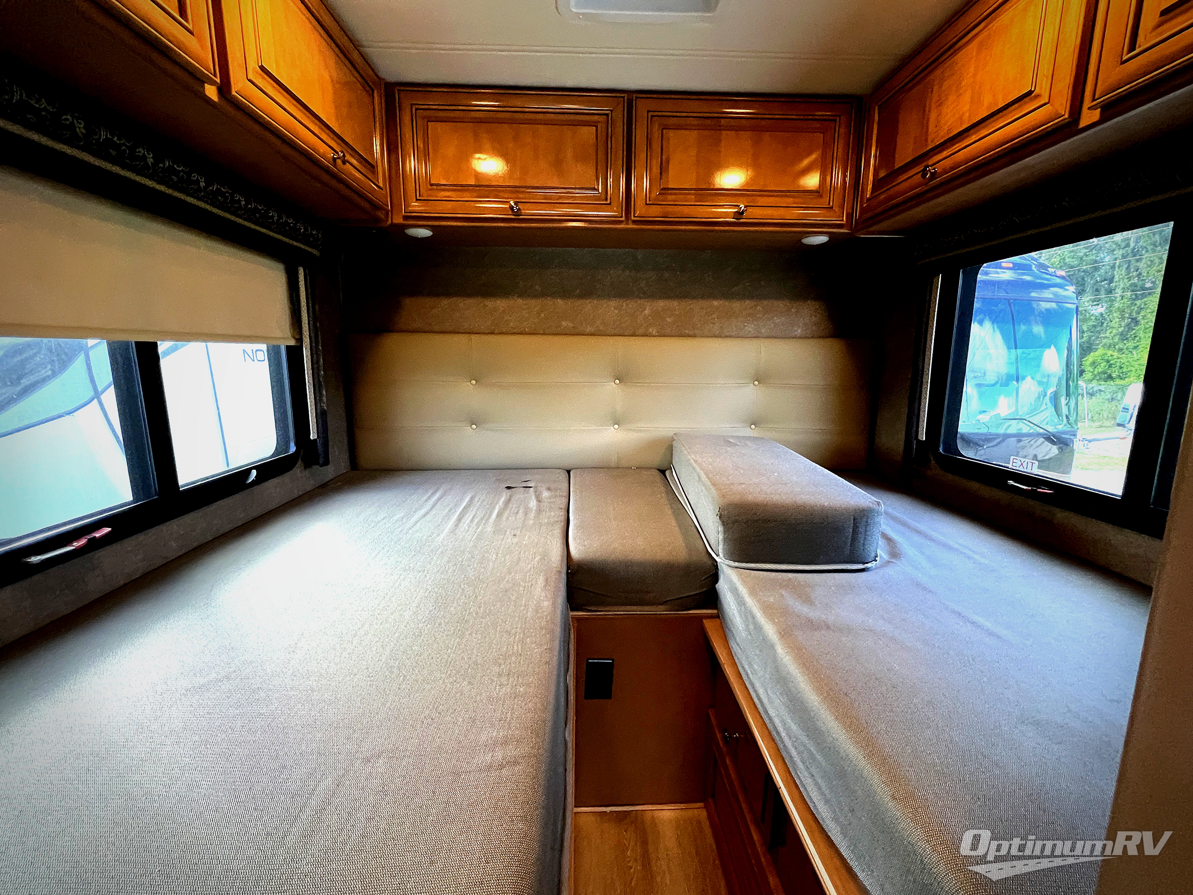 Located in the rear you will find two twin beds which can easily convert into a king. At the foot of one of the beds there is a 32" LED TV, and at the foot of the other bed you will find closet storage for your clothing.