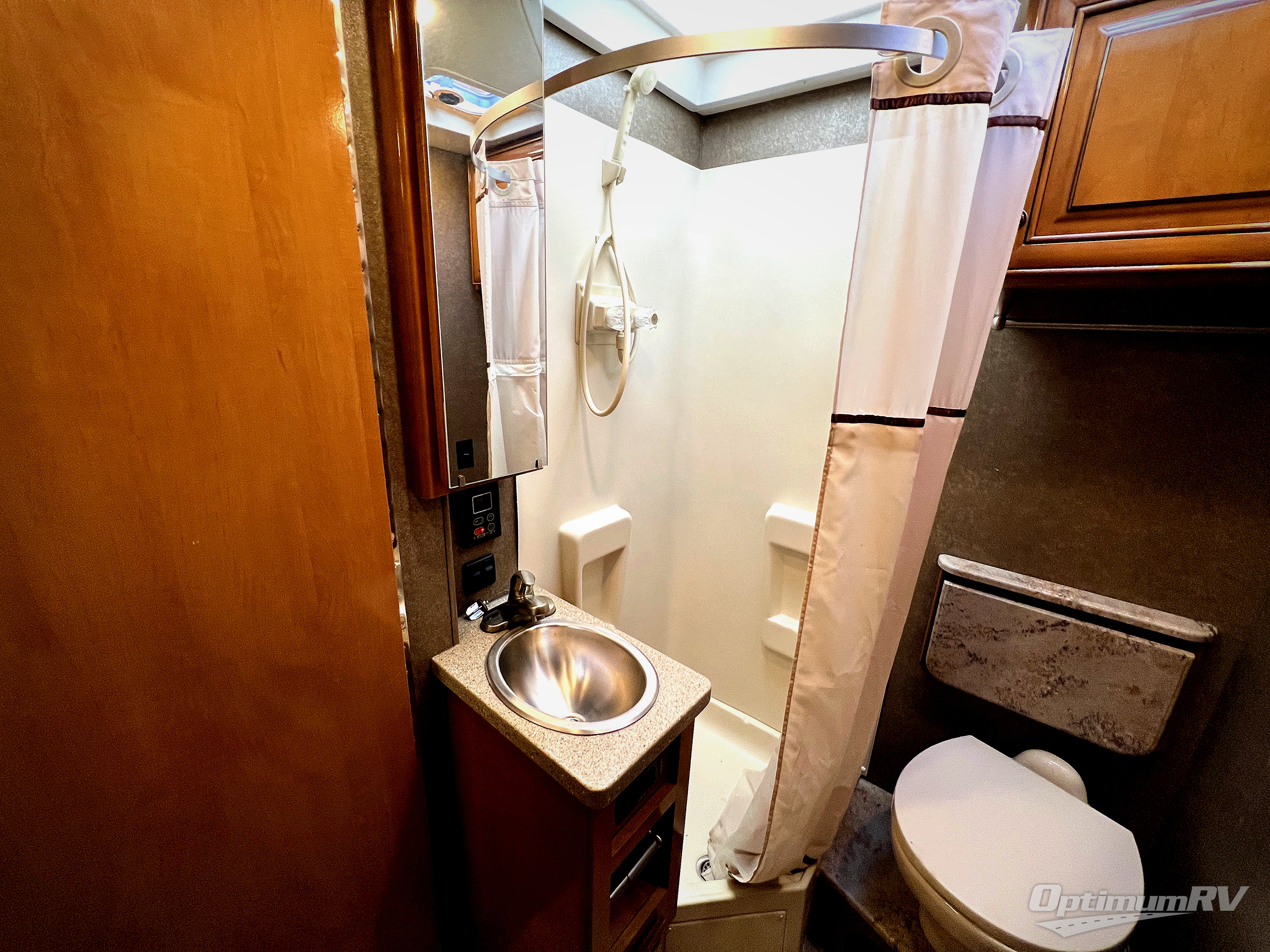 The bath has a toilet, countertop extension, cabinet, 27" x 27" corner shower, sink, and medicine cabinet. This makes spending time on the road quite convenient.