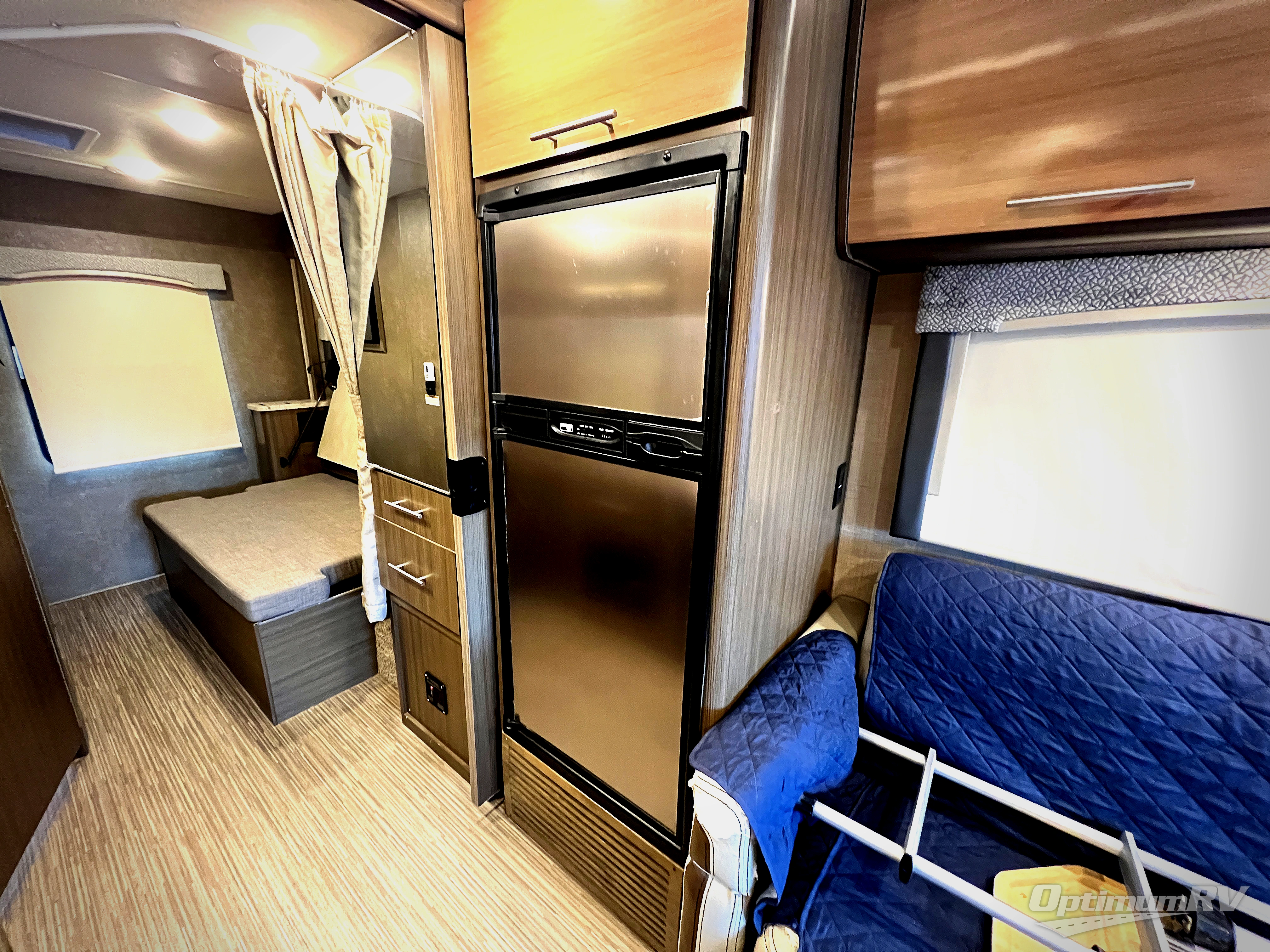 To the left of the entry door find a kitchen where you can conveniently prepare and cook meals. There is a round sink, a counter space along with a flip-up countertop extension, and two burner range with microwave below. There are also plenty of overhead cabinets, lower cupboards and drawers for dishes and things. The refrigerator is on the opposite side beside the sofa.