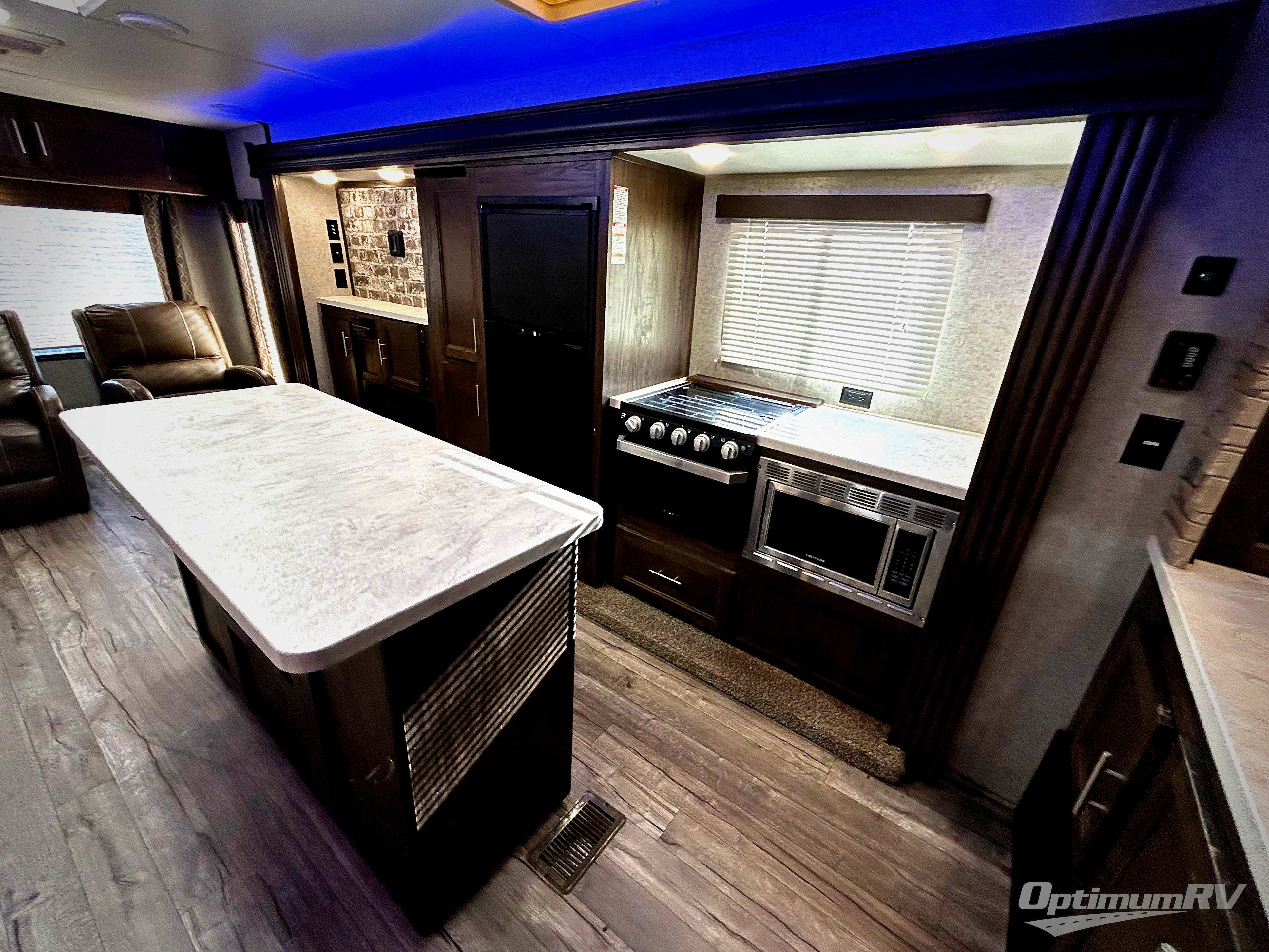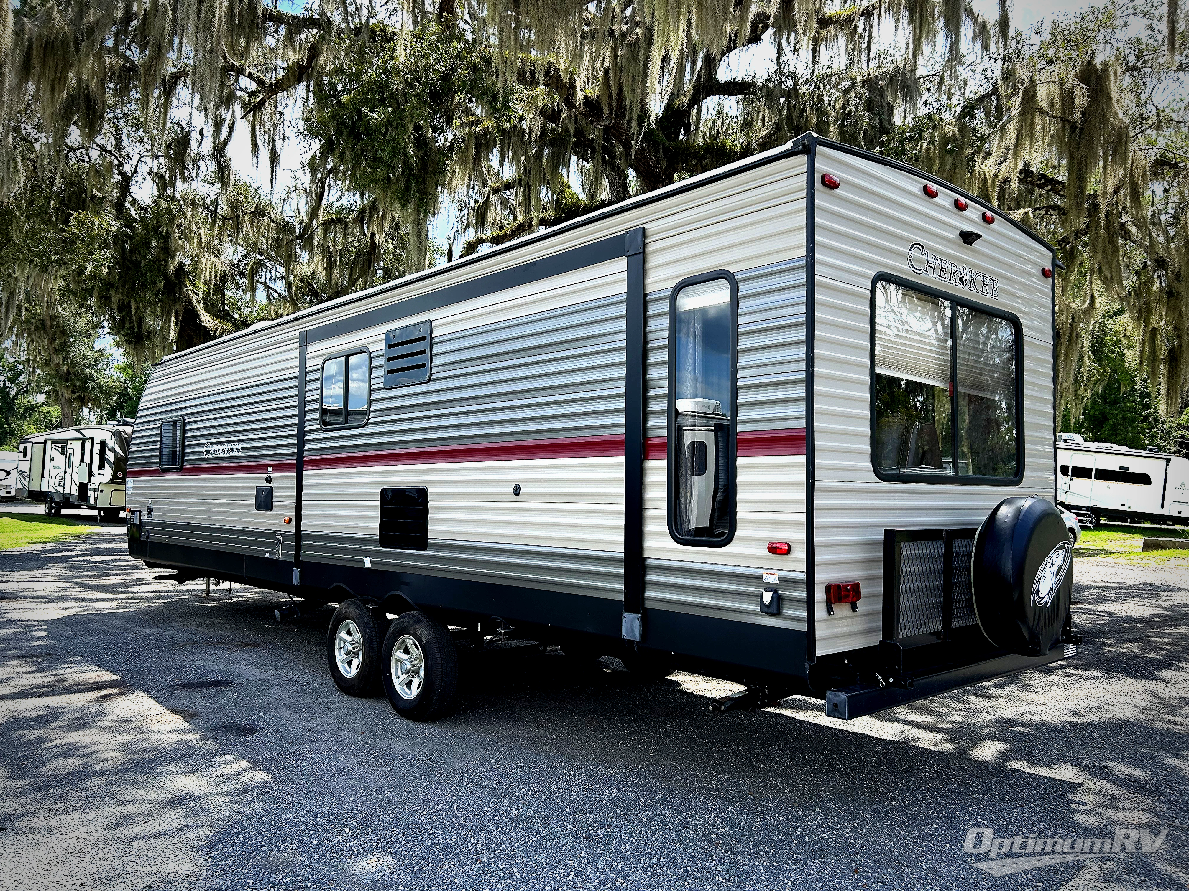 When you are ready for your next camping trip, this Cherokee travel trailer by Forest River can meet your needs. With two opposing slides, a rear living area, and a private master suite, you have everything that you need right at your fingertips. In the kitchen there is a rollaway island which allows you to work where you want and provides you with extra counter and storage space. When you're ready to hit the sack, you can head into the front master suite and enjoy a good night's rest on the queen bed with wardrobes on either side, and you will also enjoy the convenience of having a private entrance into the dual-entry bath!