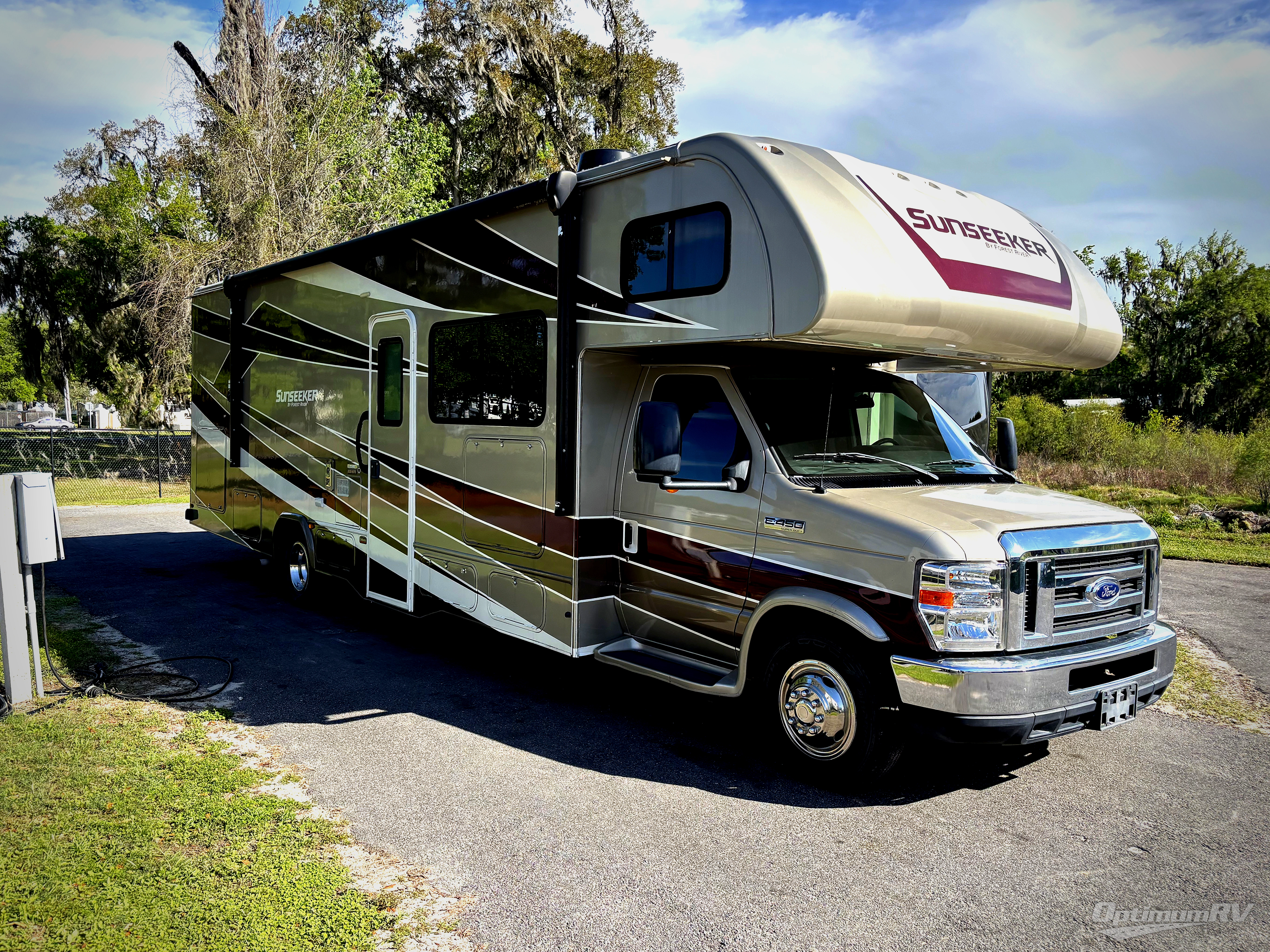 This Ford chassis Sunseeker Class C gas motorhome features a full-wall slide along the driver's side which gives this unit extra interior living space. You have a booth dinette and a sofa opposite one another that both have seatbelts to keep your passengers safe while you travel and can be folded down into sleeping space at night. There is a split bathroom that allows you to use both sides at one time, and the private bedroom has ample storage so that you can bring whatever you would like to.