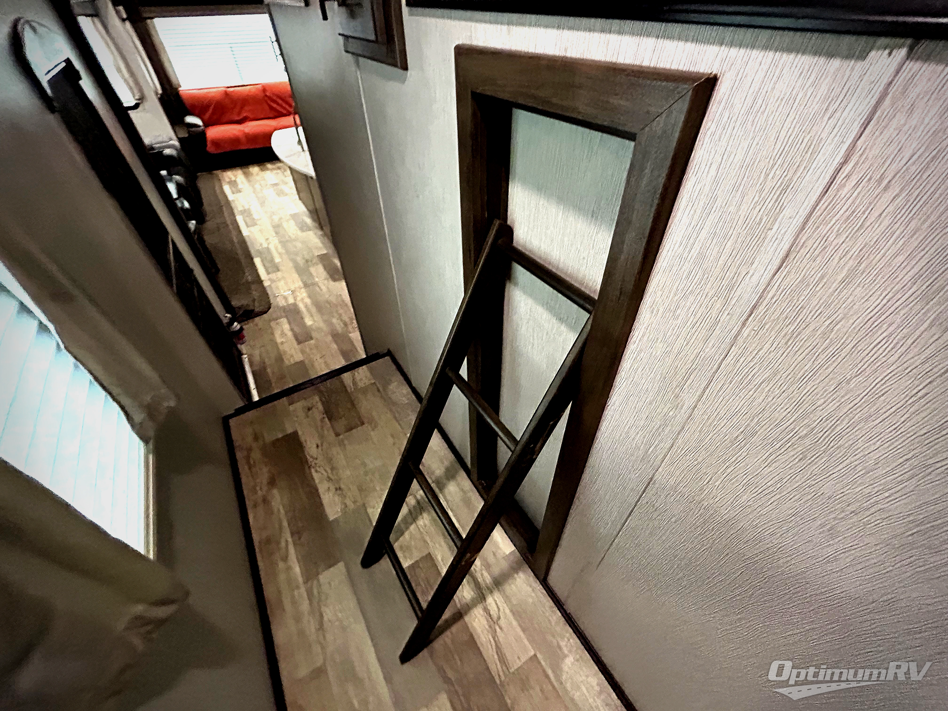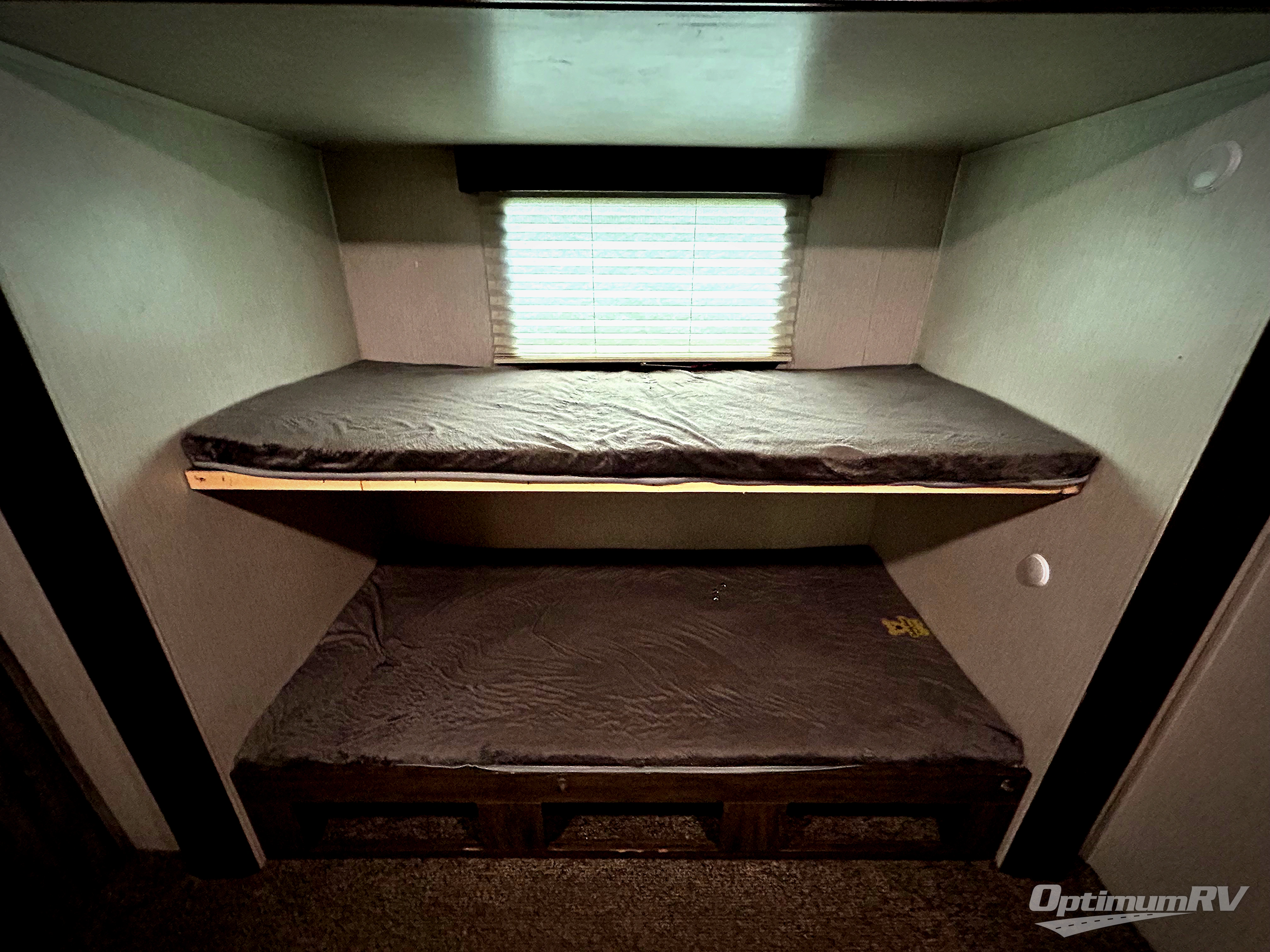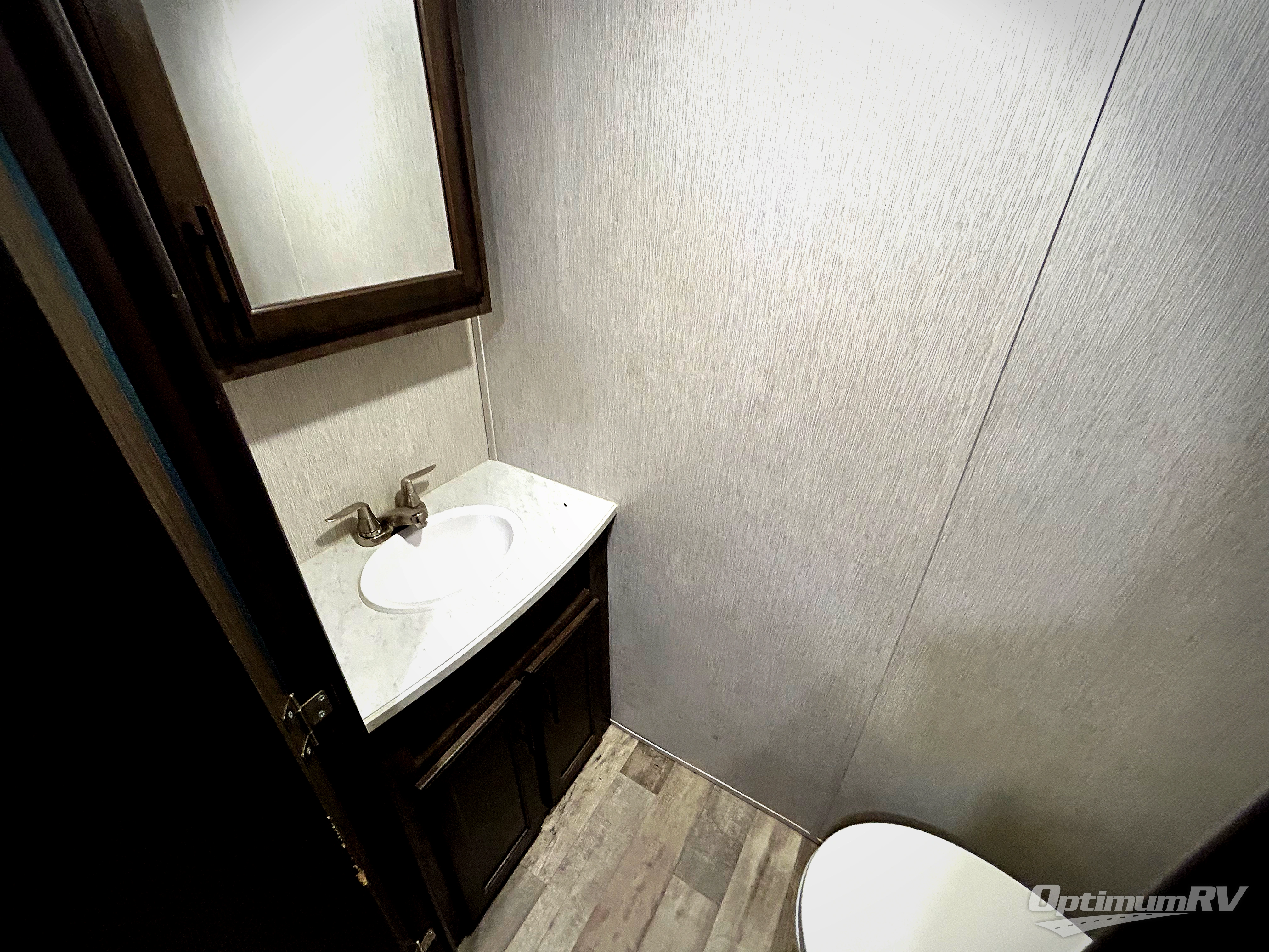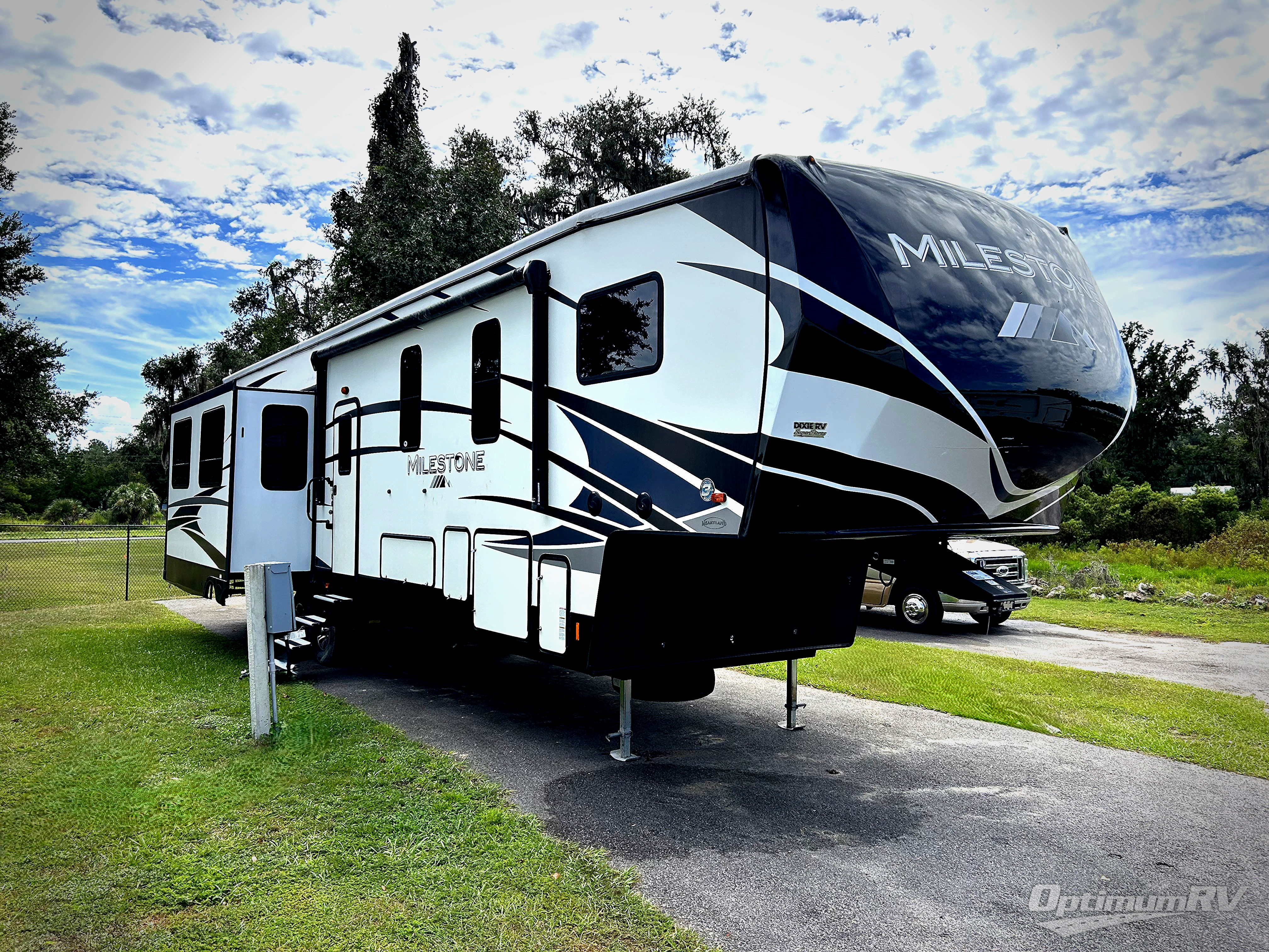 You won't believe how luxurious this Milestone fifth wheel is! Because this unit includes both a private master suite with its own entrance into the full bathroom and a private bunkhouse suite with its very own half bathroom, you have plenty of comfortable sleeping space for eight people, and the overhead loft is where your kids will beg to spend their afternoons as they build forts and play together. The rear living area is also extremely appealing for its relaxing theater seats and free-standing table with chairs.
