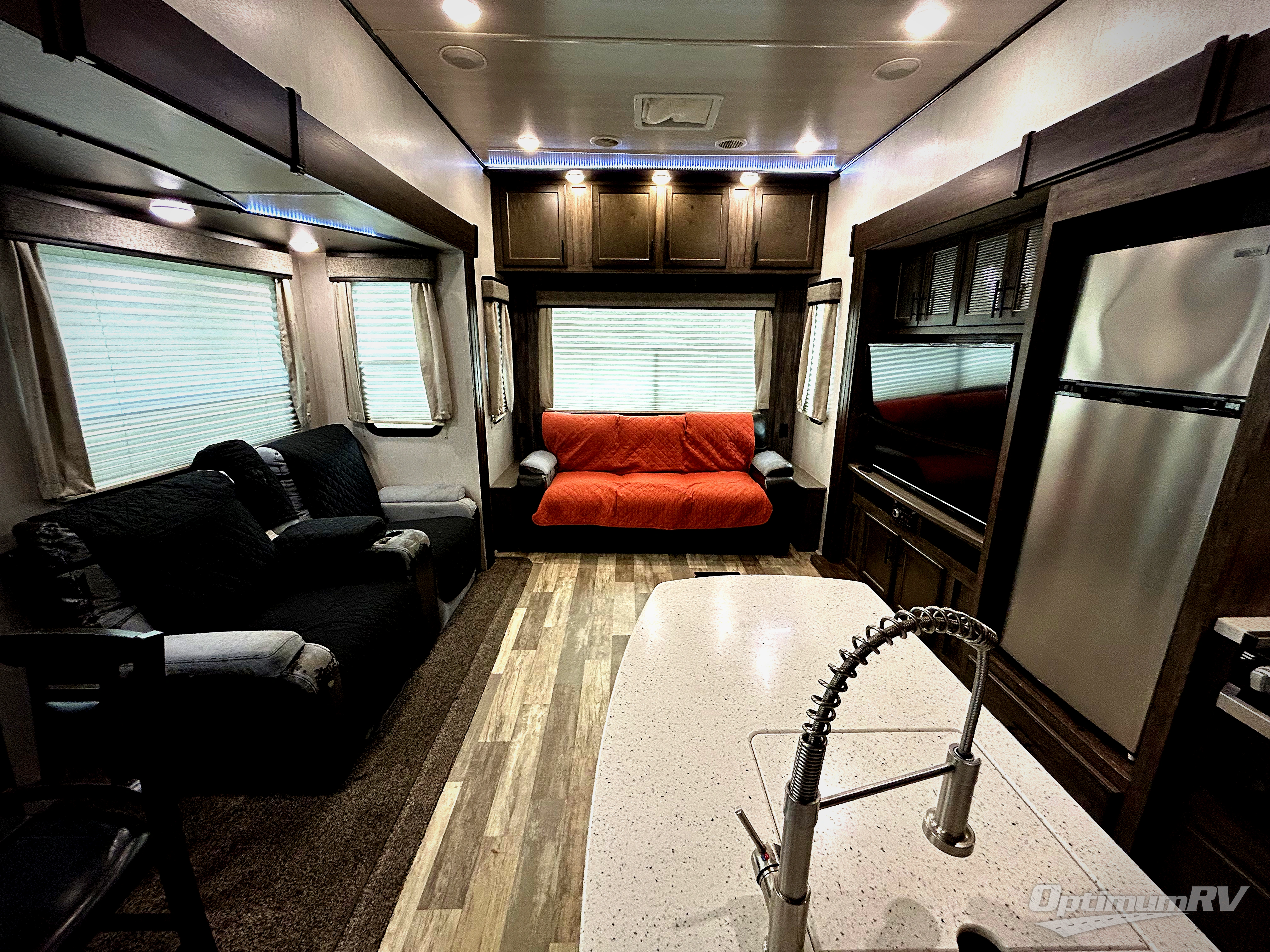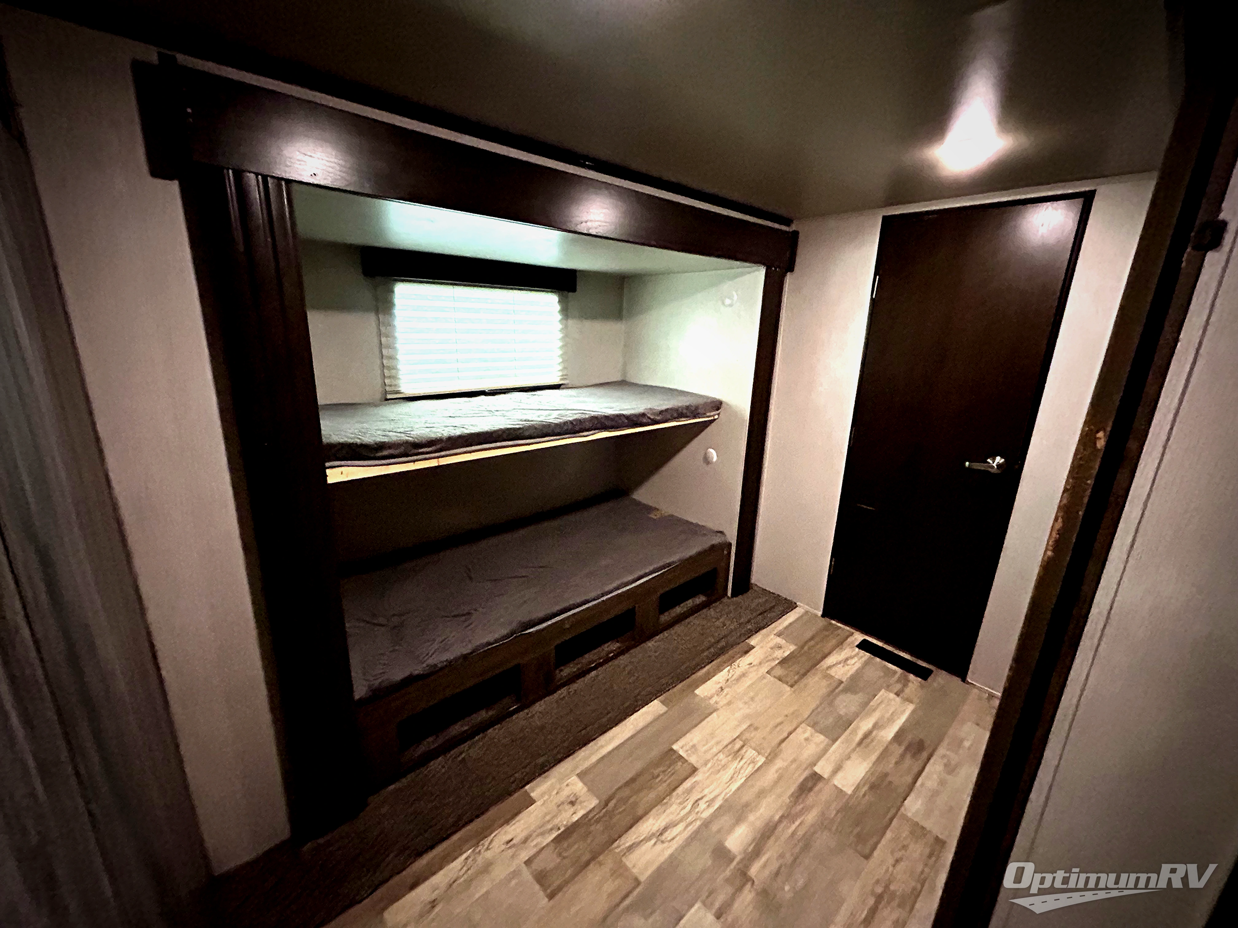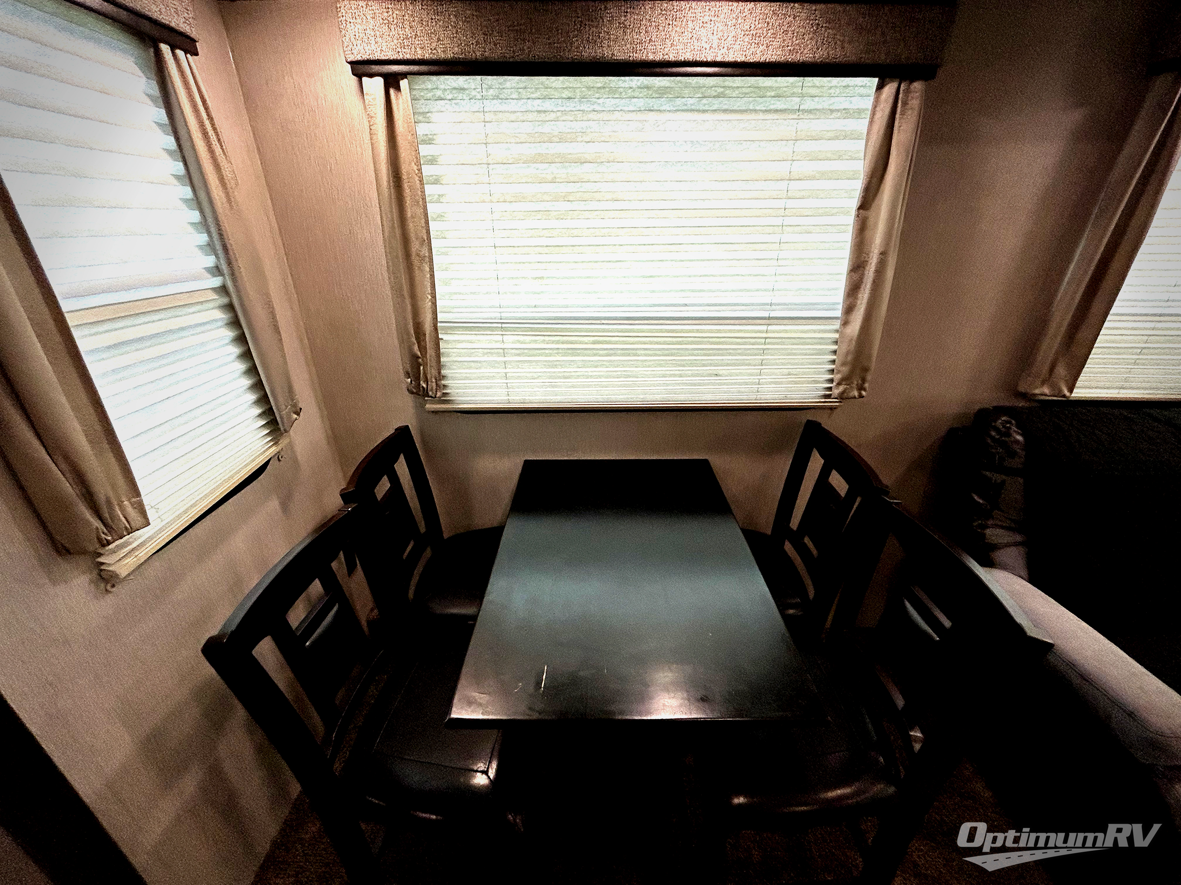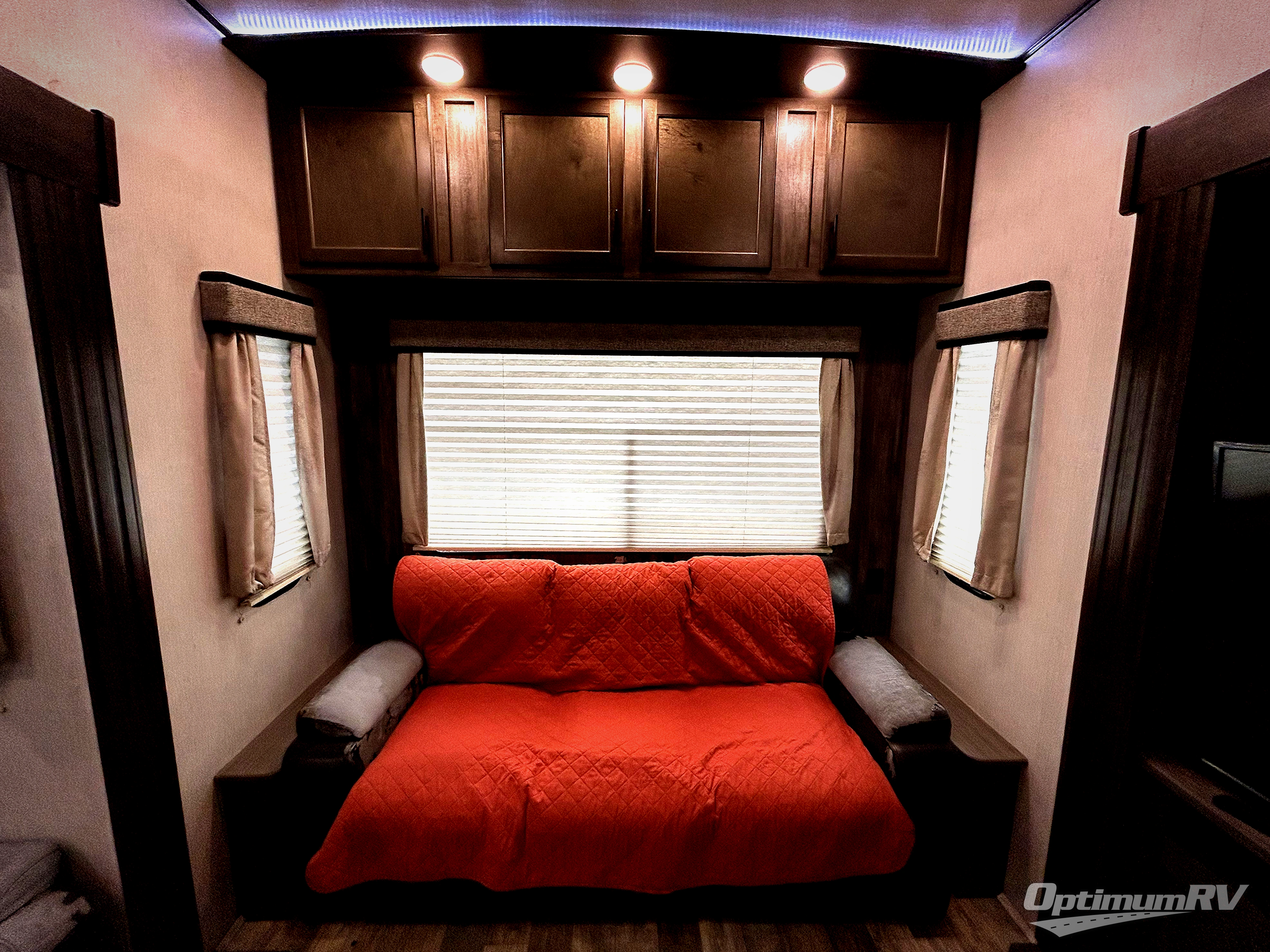 You won't believe how luxurious this Milestone fifth wheel is! Because this unit includes both a private master suite with its own entrance into the full bathroom and a private bunkhouse suite with its very own half bathroom, you have plenty of comfortable sleeping space for eight people, and the overhead loft is where your kids will beg to spend their afternoons as they build forts and play together. The rear living area is also extremely appealing for its relaxing theater seats and free-standing table with chairs.