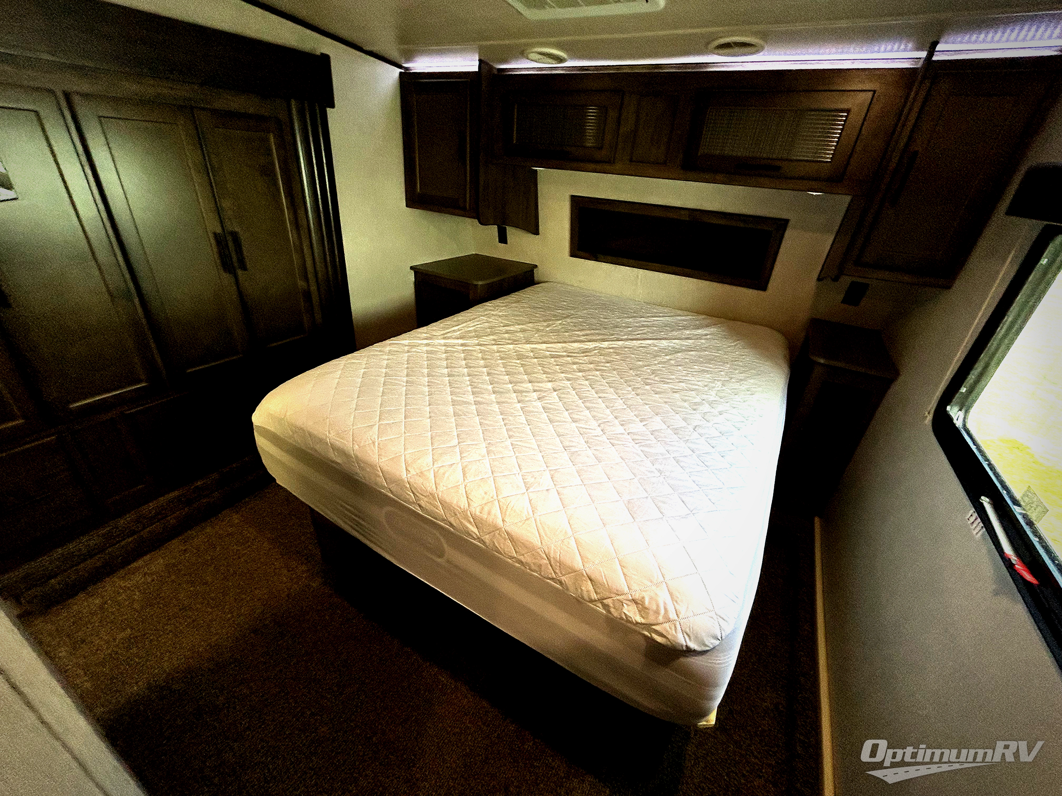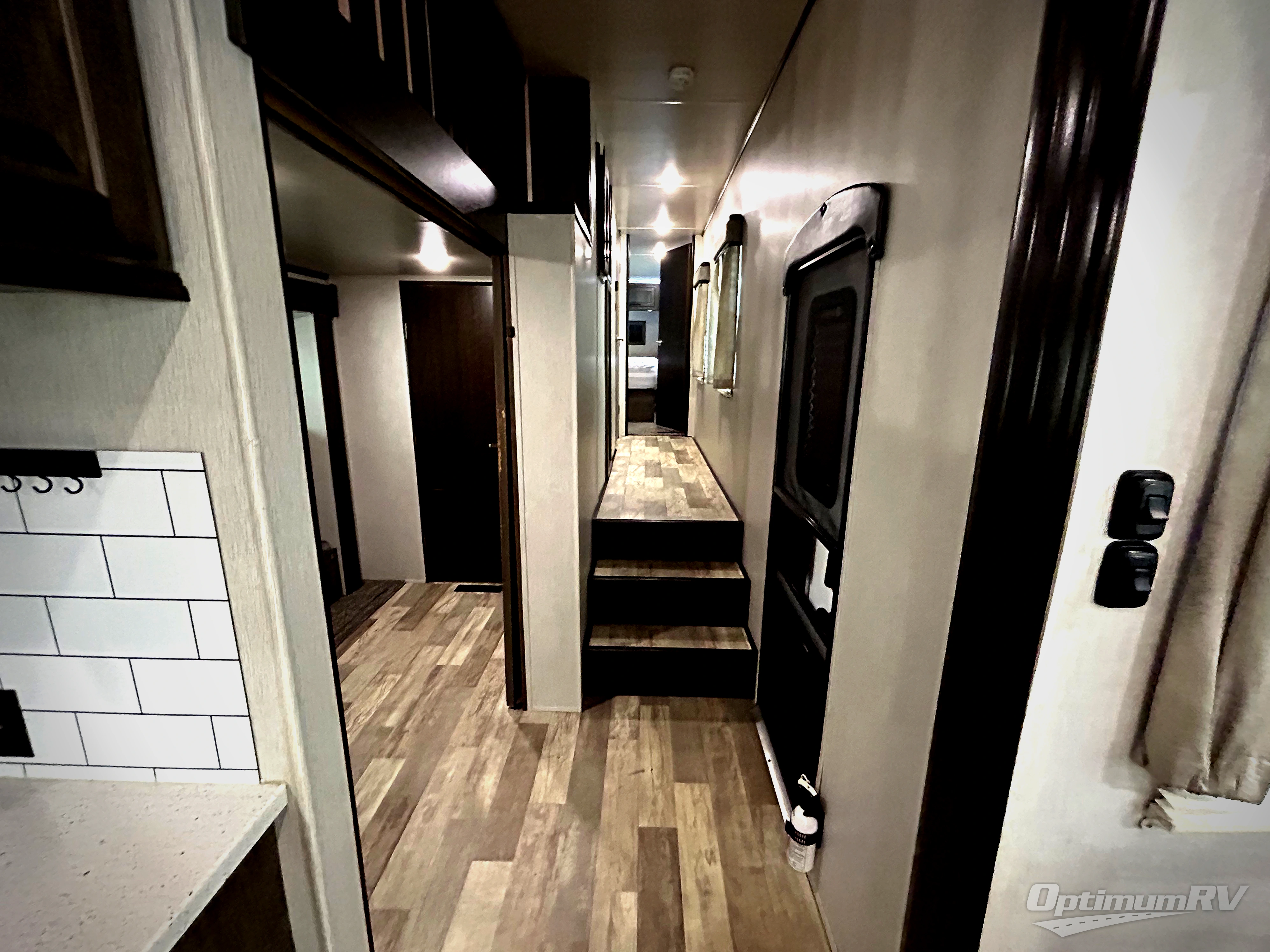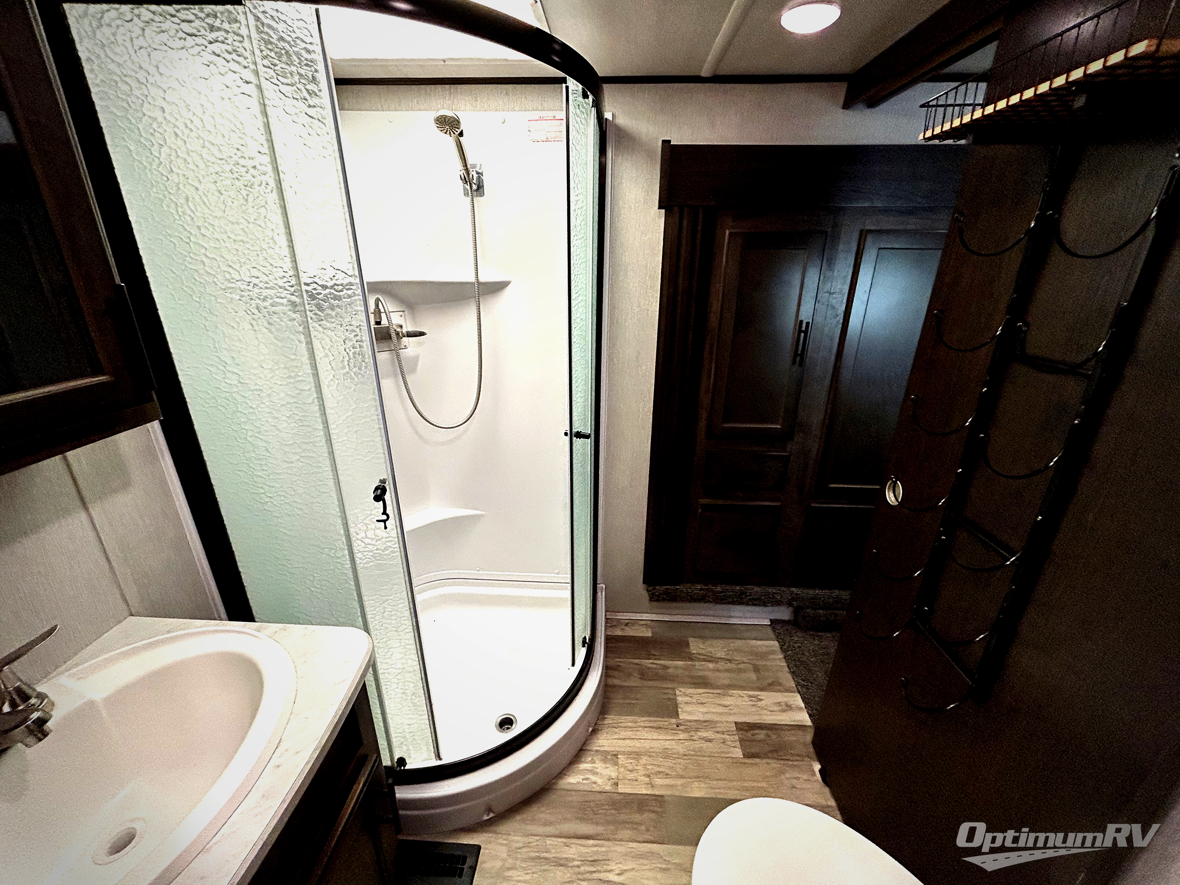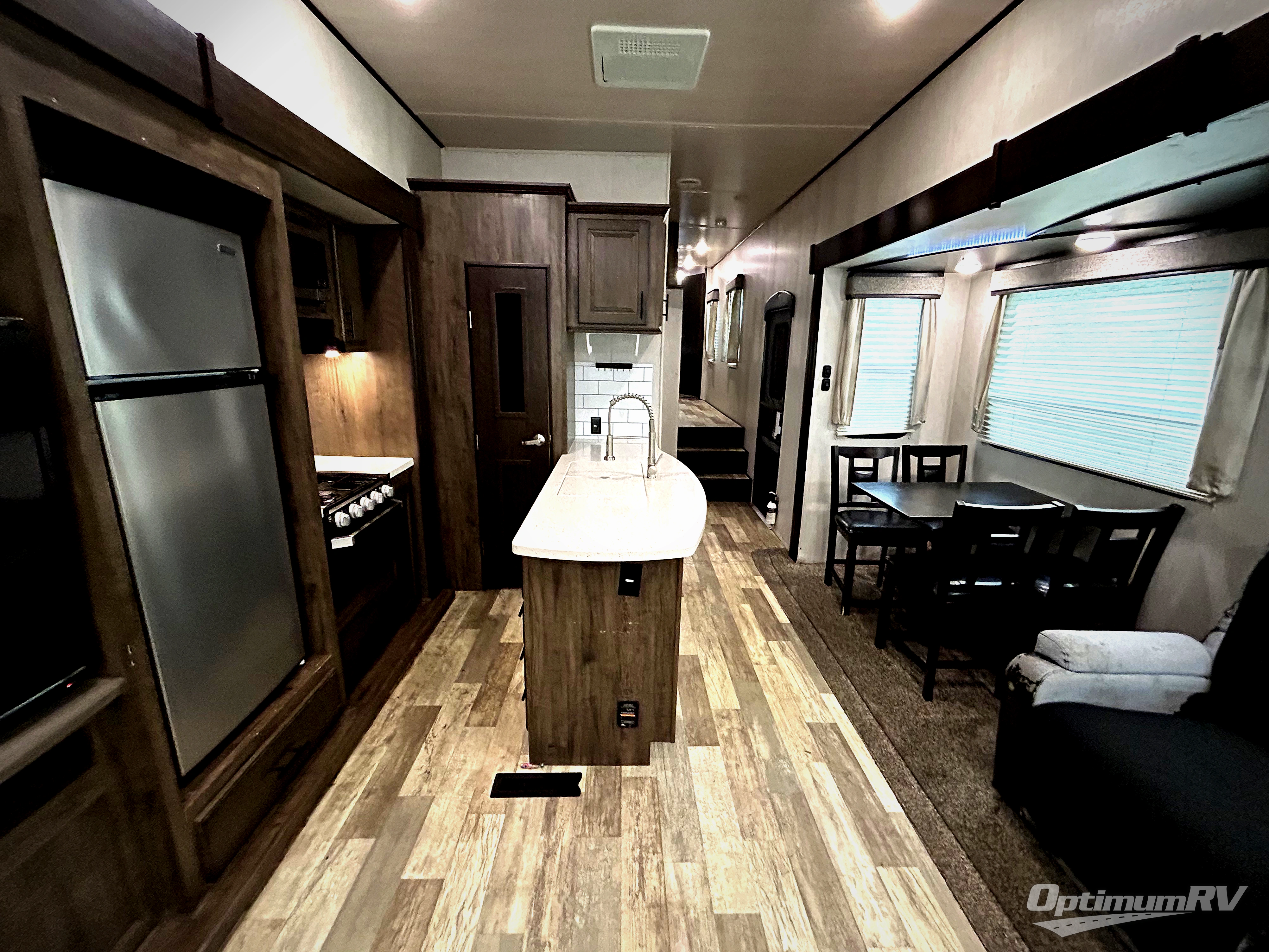 You won't believe how luxurious this Milestone fifth wheel is! Because this unit includes both a private master suite with its own entrance into the full bathroom and a private bunkhouse suite with its very own half bathroom, you have plenty of comfortable sleeping space for eight people, and the overhead loft is where your kids will beg to spend their afternoons as they build forts and play together. The rear living area is also extremely appealing for its relaxing theater seats and free-standing table with chairs.