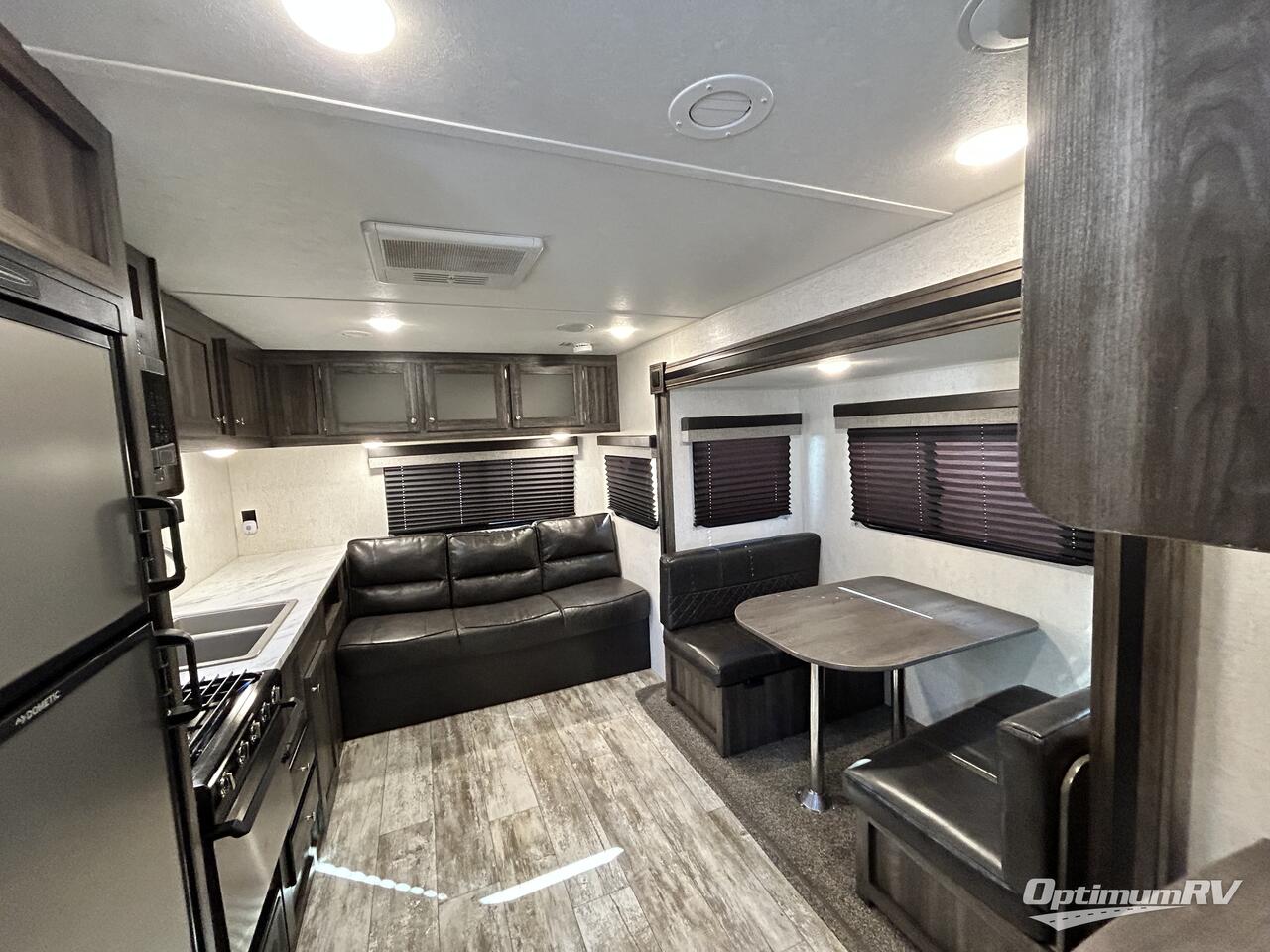 You can make meals, get cleaned up and sleep with your own accommodations anywhere you stop in this travel trailer. The cook will enjoy the full kitchen amenities across from the dinette slide, and the rear sofa is perfect to take a nap on. The furniture also provides extra sleeping space when needed. The front private bedroom provides a queen bed and quick access to the full bathroom at night. Don't worry about storage, you will find plenty throughout, plus the exterior pass-through compartment comes in handy for those larger items such as golf clubs, fishing poles, and such.