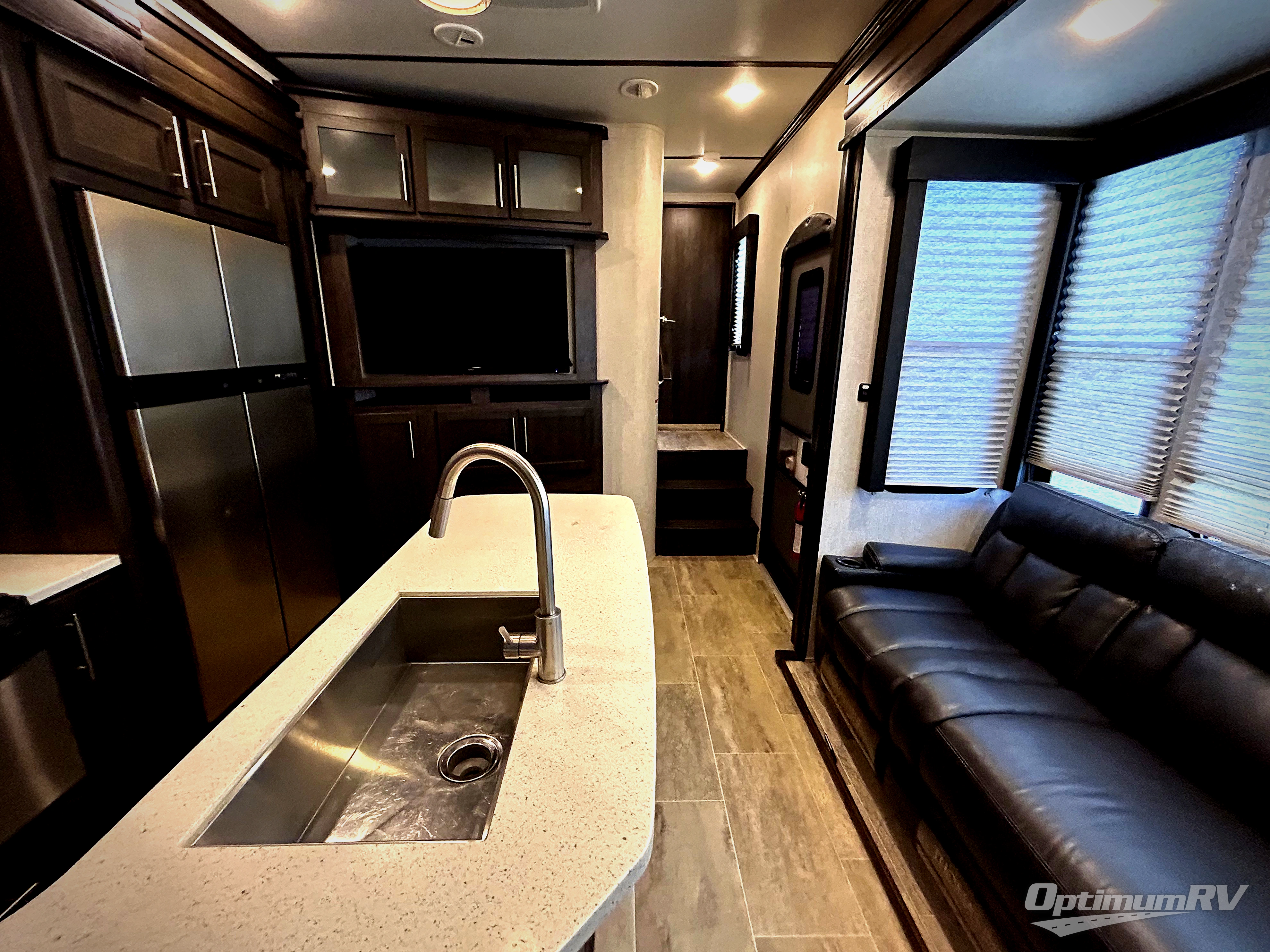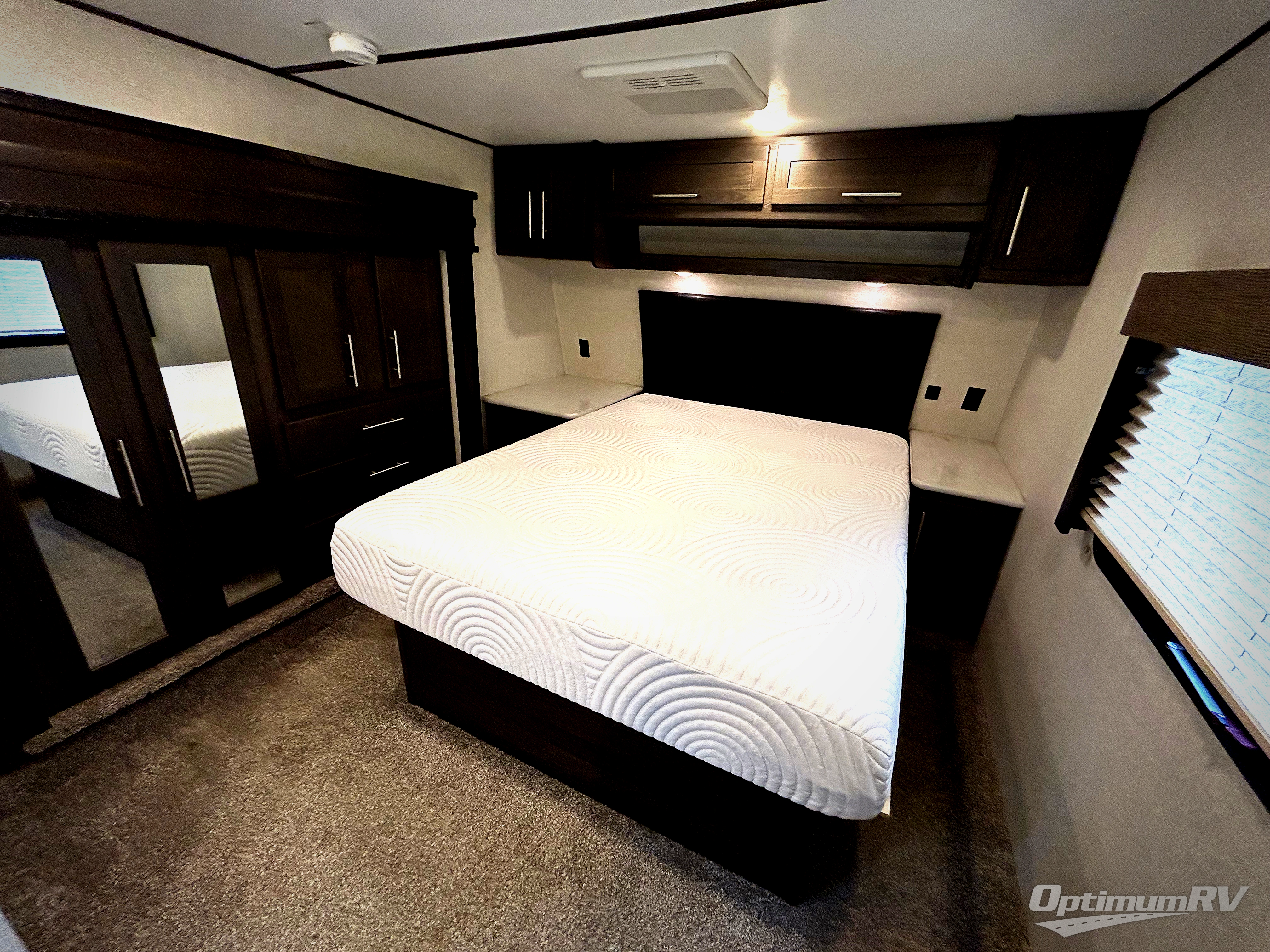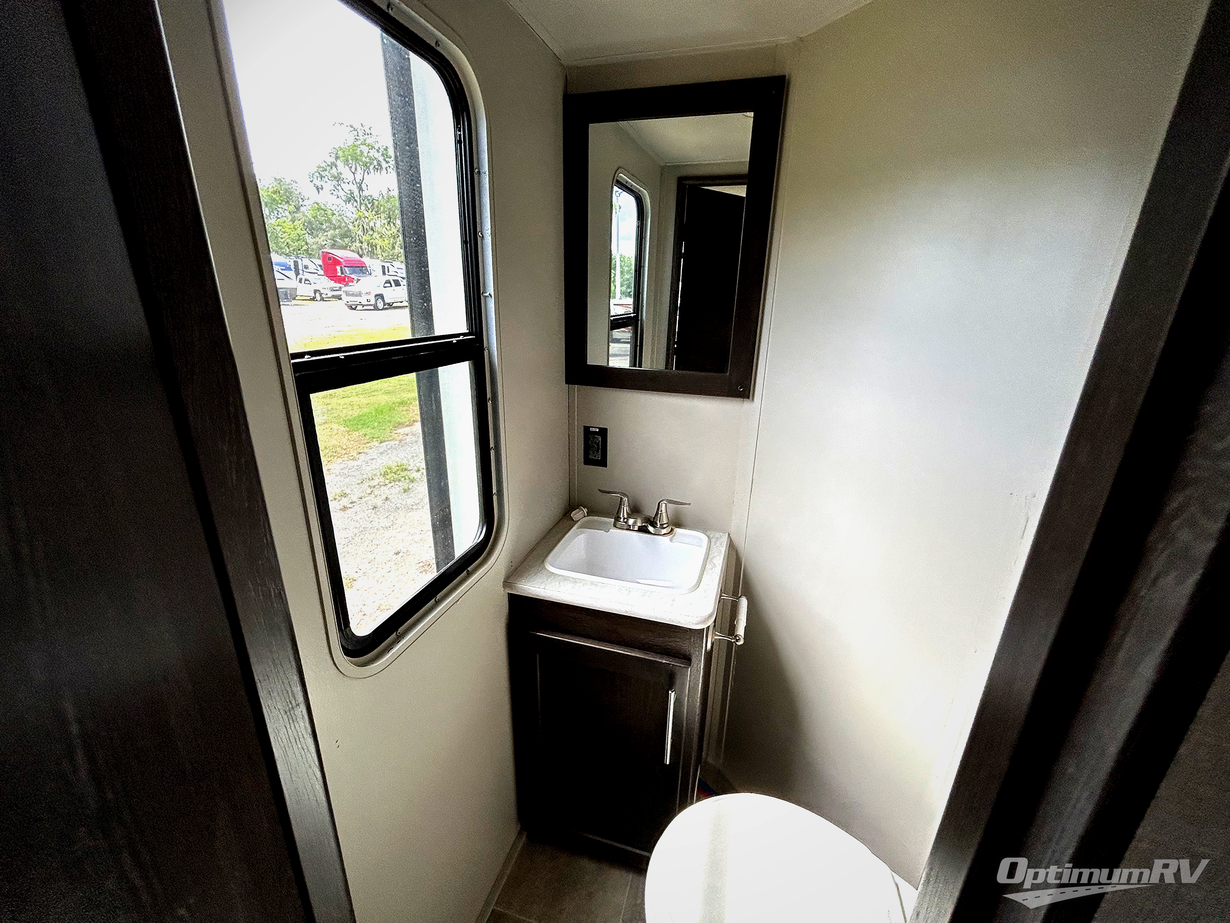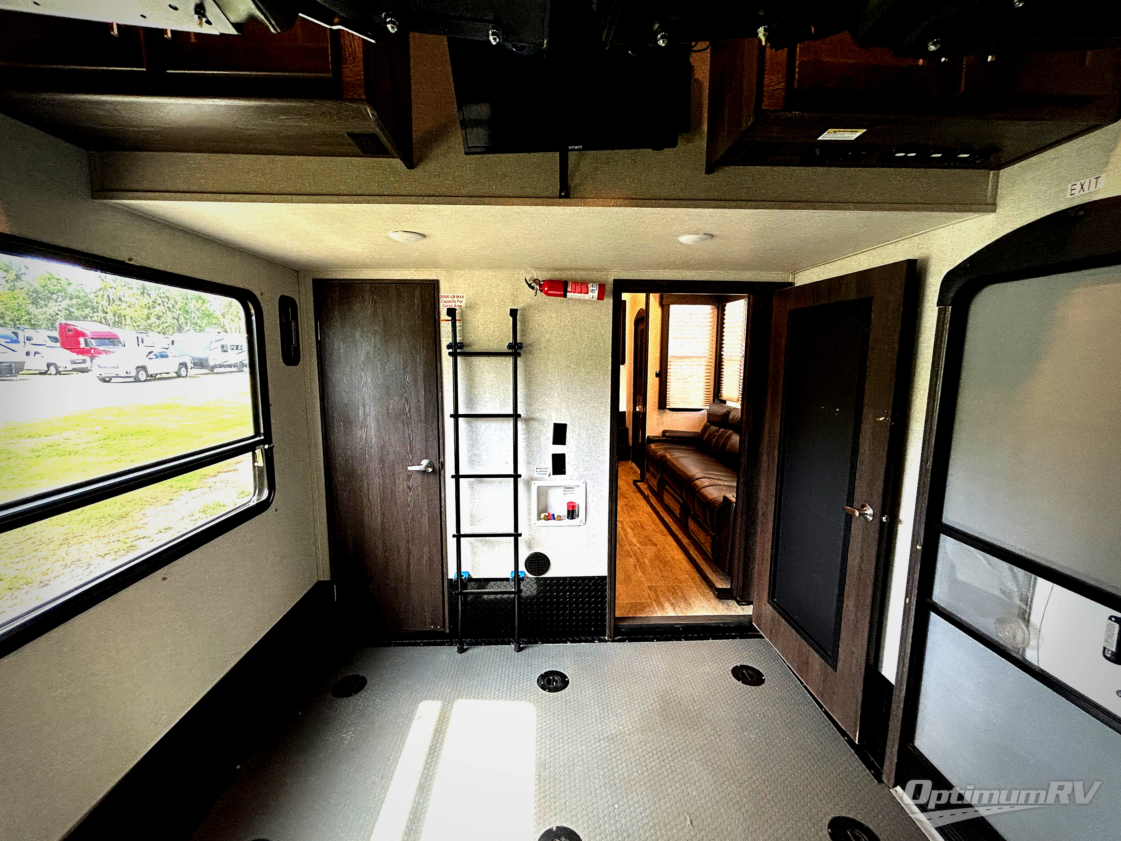 You'll love this fifth wheel with many comfortable features. There is a convenient bath and a half, one being in the kids or guest area, so you don't have people trampling through the unit, especially at night. In the living area, there are opposing slide outs which really opens up the floorplan giving you extra space. This unit features a counter peninsula with two sinks for easy clean-up. The garage area has a loft with a twin bed, and there is an electric bed plus dual opposing sofas for extra sleeping space. This space is perfect for the kids! During the day they can use it for a playroom and then at night there is sleeping space for up to five! Mom and dad will love having their own space up front and a private entry into the bathroom for convenience.