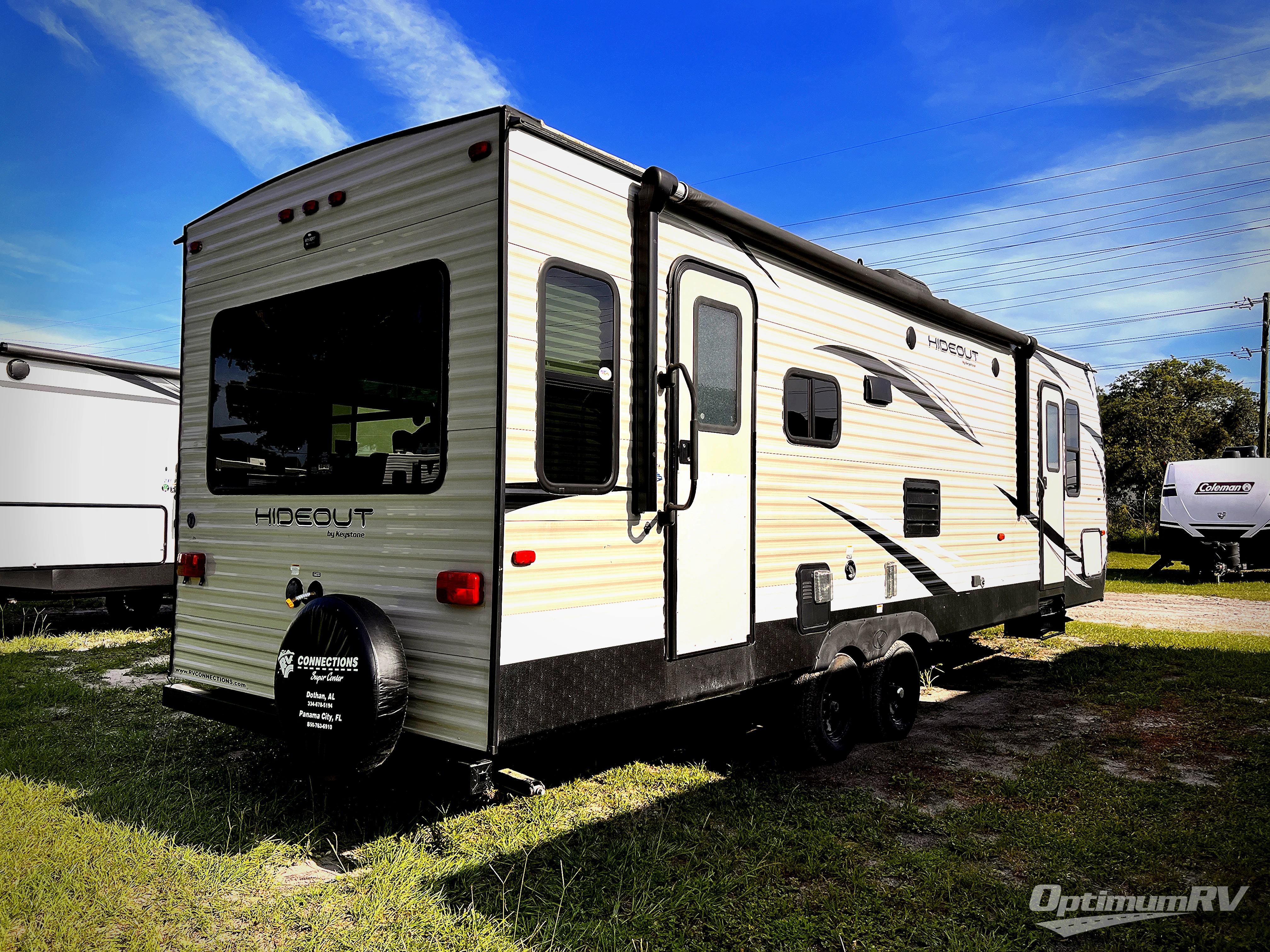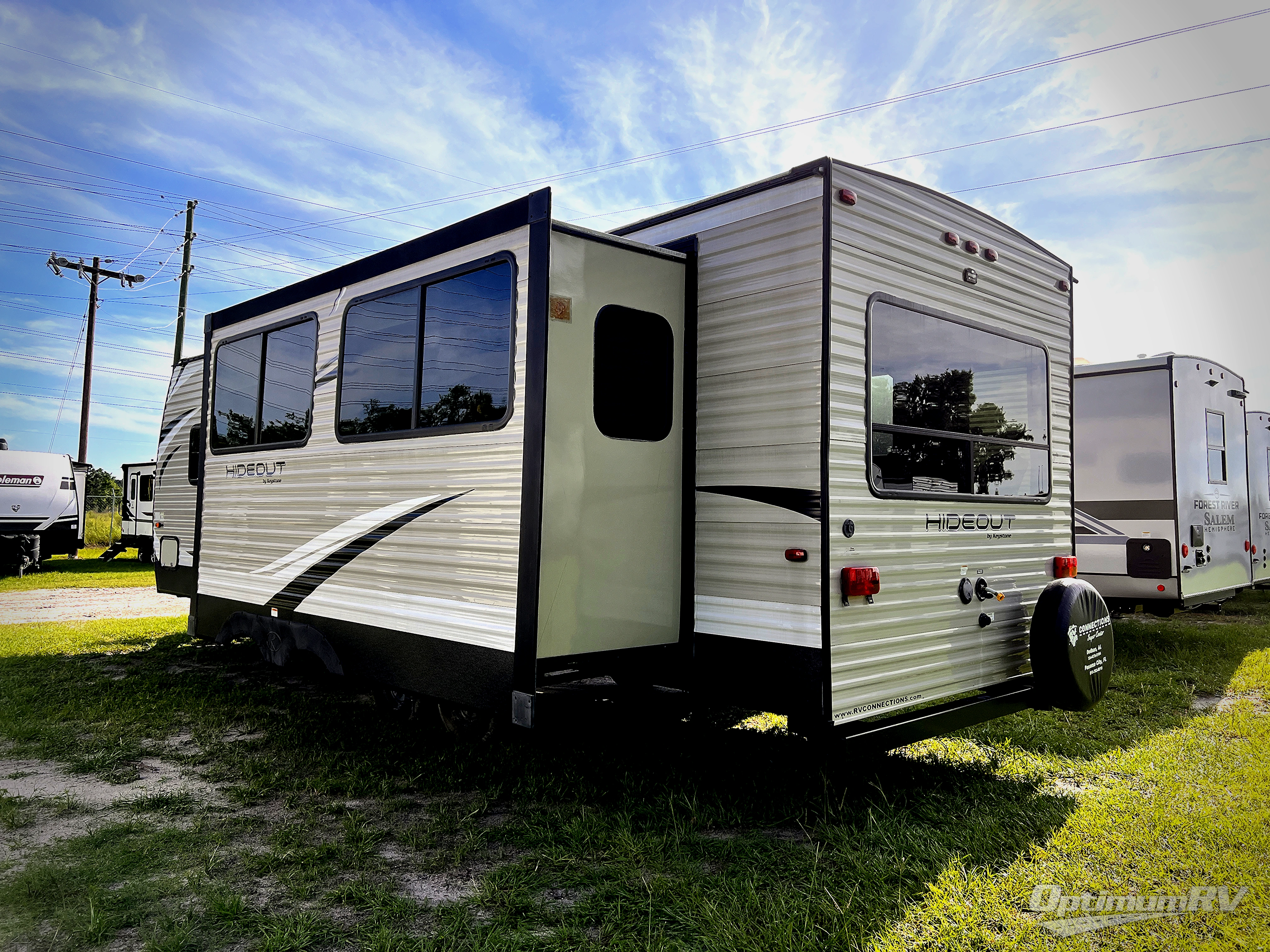 With features such as two entry doors, a spacious kitchen, a rear living area, and a single slide, it is easy to see why this Hideout is one of Keystone's most popular travel trailers. Come enjoy your meals at the U-shaped dinette and then plan to relax for the evening on the dual recliners in the rear living area. At night you can retreat to the private bedroom where you will find a queen-size bed and a separate entrance to the exterior. Outside there is a pass-through storage area for your outdoor camping gear and a lighted adjustable power awning to protect you as you visit with your family and friends.
