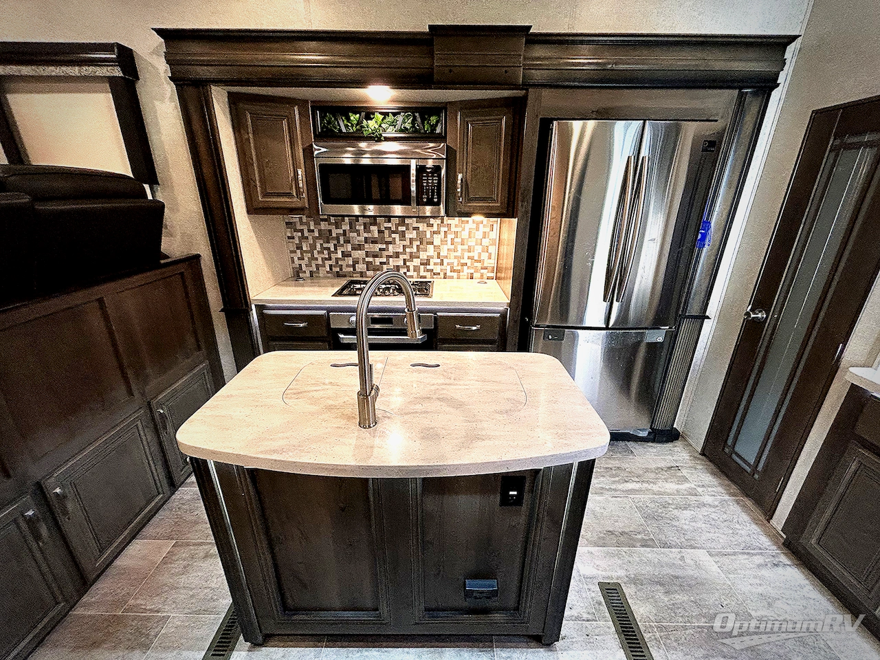 If you want your own space to cook, your own space to watch TV, and your own private bedroom, take a look at this Montana fifth wheel. This layout offers a rear living and entertaining room with plenty of seating including dual hide-a-bed sofas and theater seats with power recliners. Imagine everyone gathered around the HDTV and fireplace to talk about their day, watch a movie, or relax for a while in the warm indoors. The kitchen offers a separate space to make and eat meals. You will find a center island, an 18 cu. ft. residential refrigerator, a convection microwave, and a pantry, plus more. There is inside storage throughout for your clothes, camping gear, and kitchen cookware. And outside there is exterior compartments including a slide out storage tray.