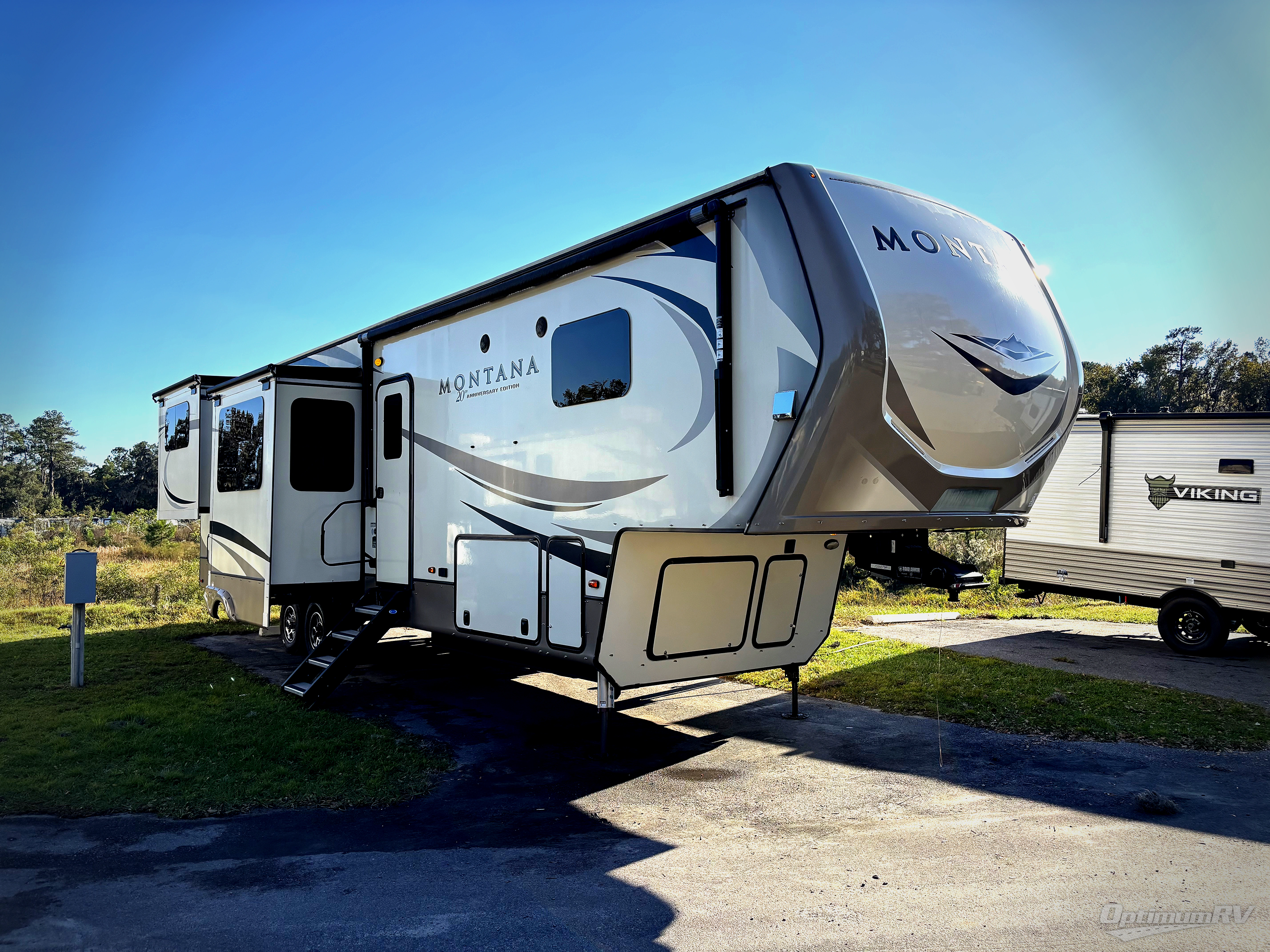 When packing for your next trip in a Keystone Montana luxury fifth wheel you will appreciate the enormous drop frame pass-through storage compartment, the MORyde "Step Above" entry steps with strut assist, and the LED light package including "super-bright" taillights with backup marker and off-door scare light. The Montana 20th Anniversary Edition adds exclusive features such as the Key TV satellite prep, LED accent lighting, Tru-fit slide construction, and Easy Sweep resilient flooring. You will love the in-floor heating ducts, which allow for more airflow to be distributed evenly for optimal comfort. the LED motion sensor light in the pass-through compartment and convenience center, plus the Four Season Living package allowing you to travel whenever you like. It's time to find the luxury fifth wheel you can enjoy for years to come, choose a Montana by Keystone today!
