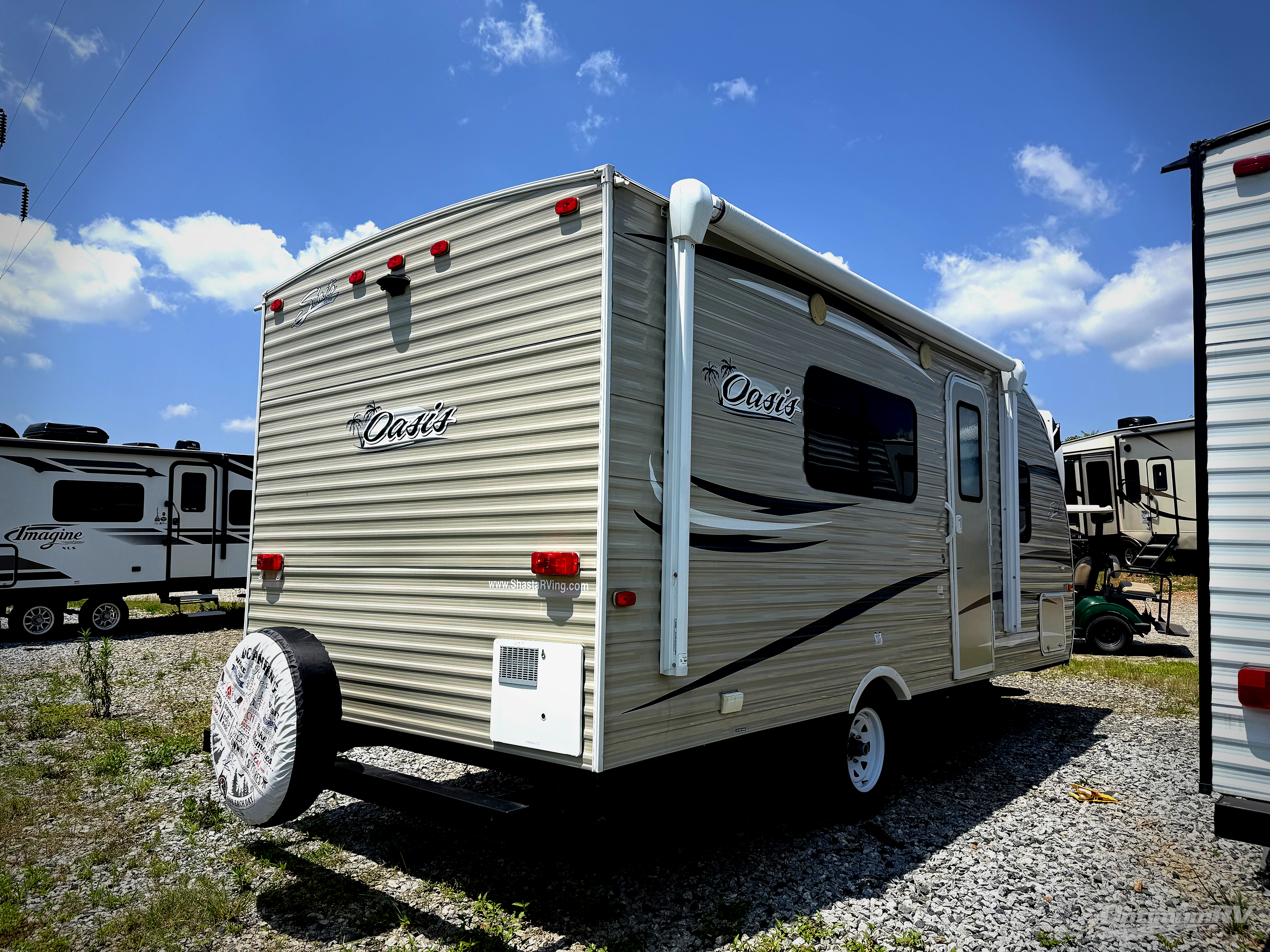 Let this Shasta travel trailer be your very own home on wheels! With a front bedroom area that has an RV queen bed with two wardrobes on either side and an overhead shelf, you will not only sleep peacefully each night, but you will also enjoy having a place to store your alarm clock, cup of water, and glasses while you sleep. The rear bathroom is especially handy because it adds extra privacy for you to get ready each morning, and the linen closet will easily store all of your towels and washcloths for the duration of your trip.