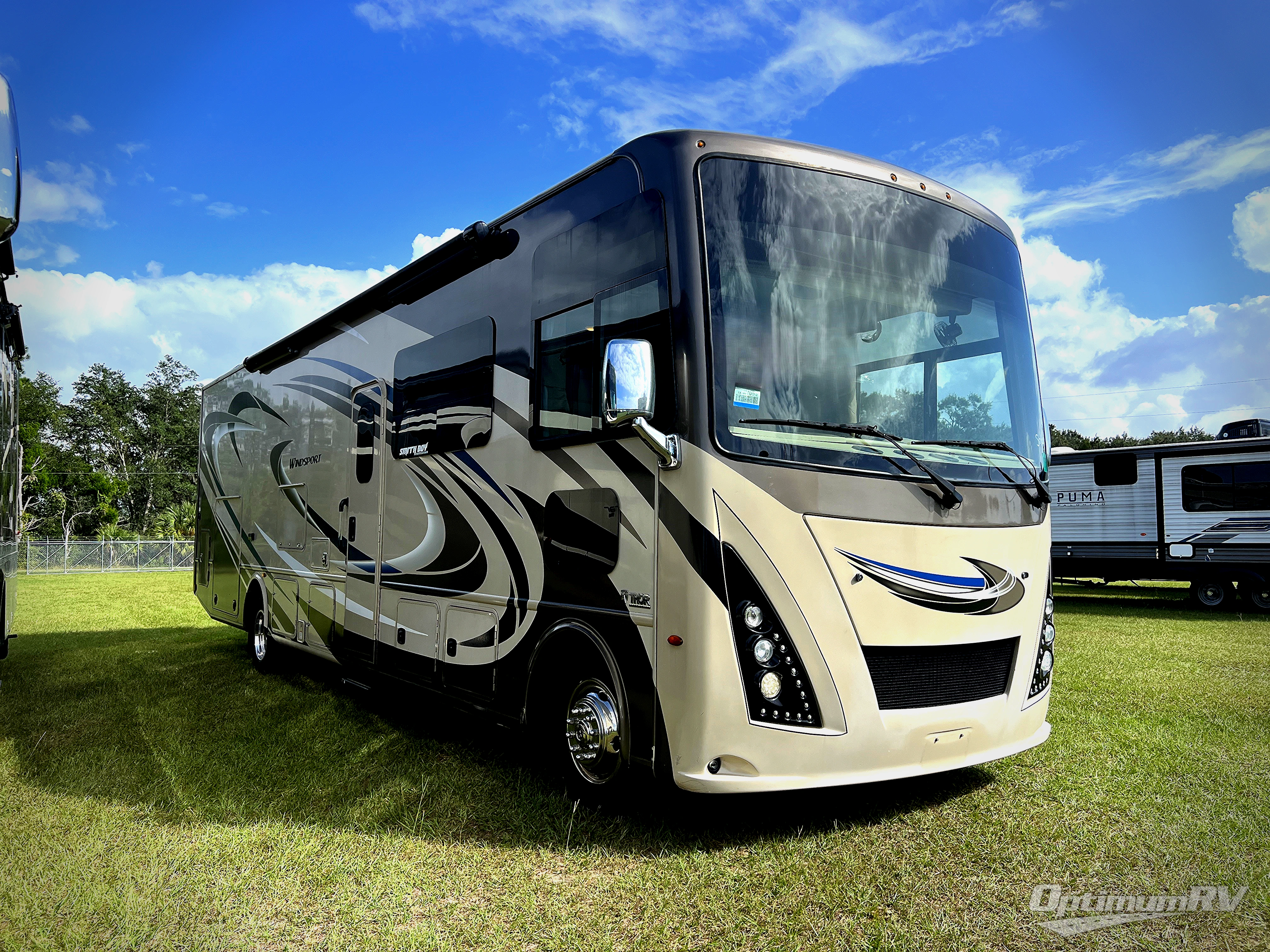 You will find there is much to love about the Windsport class A gas coaches, whether you are out for a long road trip across the country, or a weekend reunion with family. All Windsport models feature Leatherette furniture, solid surface kitchen countertops, and raised panel upper cabinet doors with nickel finish hardware and glass inserts on select doors. With the swivel and reclining captain's chairs featured in these coaches, you can easily bring them into the conversation area in the living space once parked. Each unit includes a dash workstation with 110-volt and 12-volt outlets at the passenger side for those who need to take work with them on the road, or for those who just enjoy surfing the internet. On the outside, enjoy Robocast storage compartments, an outdoor shower, and a legless lateral power awning with integrated LED lighting. Make any Windsport class A gas coach by Thor Motor Coach your new home-away-from-home today!